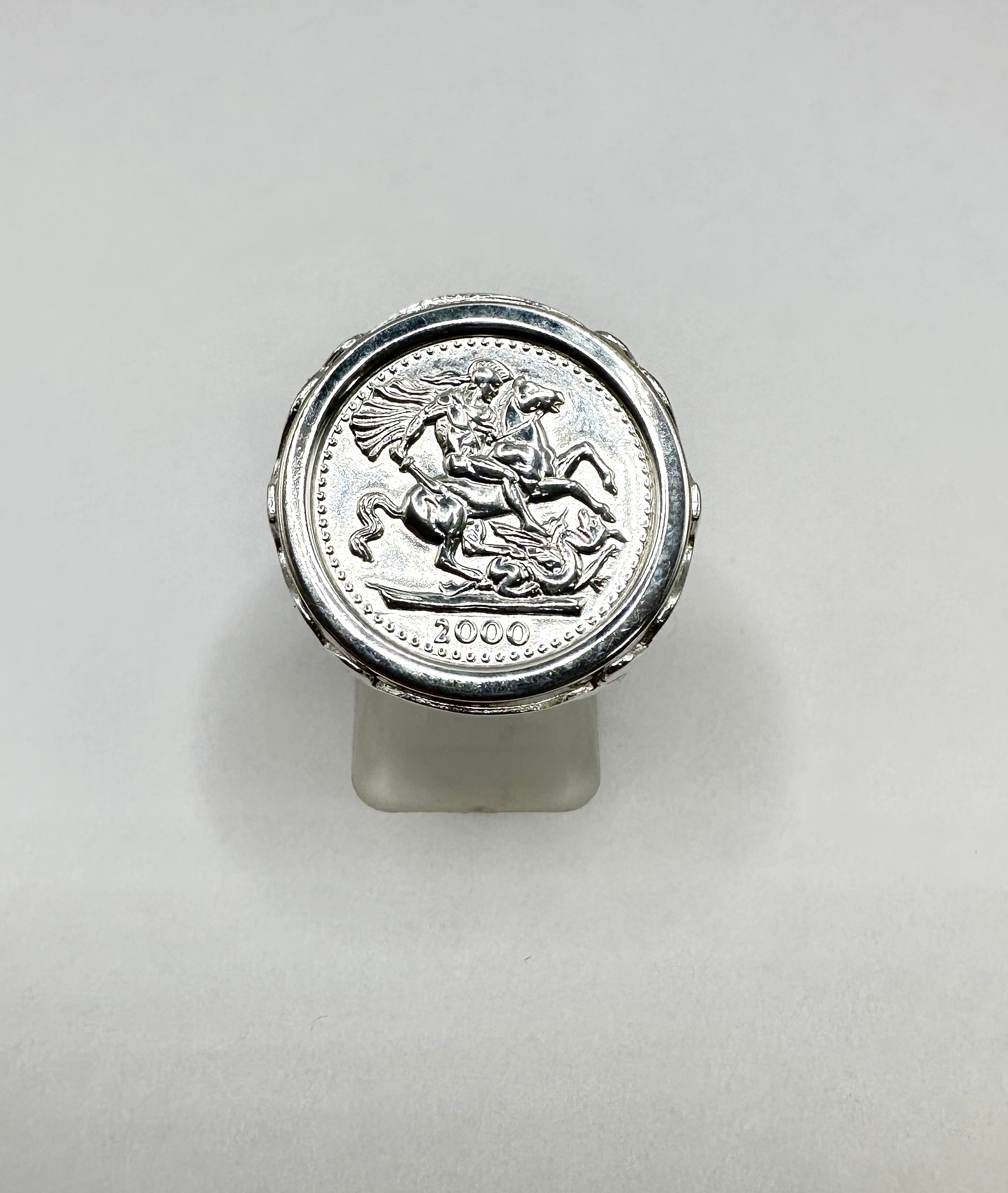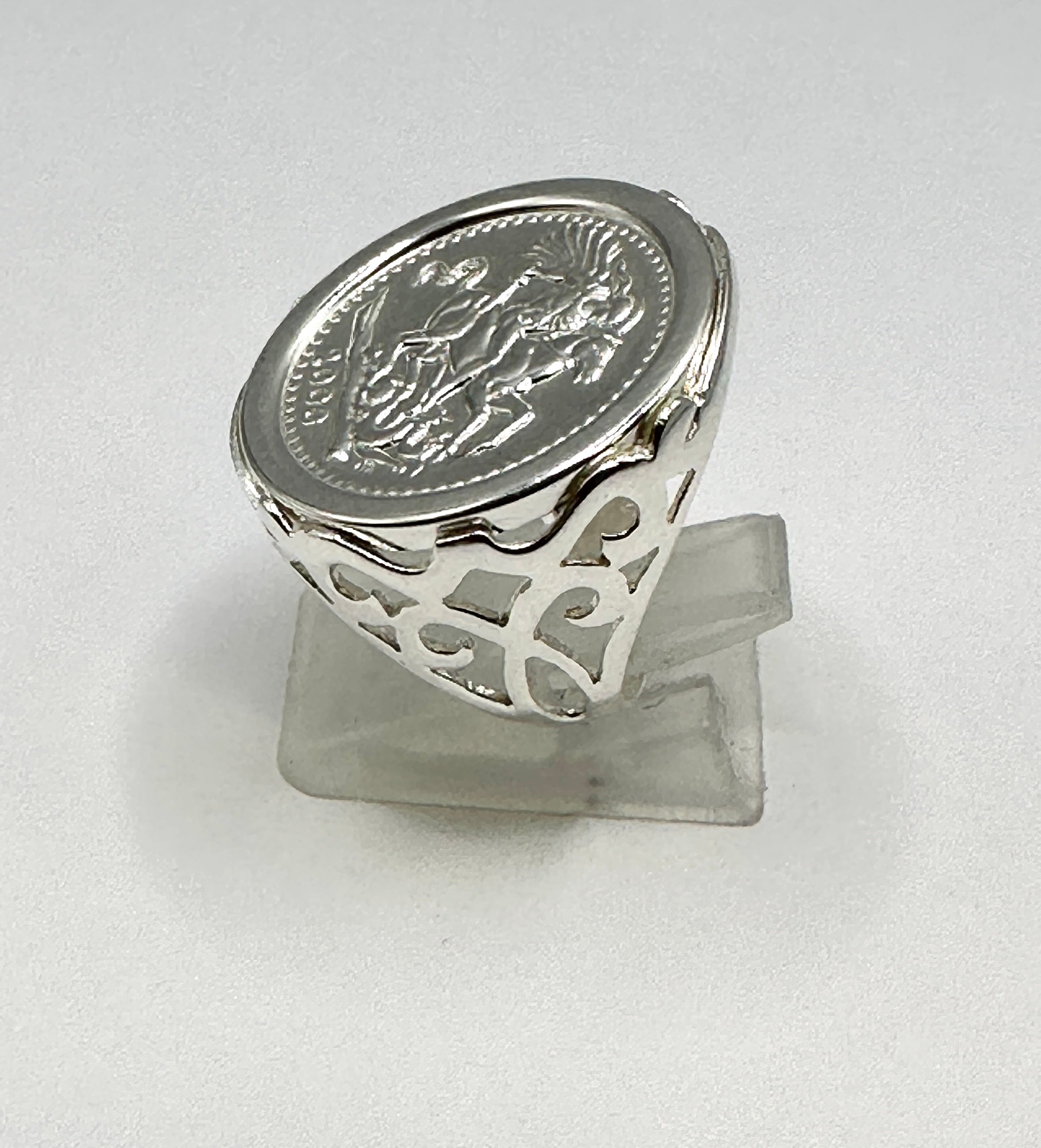 A sterling silver St George sovereign signet ring, featuring a central circular disc depicting St. George slaying the dragon, with the year ‘2000’ visible beneath the figures. The ring’s band exhibits an openwork, stylized scroll or filigree design.