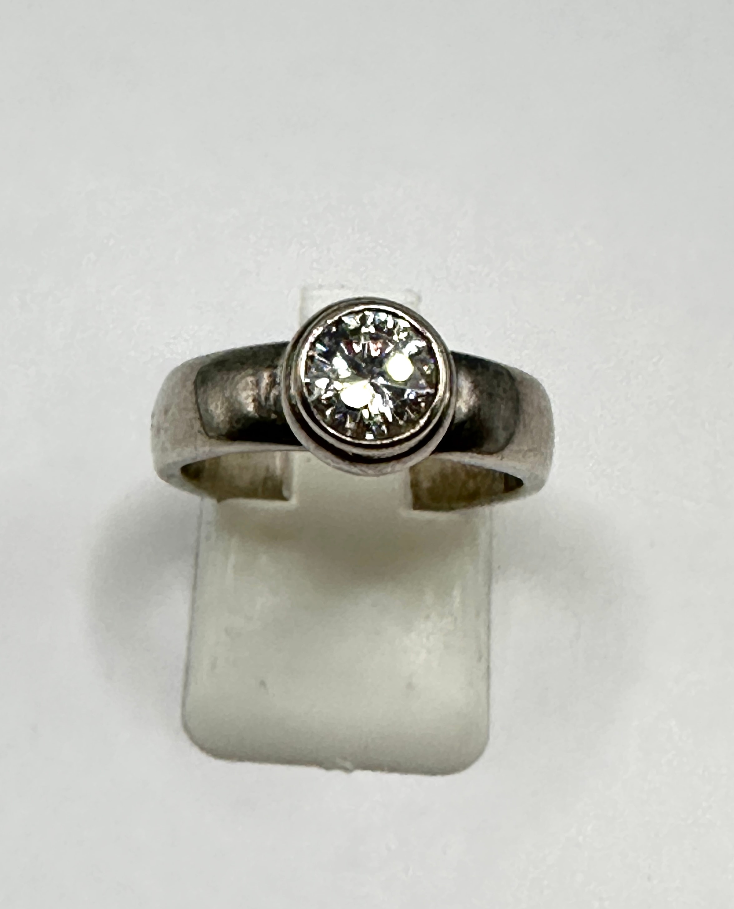 A 925 Silver ring witha smooth bezel setting. The plain, polished band is of a classic design. No discernible hallmarks or maker’s marks are present.