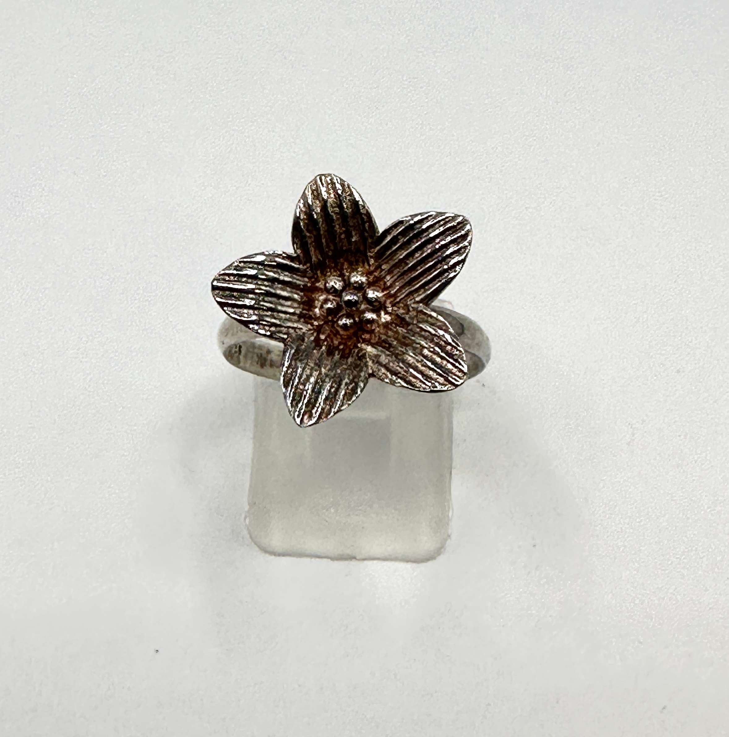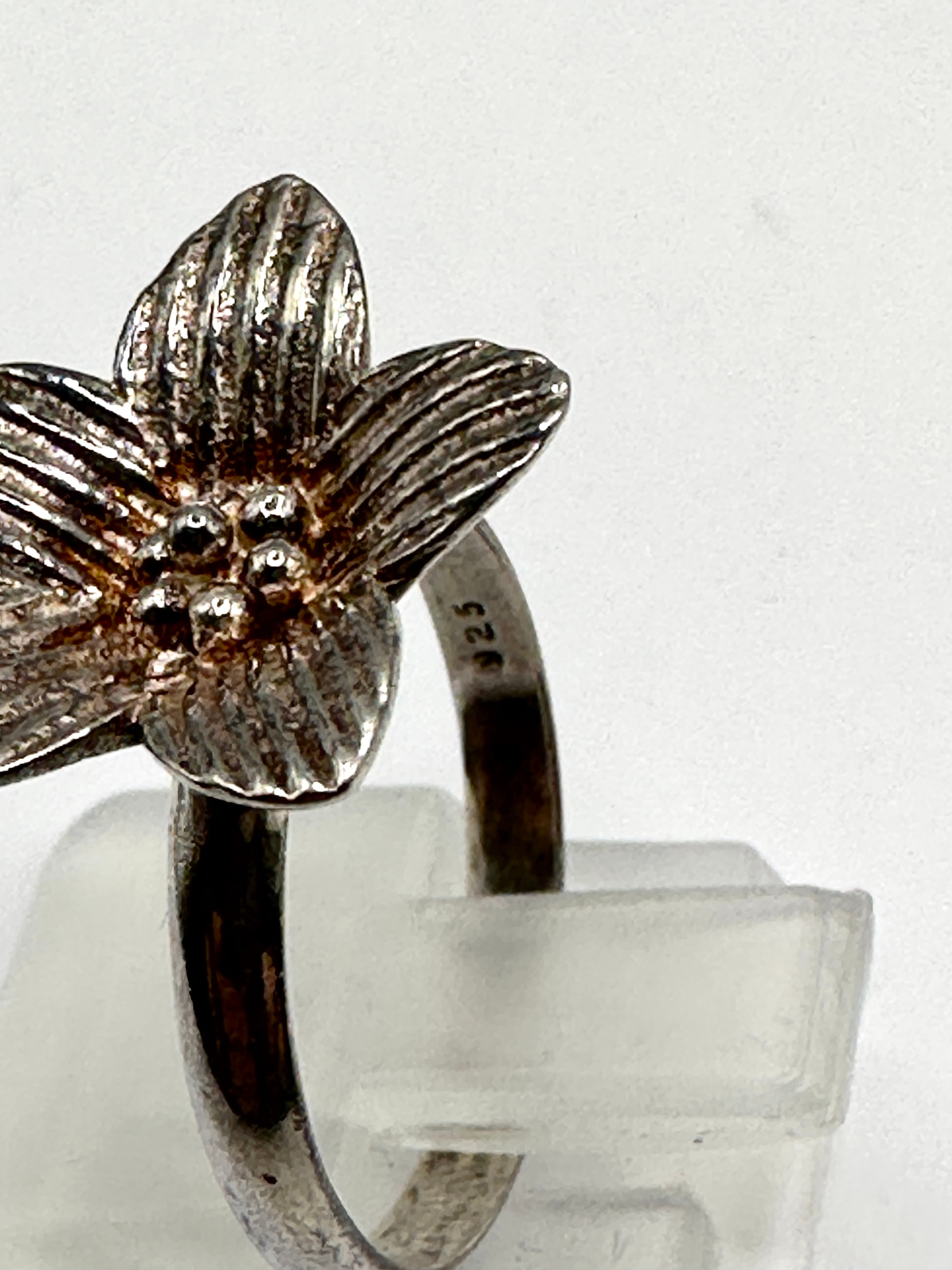 A sterling silver ring featuring a prominent three-dimensional five-petal floral design. Each petal displays a ribbed texture, and the flower’s center is adorned with small, spherical protuberances. The interior of the ring band is clearly stamped with “925”, confirming its 925 silver composition.
