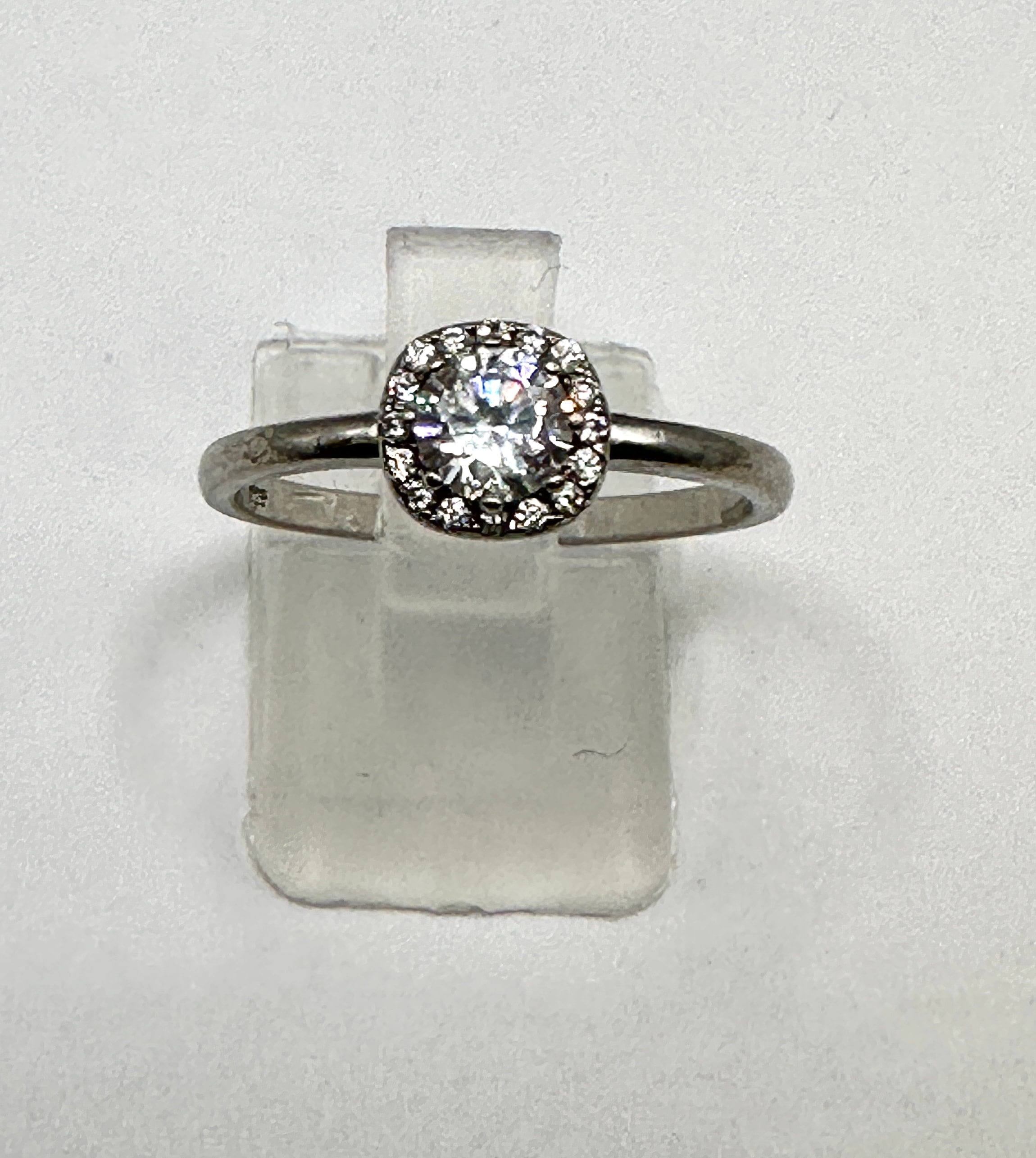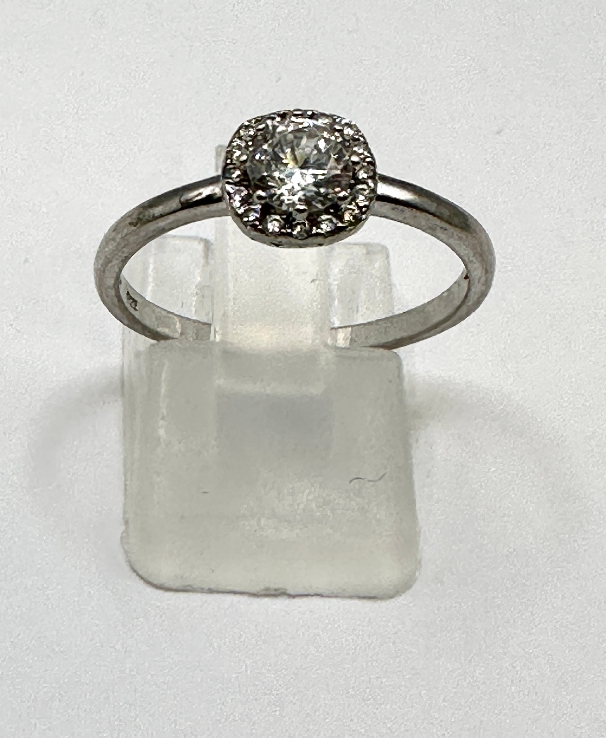 A CZ Stone Halo Ring, surrounded by a halo of smaller CZ stones, all set in a cushion-shaped halo on a slender, plain band. The ring is crafted from 925 silver, as indicated by the visible ‘925’ hallmark on the interior of the band.