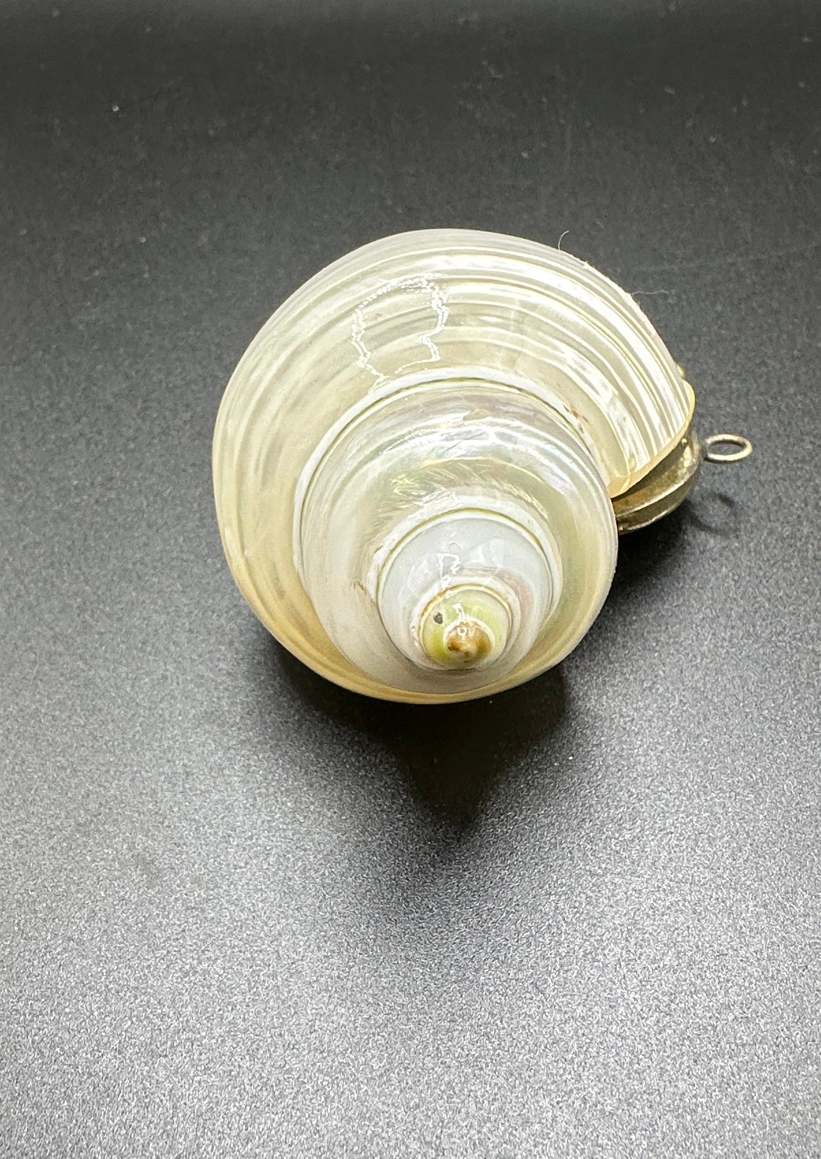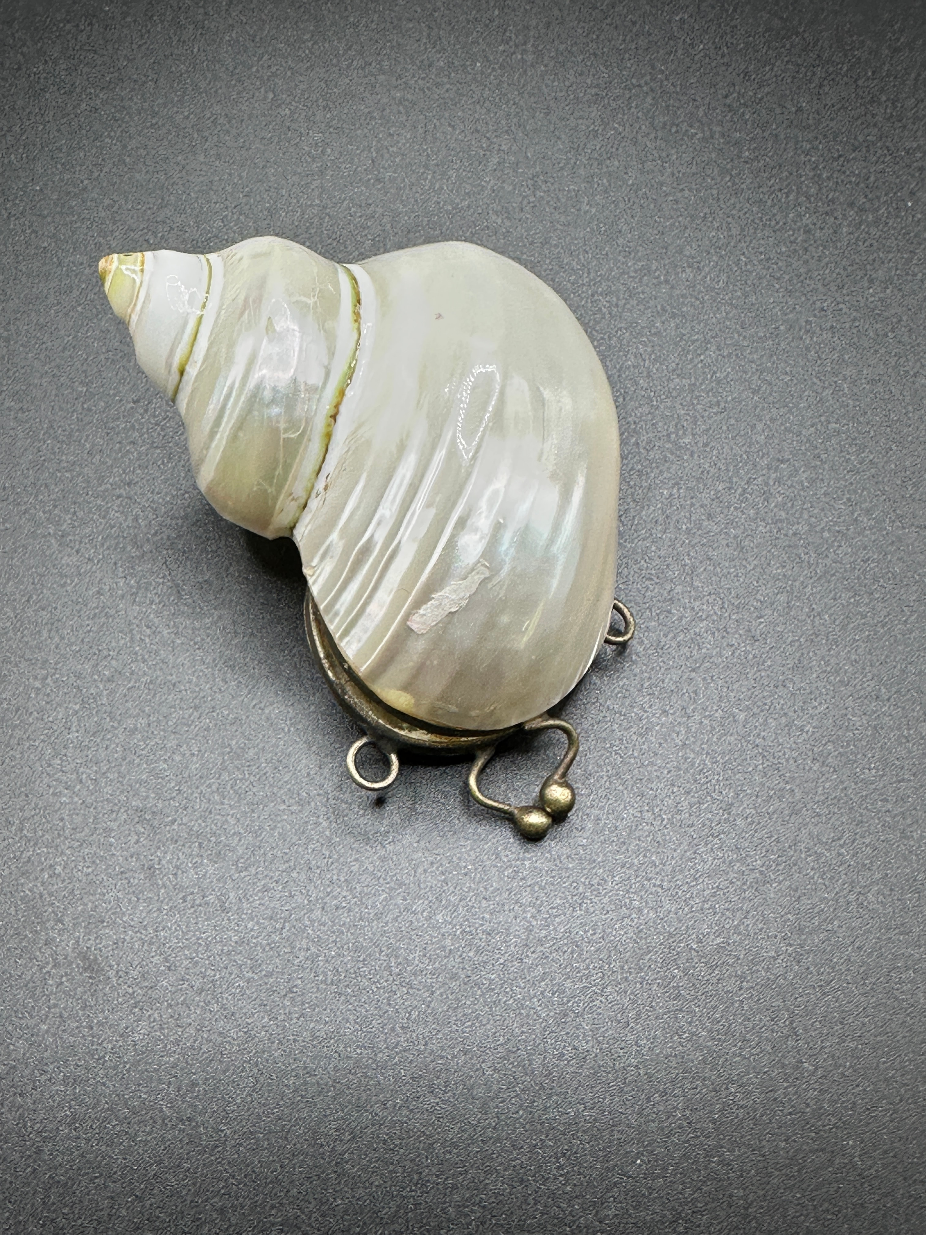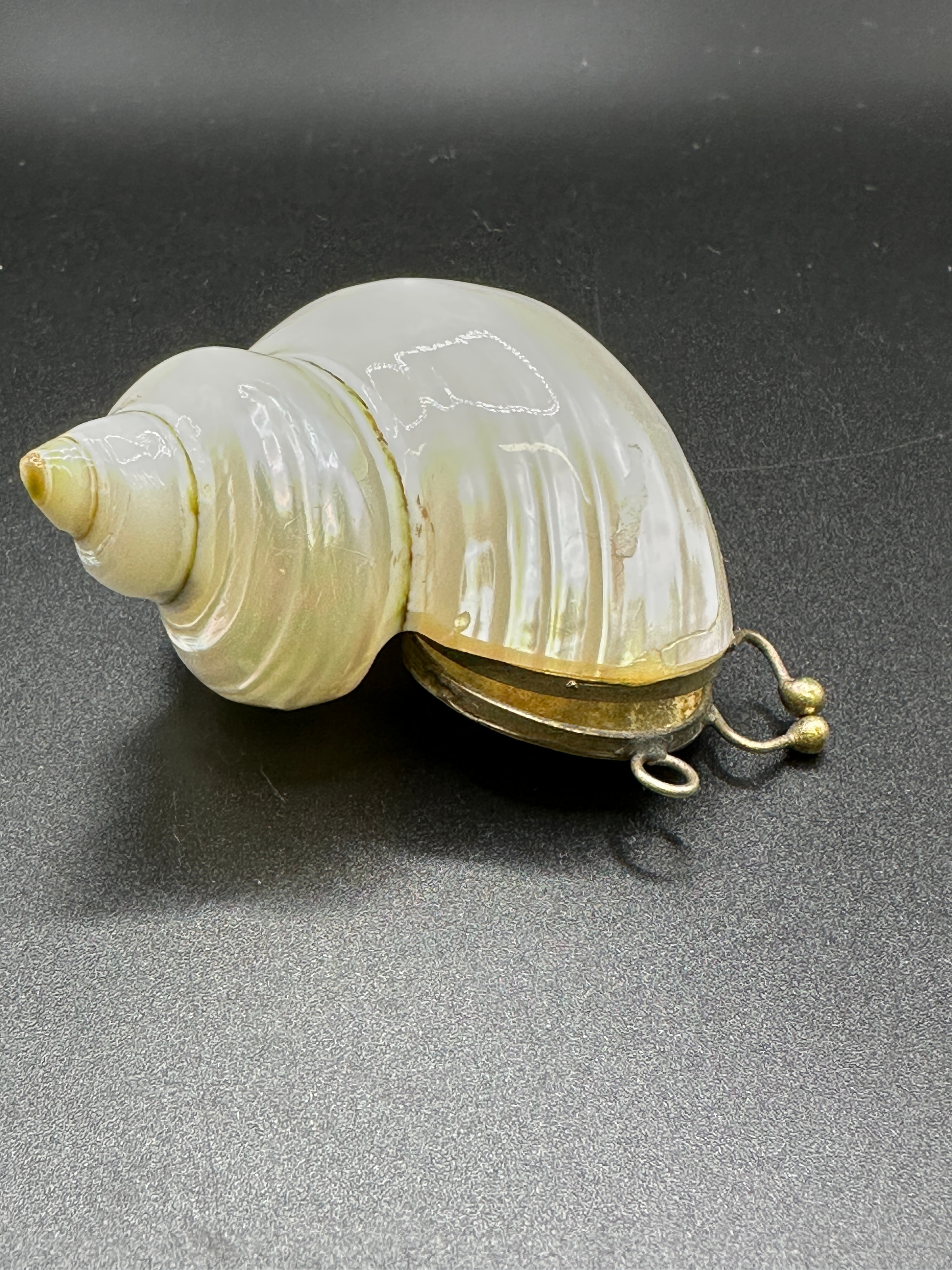 A metal-mounted pearlized Turbo seashell container, possibly functioning as a snuff mull. Crafted from a large, spiraled natural seashell, exhibiting a pearlescent luster with iridescent white, green, and pink hues. The shell is fitted with a hinged metal lid at its aperture, which opens to reveal a shallow metal-lined interior. Four curved metal legs, each terminating in a small ball finial, extend from the metal fitting, allowing the object to stand. There are no visible text or maker’s marks.