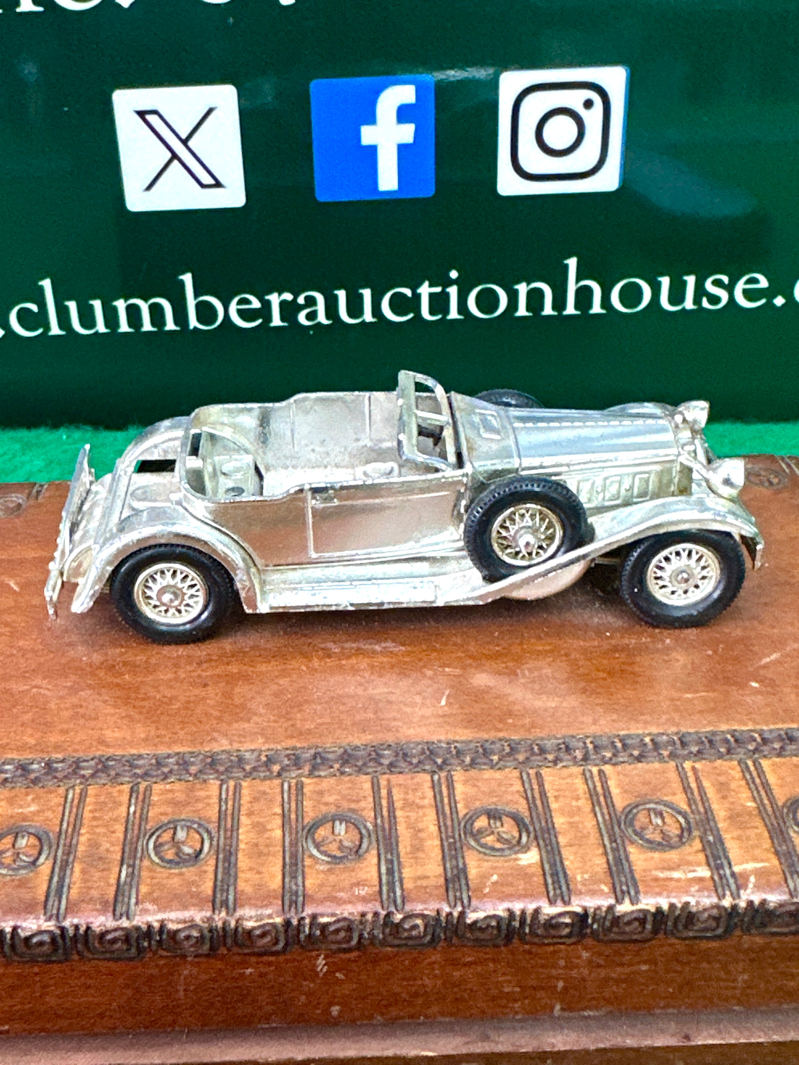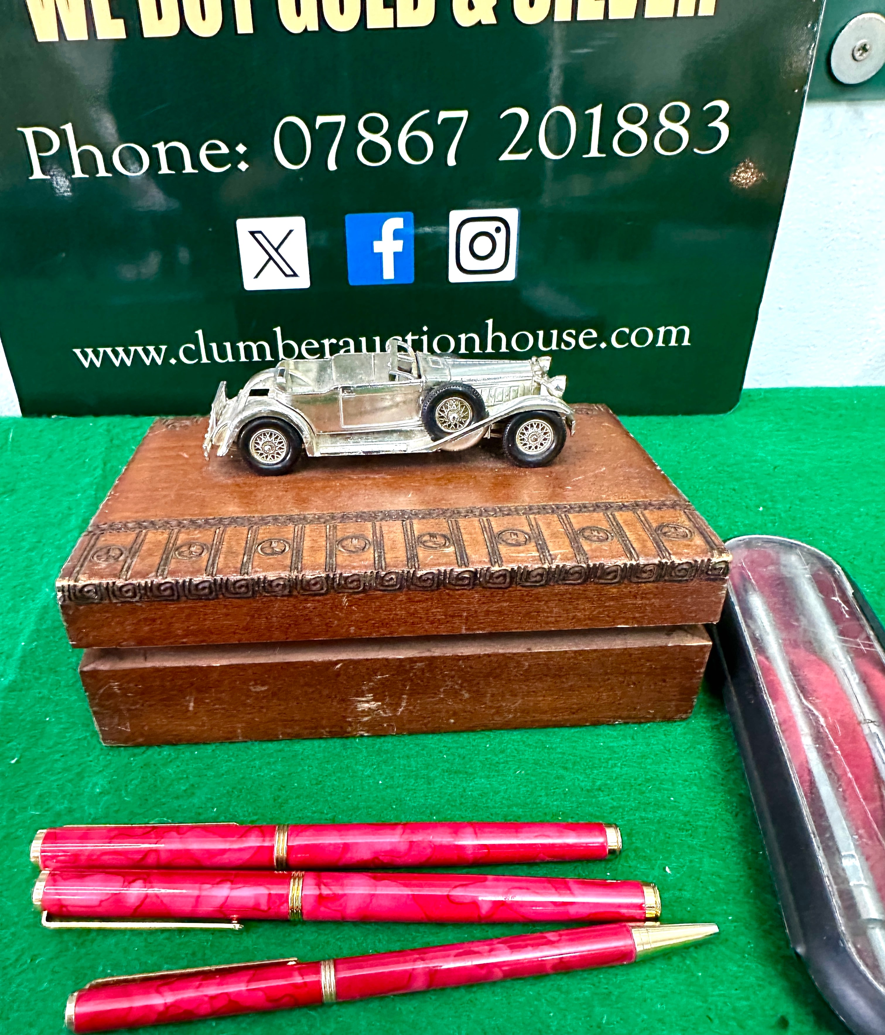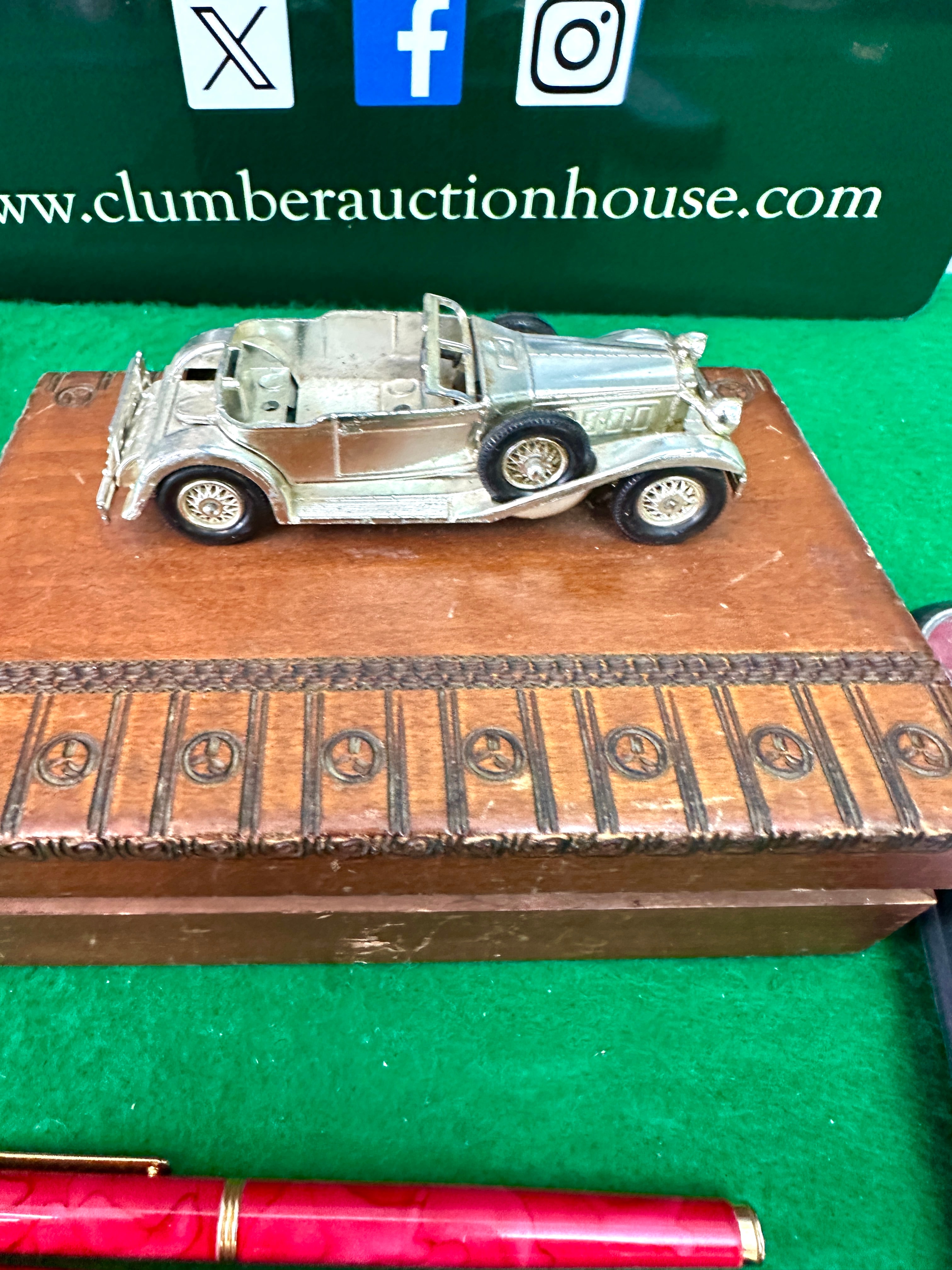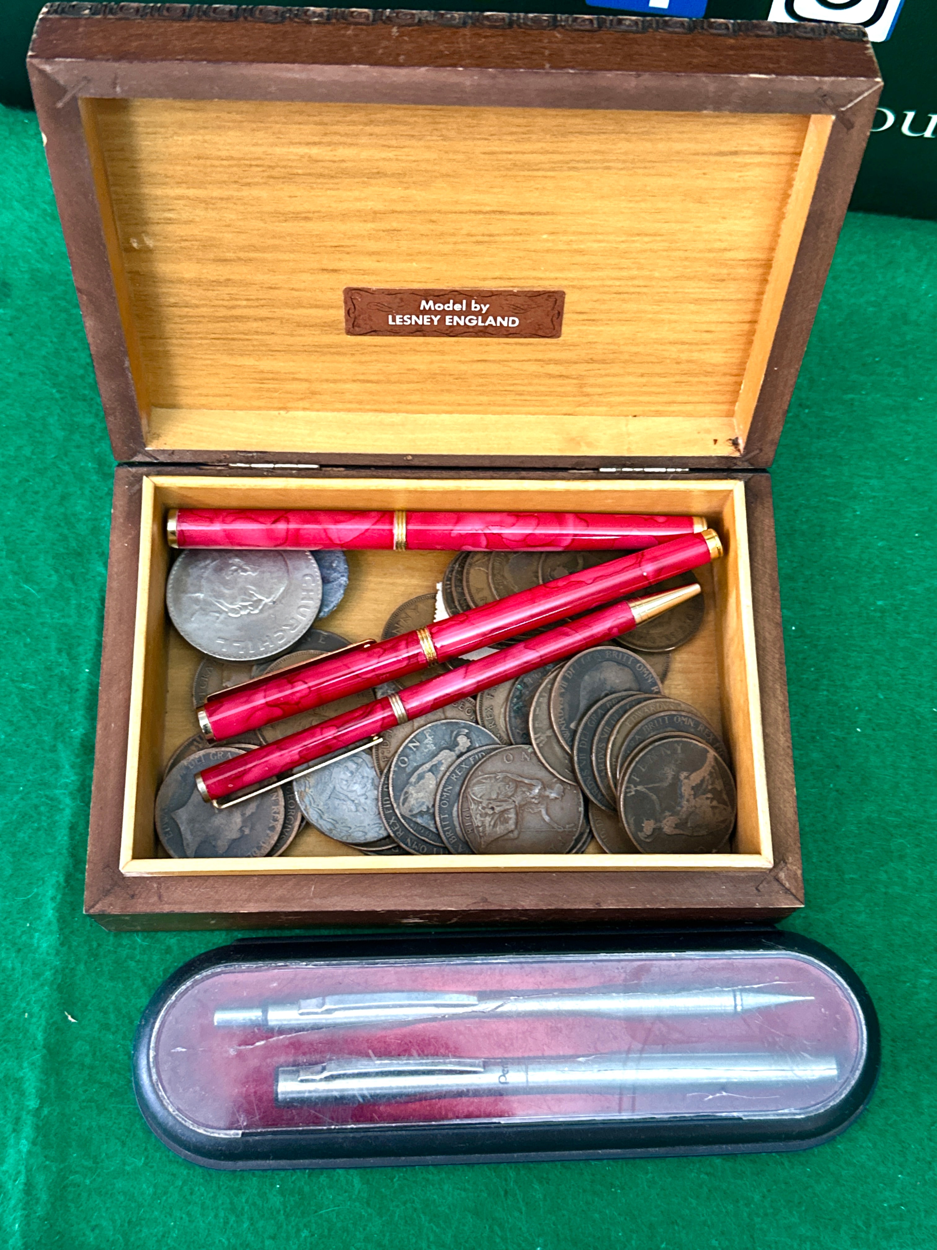 The lot comprises a vintage wooden box with a carved border on its lid, featuring an interior label reading “Model by LESNEY ENGLAND”. The box contains a collection of numerous circulated British imperial coins, predominantly bronze/copper issues from the reigns of Edward VII and George V, identifiable by inscriptions such as “EDWARDVS DEI GRA BRITT OMN REX FID DEF IND IMP” and “GEORGIVS V DEI GRA BRITT OMN REX FID DEF IND IMP”. Also present are a few dissimilar silver-colored tokens or coins and a red postage stamp. Accompanying these items are three red marbled writing instruments with gold-tone accents, a cased set of two silver-toned writing instruments, and a silver-colored die-cast model of a vintage open-top automobile, identified as a Lesney product.