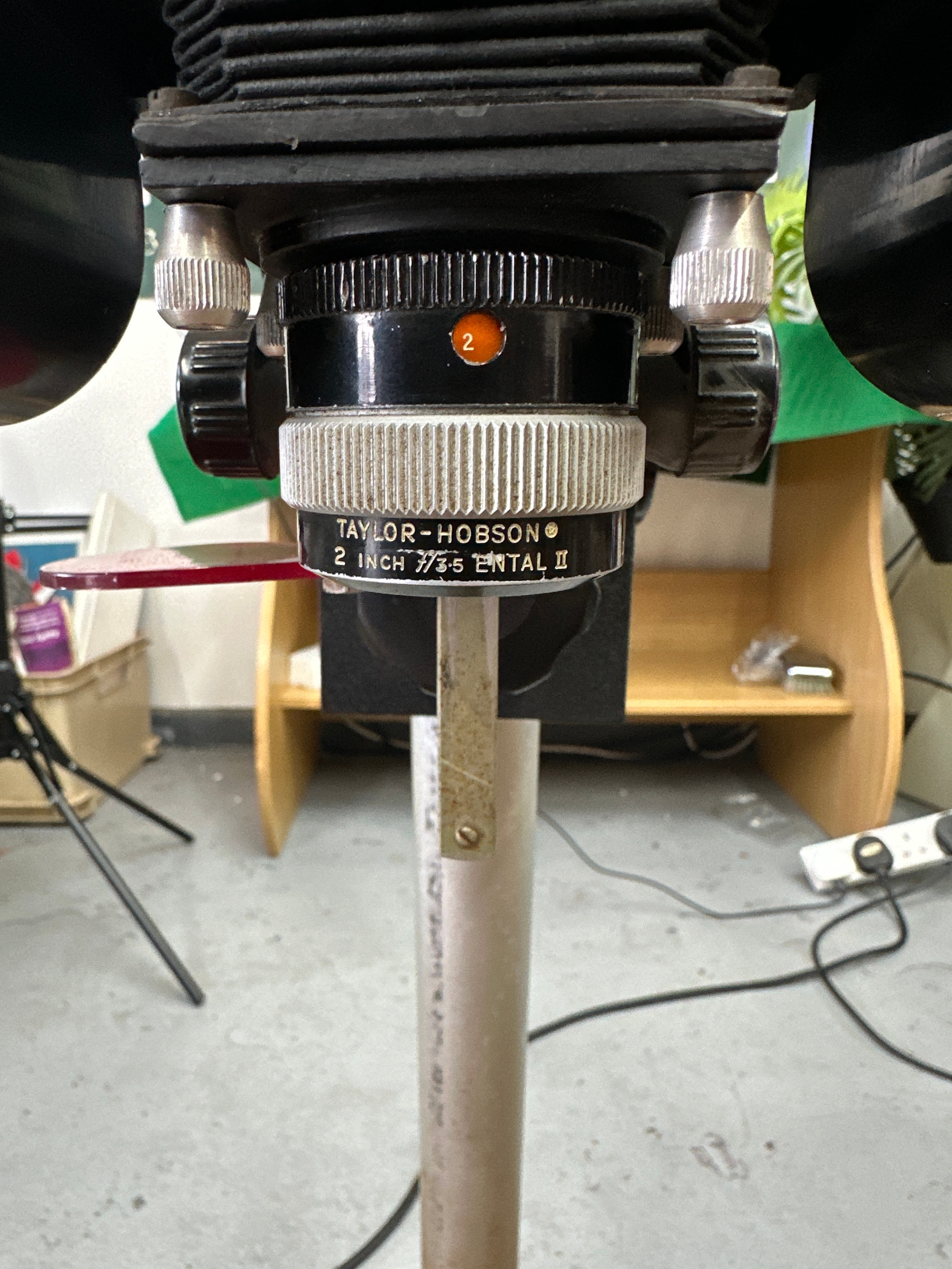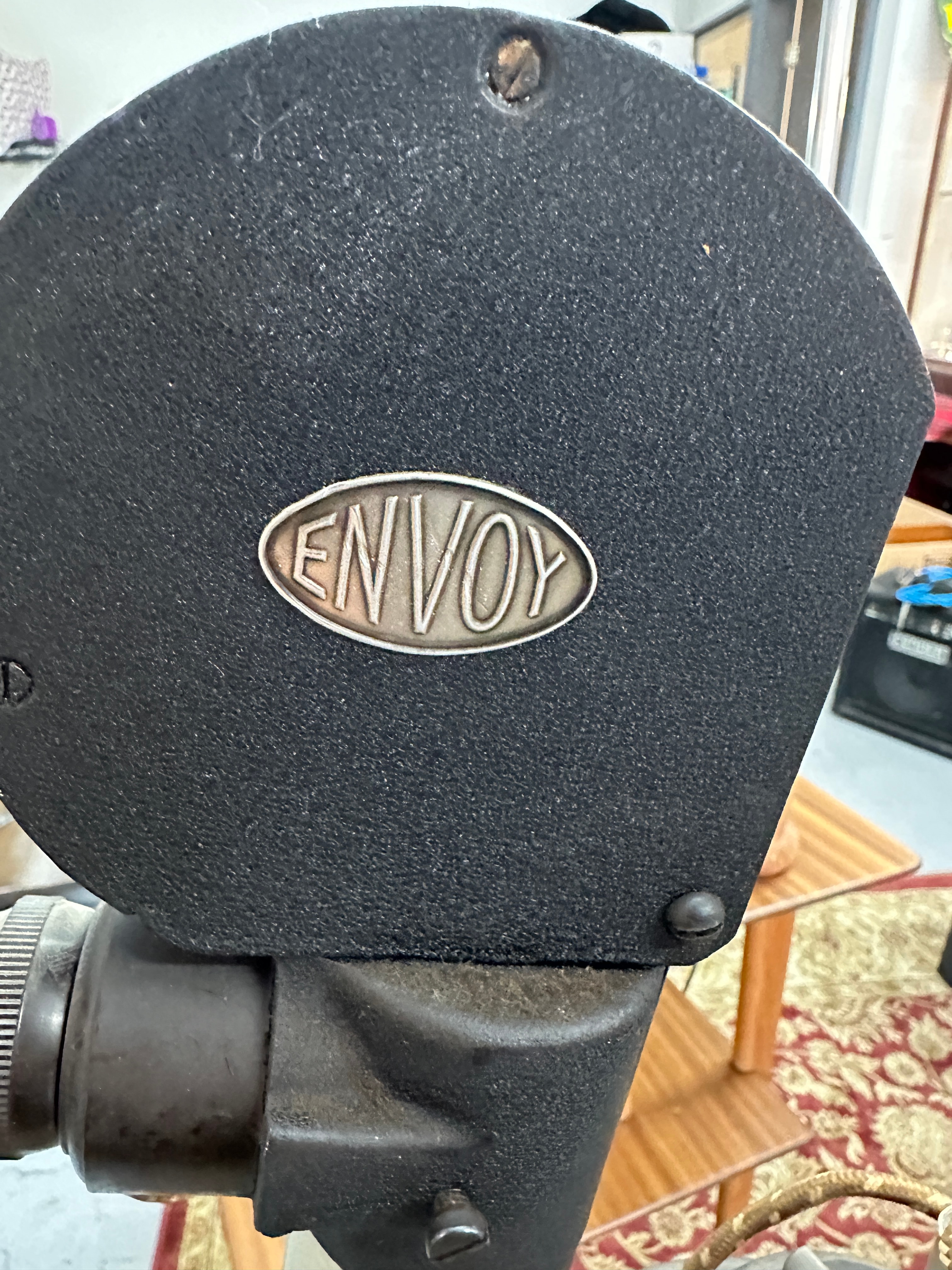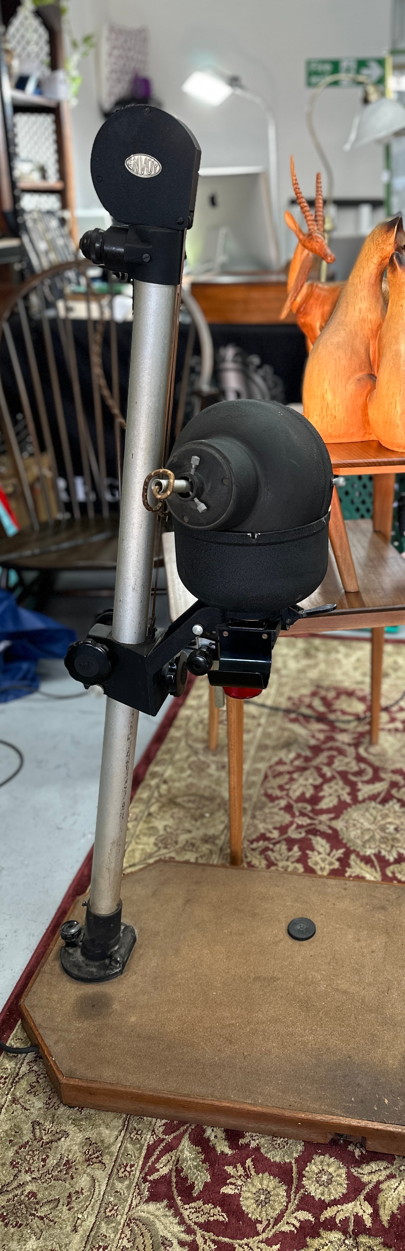 A vintage ENVOY photographic enlarger, likely dating to the mid-20th century. The enlarger features a substantial wooden base supporting a tall, vertical metallic column. A black textured enlarger head, bearing an embossed oval plate marked ‘ENVOY’, is vertically adjustable along this column. The head unit houses a light source with an illuminated bulb and a bellows-equipped lens assembly. The lens is distinctly marked ‘TAYLOR-HOBSON 2 INCH F/3.5 ENTAL II’. A red filter is visible beneath the lens. A small metal plate affixed to the wooden base displays the number ‘9480’. The item is constructed primarily from metal and wood.