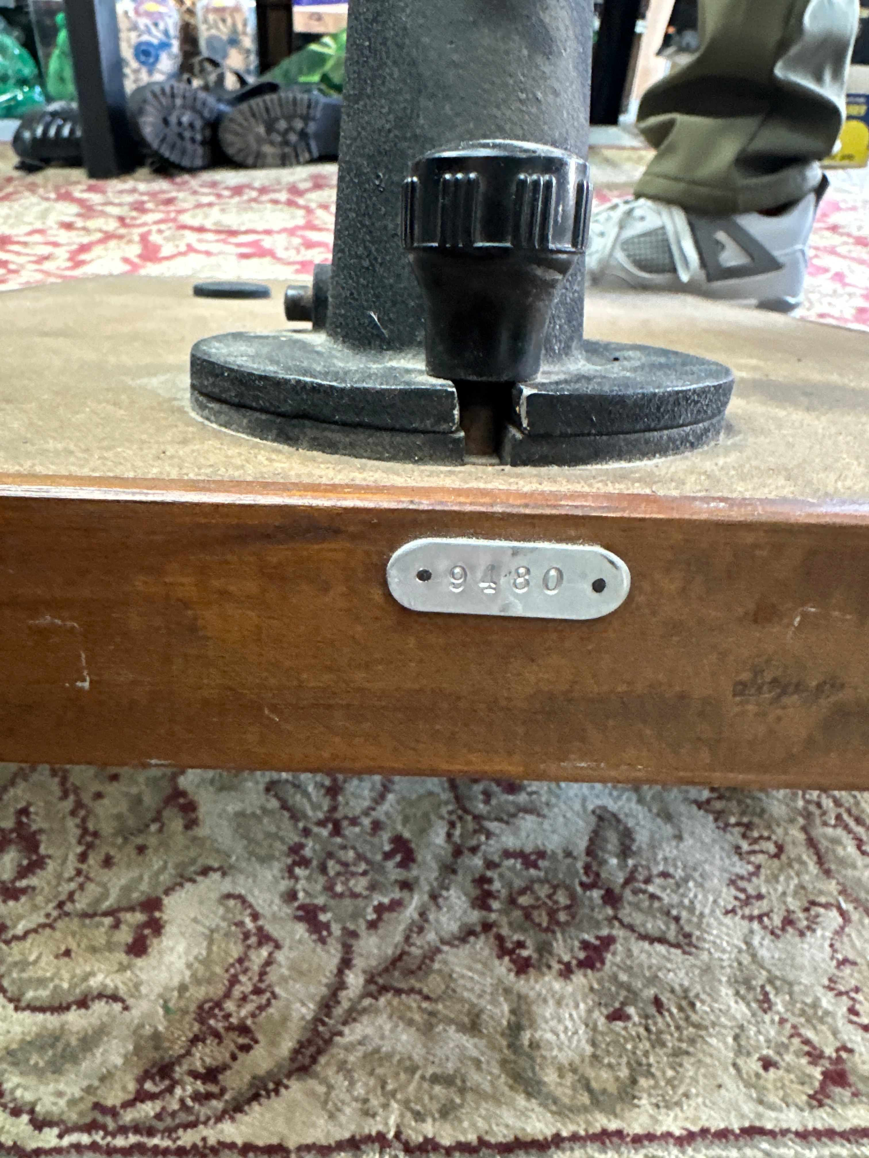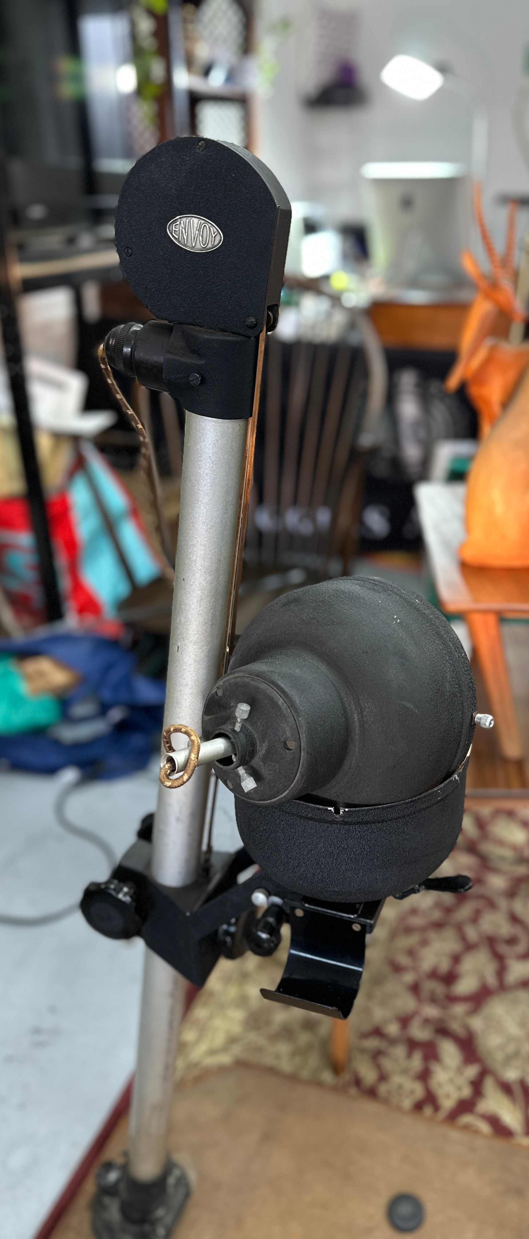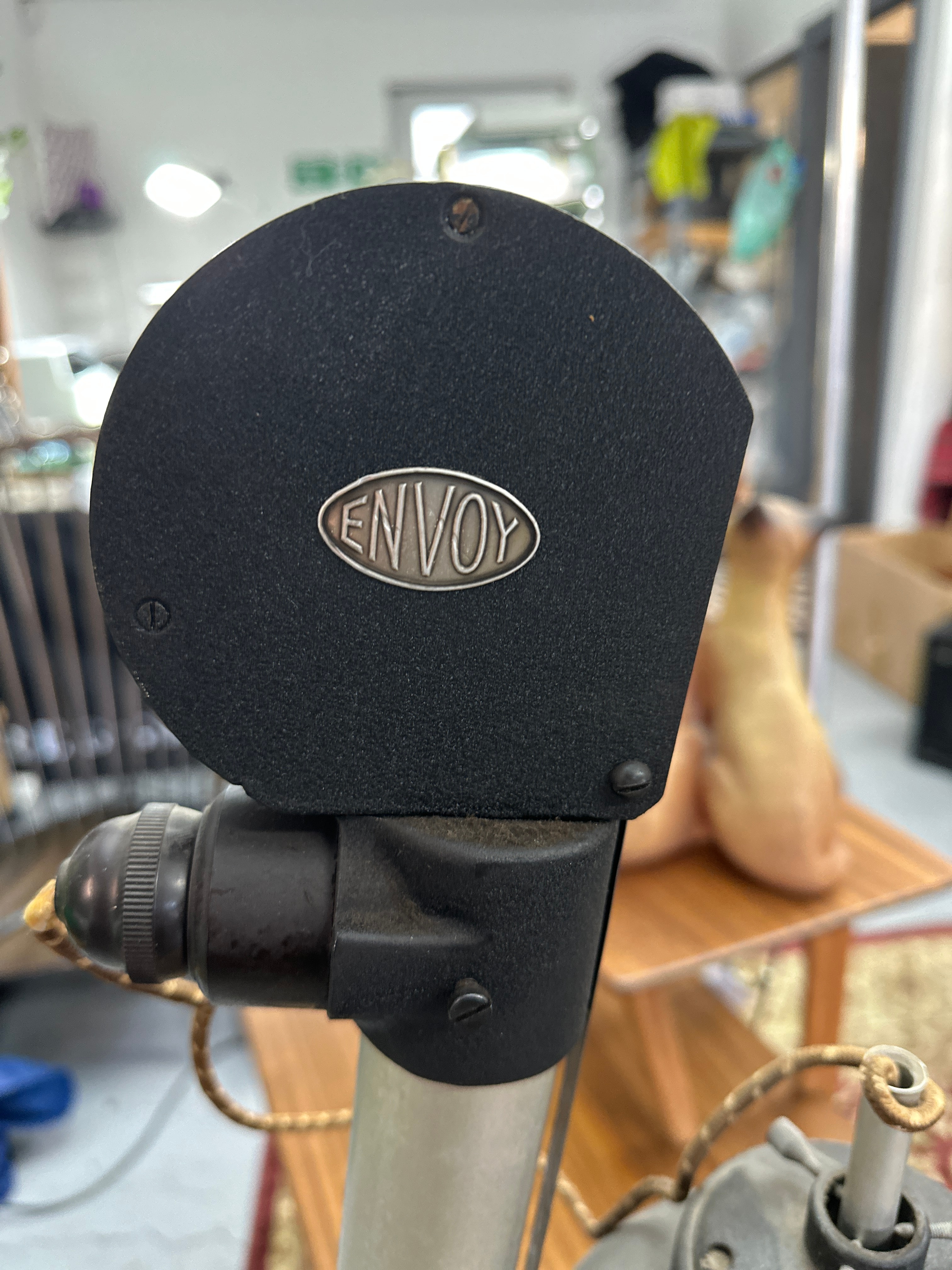 A vintage ENVOY photographic enlarger, likely dating to the mid-20th century. The enlarger features a substantial wooden base supporting a tall, vertical metallic column. A black textured enlarger head, bearing an embossed oval plate marked ‘ENVOY’, is vertically adjustable along this column. The head unit houses a light source with an illuminated bulb and a bellows-equipped lens assembly. The lens is distinctly marked ‘TAYLOR-HOBSON 2 INCH F/3.5 ENTAL II’. A red filter is visible beneath the lens. A small metal plate affixed to the wooden base displays the number ‘9480’. The item is constructed primarily from metal and wood.