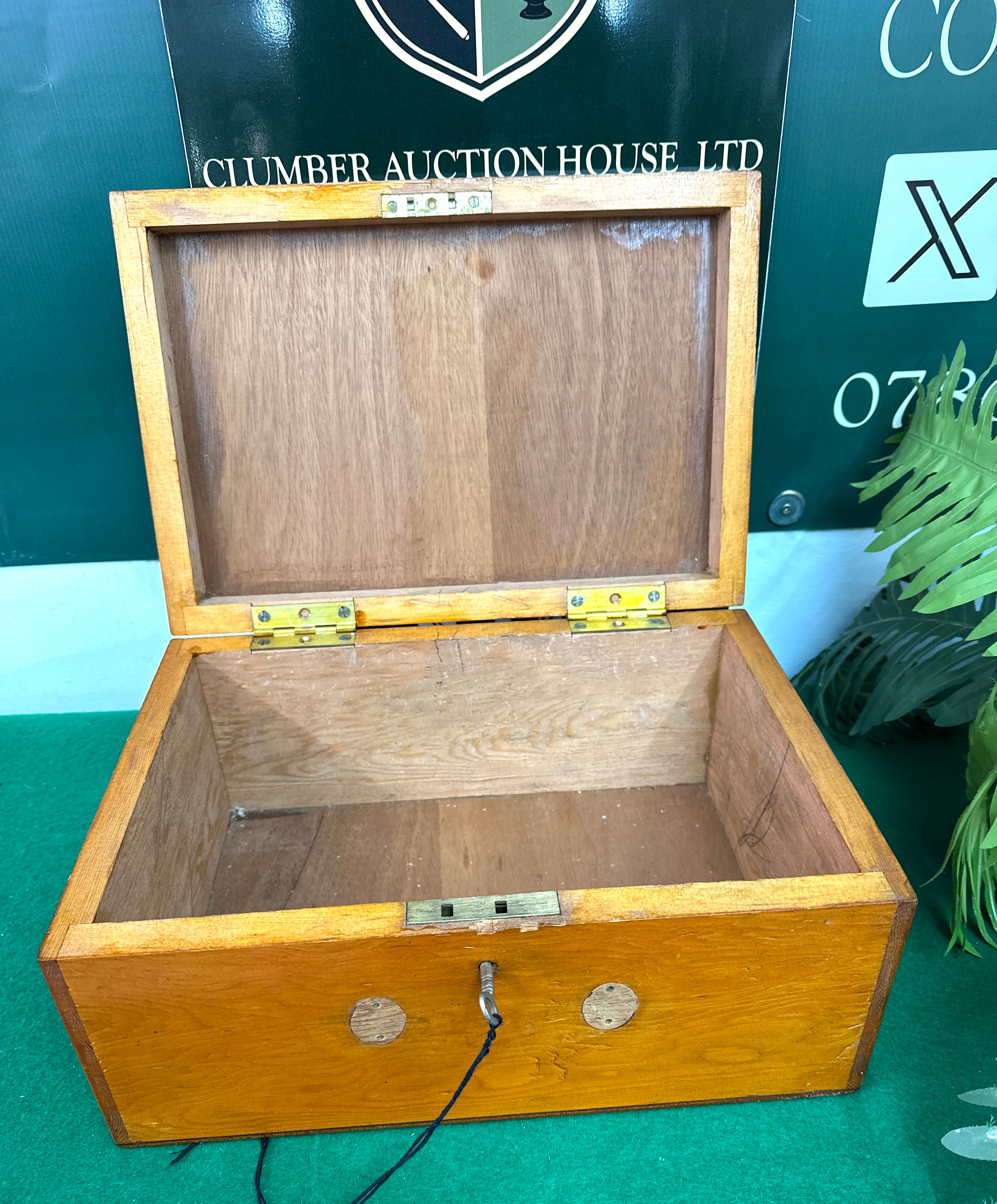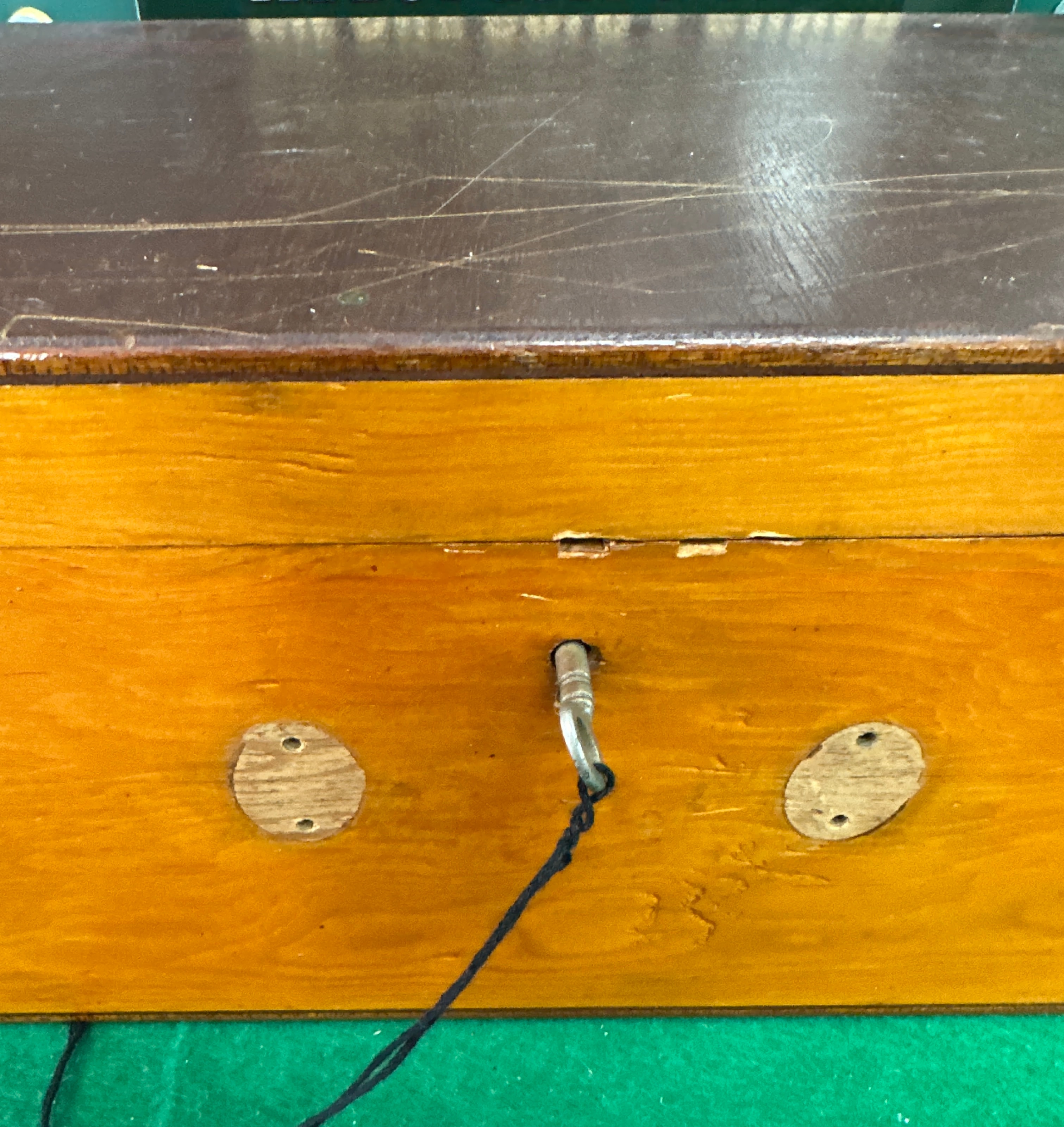 A rectangular wooden box with a hinged lid, constructed from a light-colored wood. It features a simple metal lock with an attached key. The box exhibits a varied finish, with a darker top surface and lighter, possibly varnished, sides. Two circular wooden escutcheons flank the keyhole on the front panel. This type of box was commonly used for storing tools or instruments.