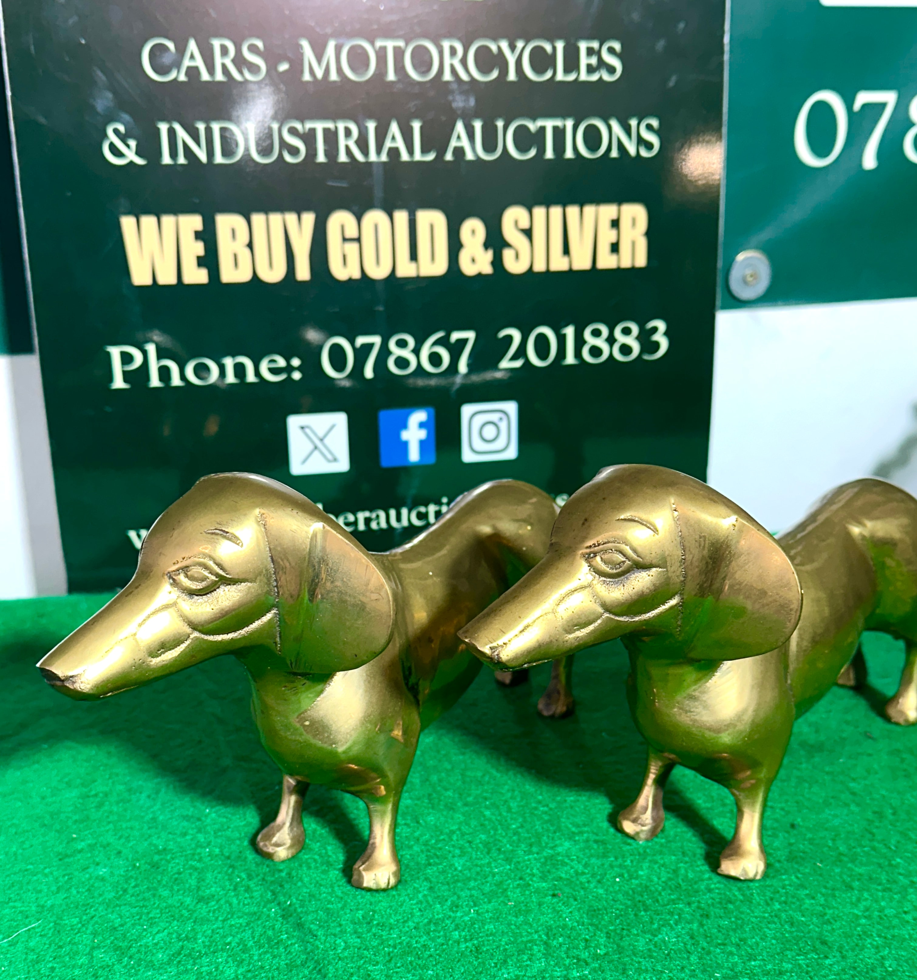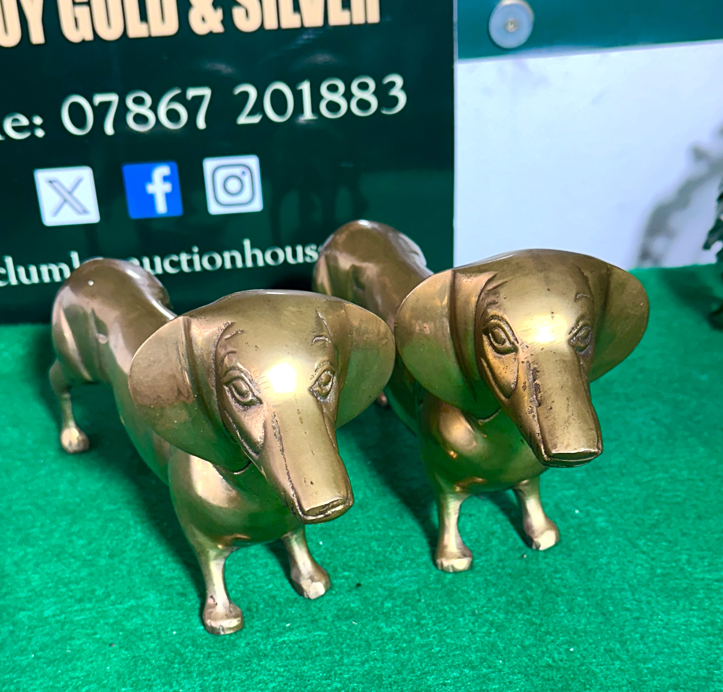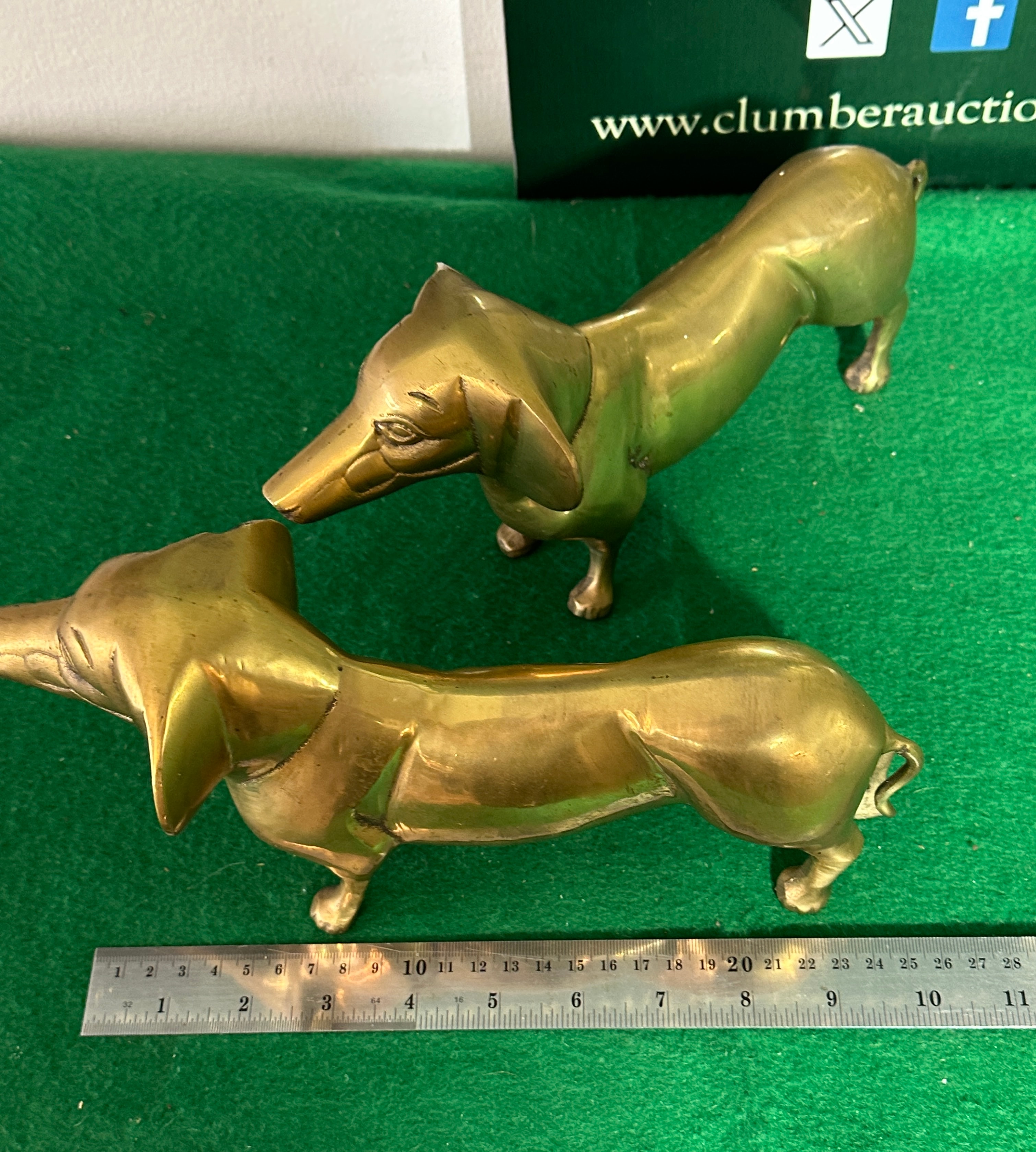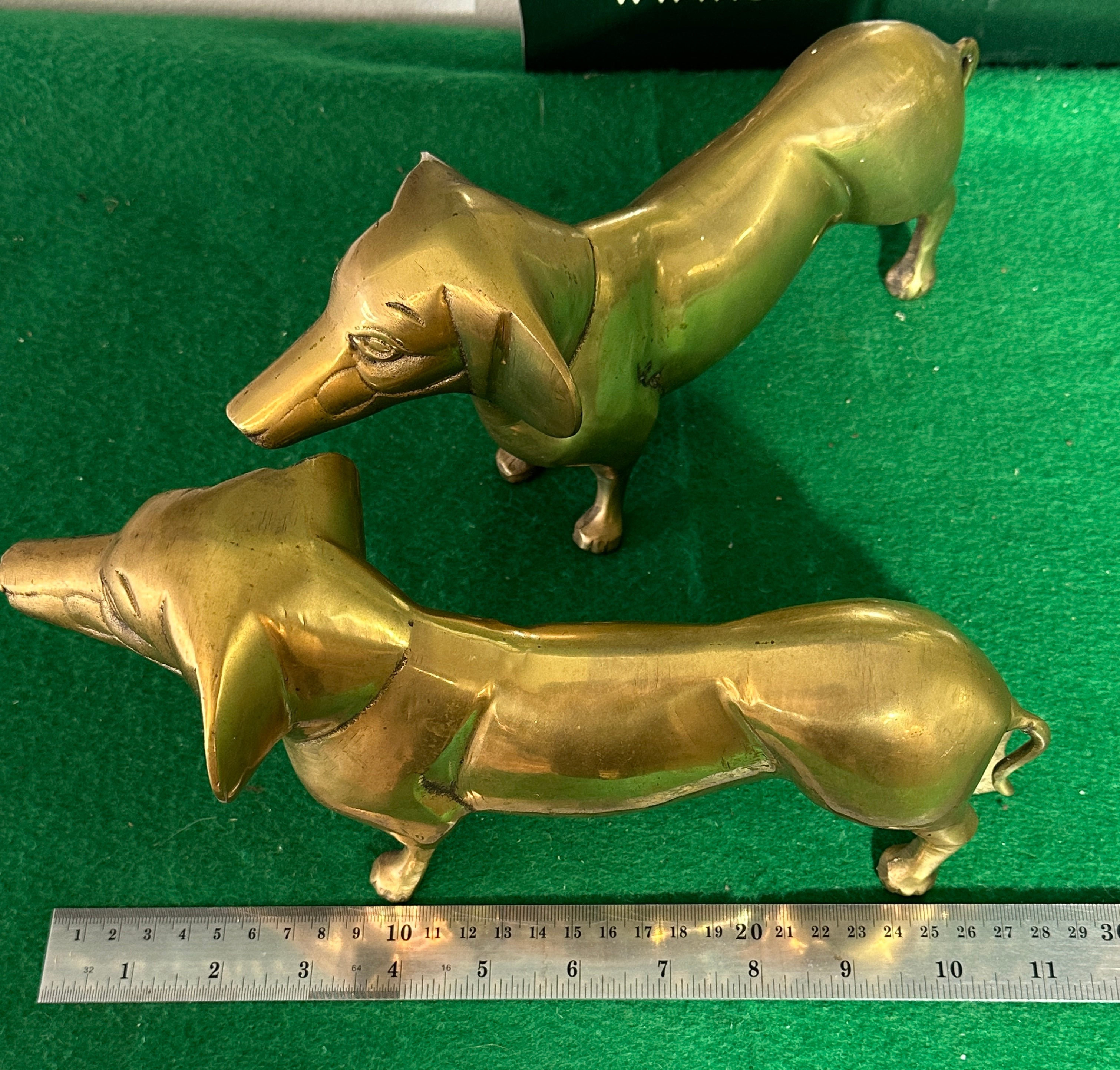 A pair of vintage brass figural statuettes, each depicting a dachshund dog in a standing pose. The dogs are rendered in a realistic yet decorative style, with elongated bodies, short legs, and characteristic droopy ears. Crafted from brass, the pieces exhibit a warm, polished finish with areas of natural patination and minor tarnish, particularly in recesses and on the snouts, consistent with age and handling. No manufacturer’s marks or specific period-defining inscriptions are discernible.