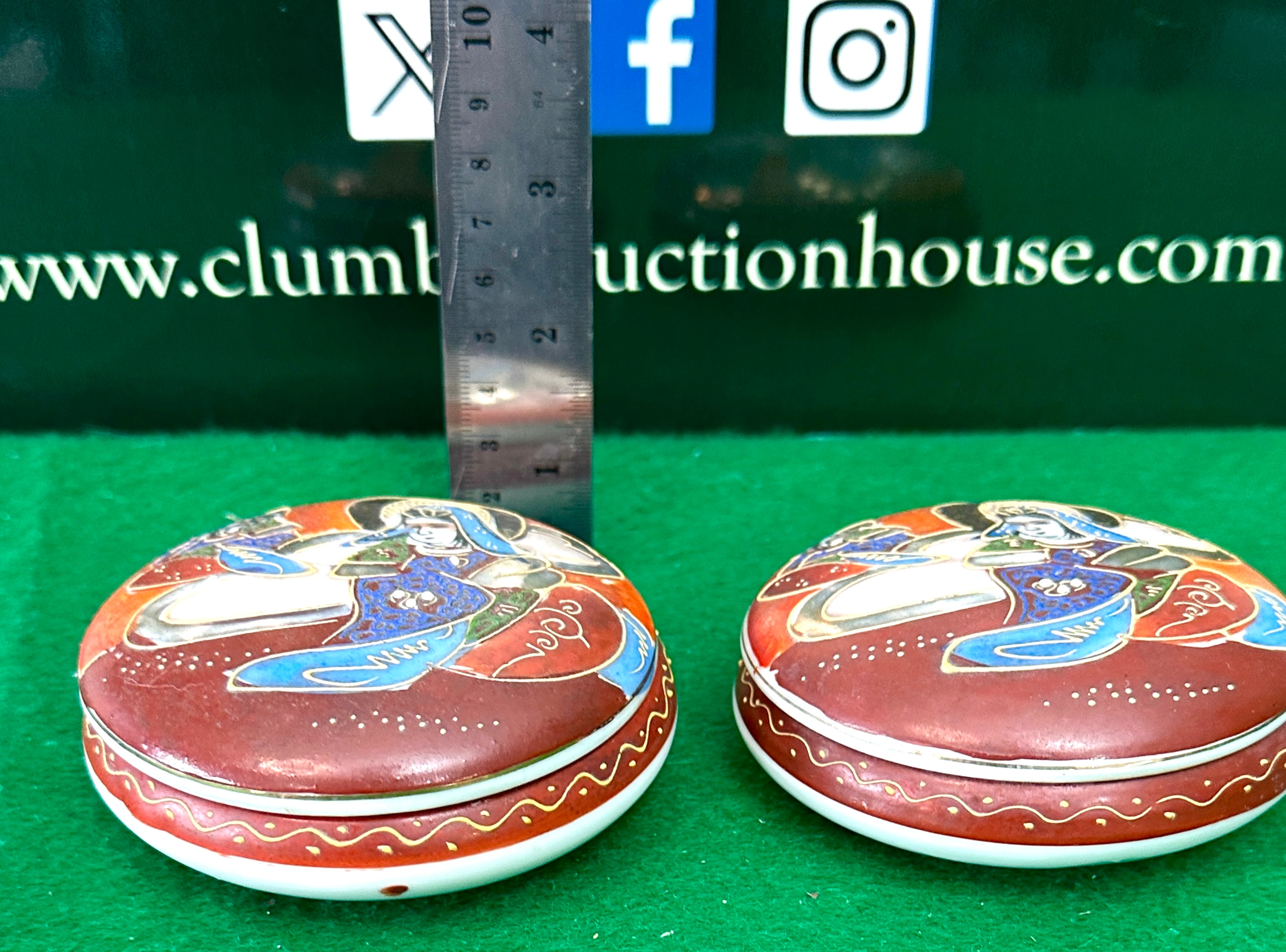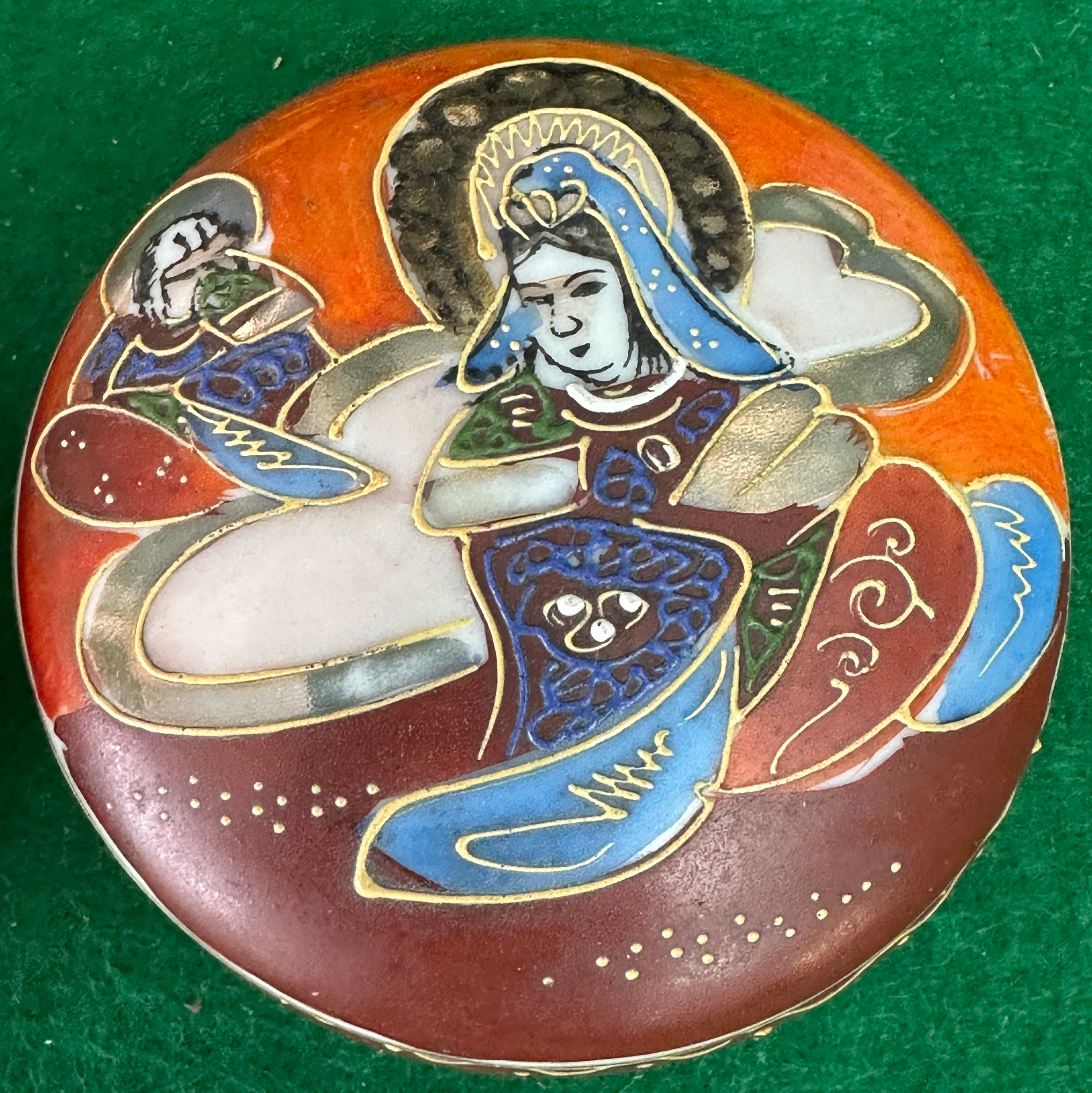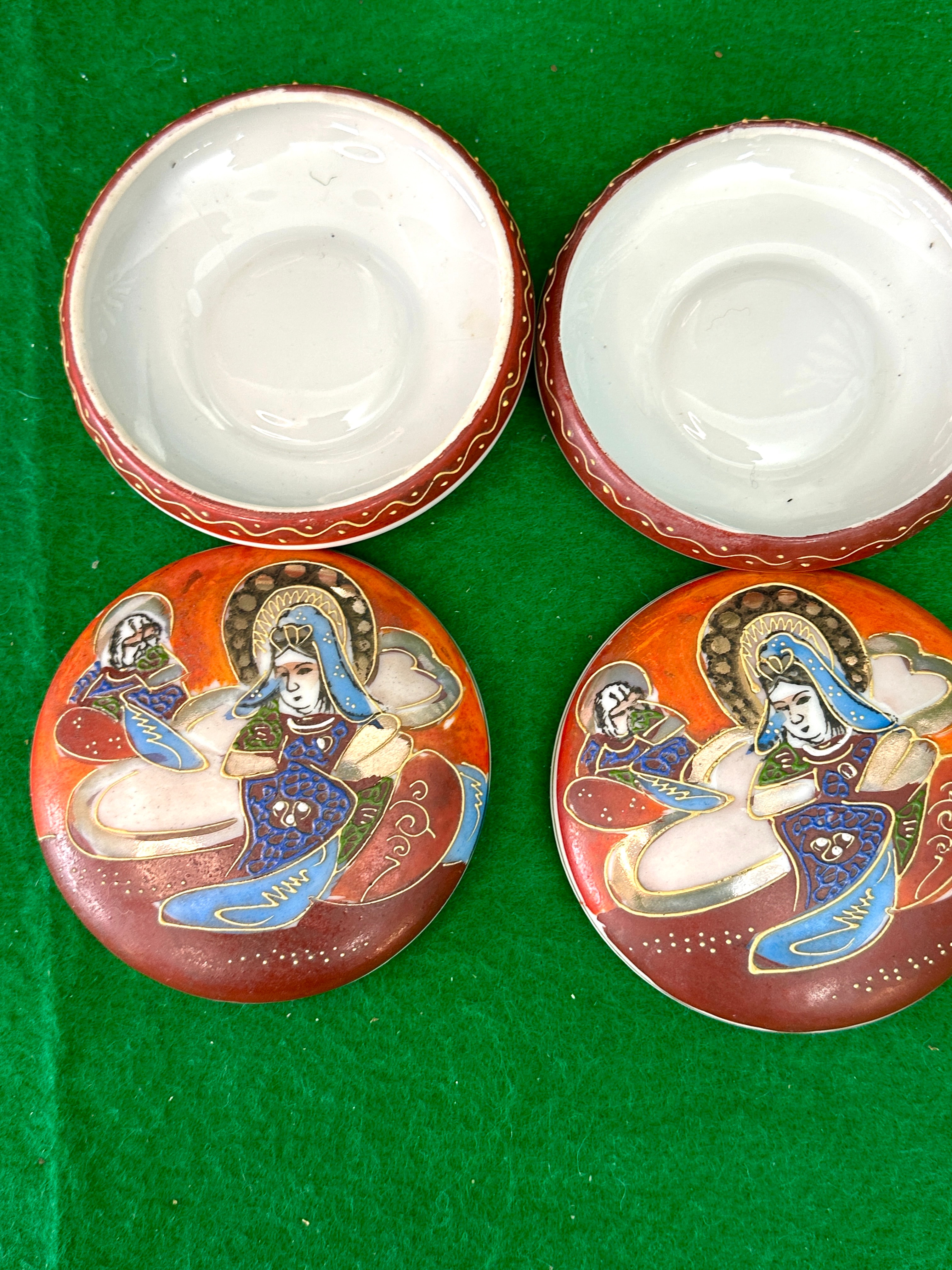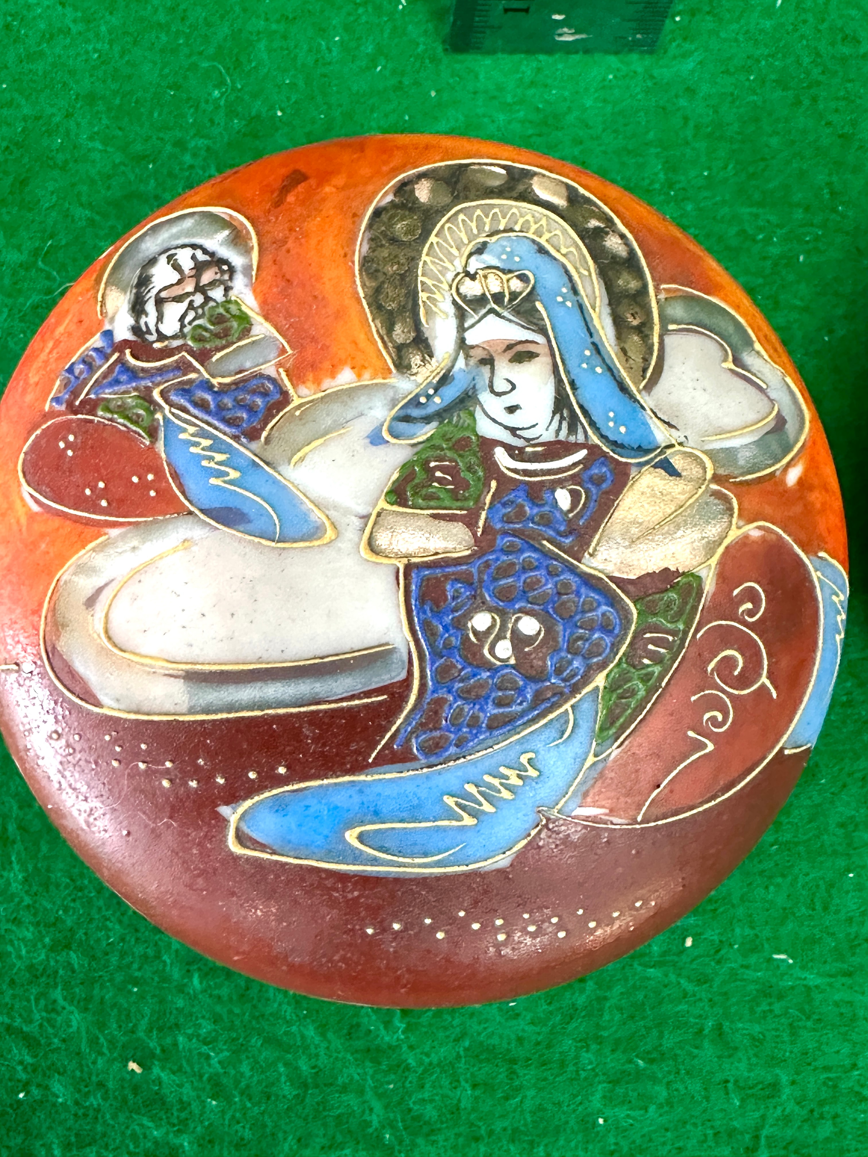 A pair of antique Japanese Satsuma Moriage hand-painted porcelain trinket boxes. Each small, circular, lidded box features detailed enamel decoration. The lids depict a central deity-like figure, possibly Kannon or Guanyin, with a halo and elaborate robes, attended by a smaller figure, all resting on clouds against an orange and reddish-brown ground, outlined with gilt accents. The rims of both the lids and bases are decorated with a delicate gold wave or scroll pattern, while the interiors are white. The underside of one base bears a red mark which translates from Japanese as ‘Satsuma’ (薩摩).