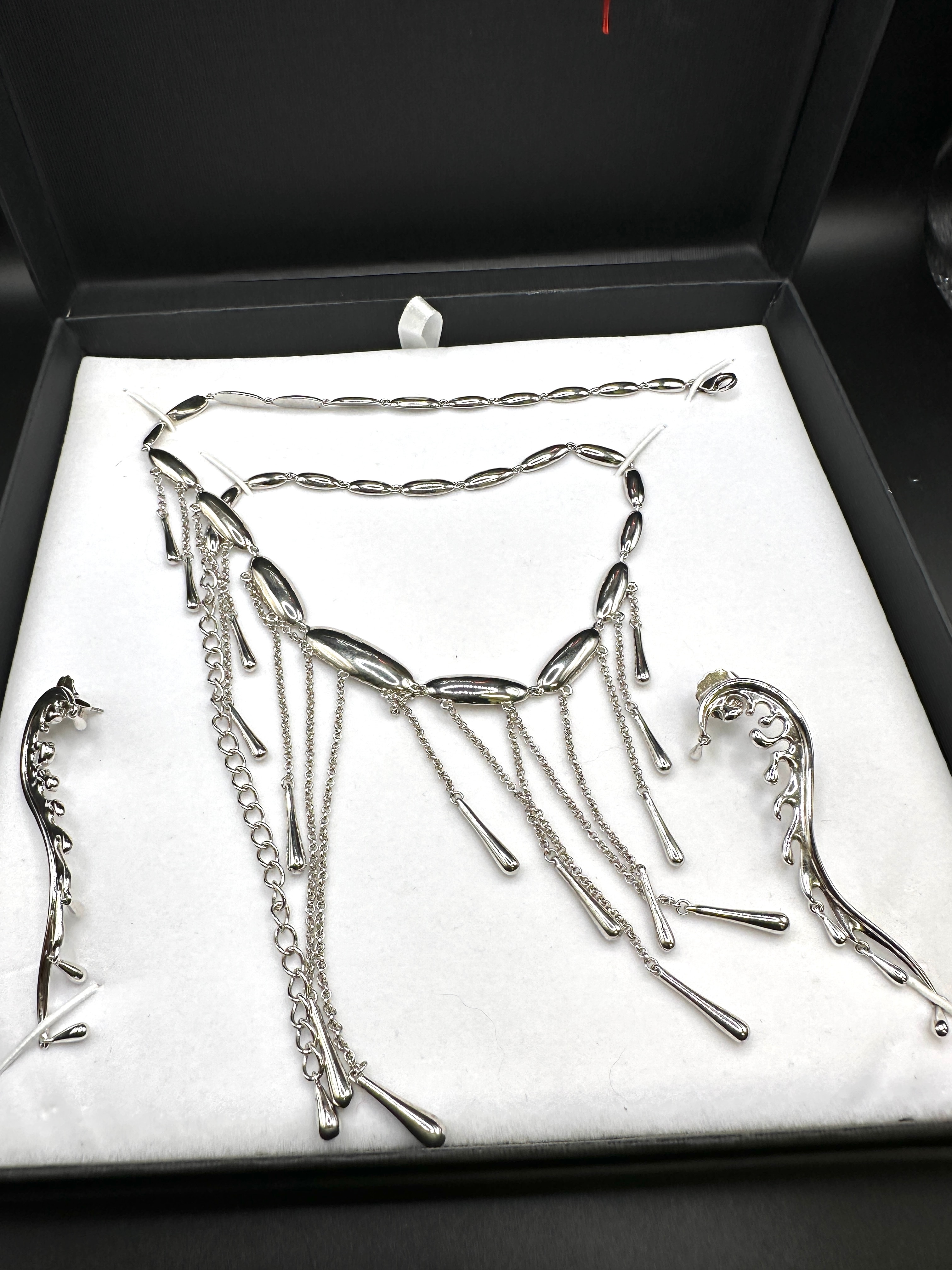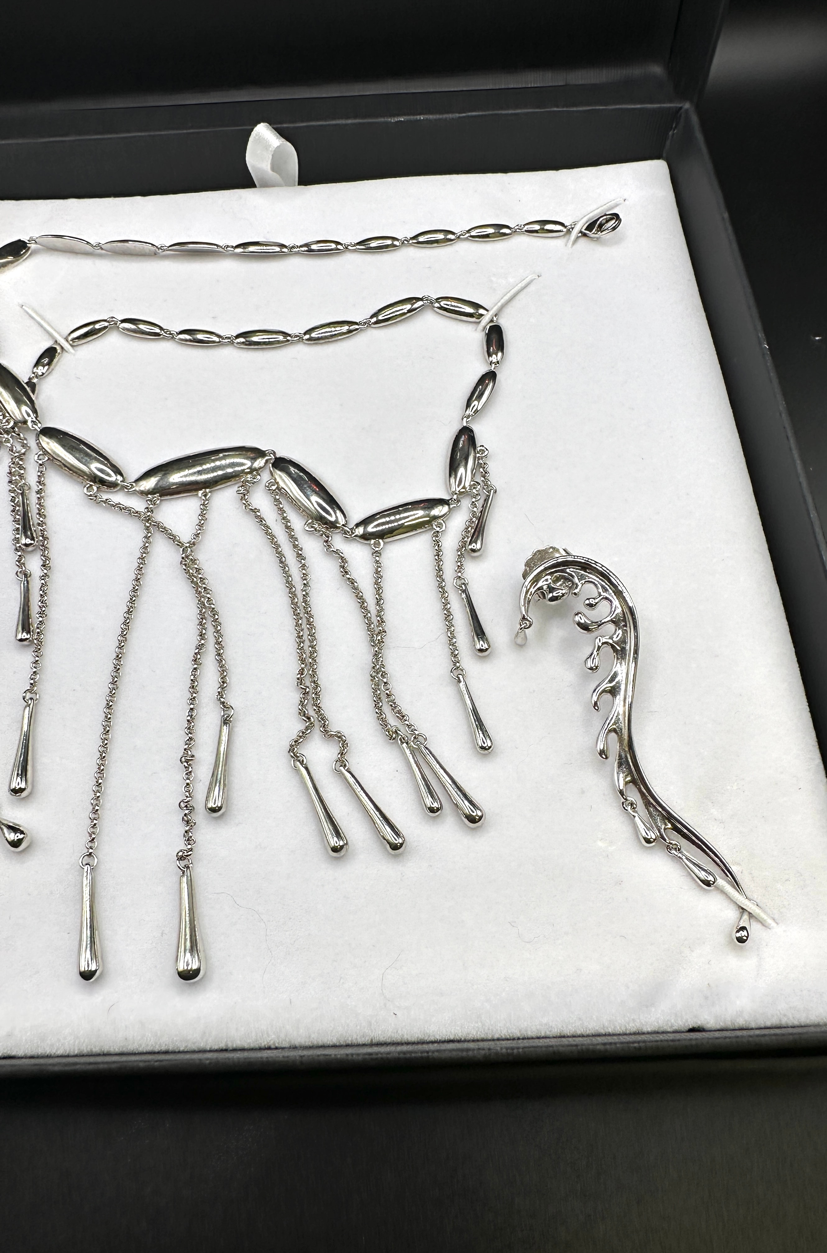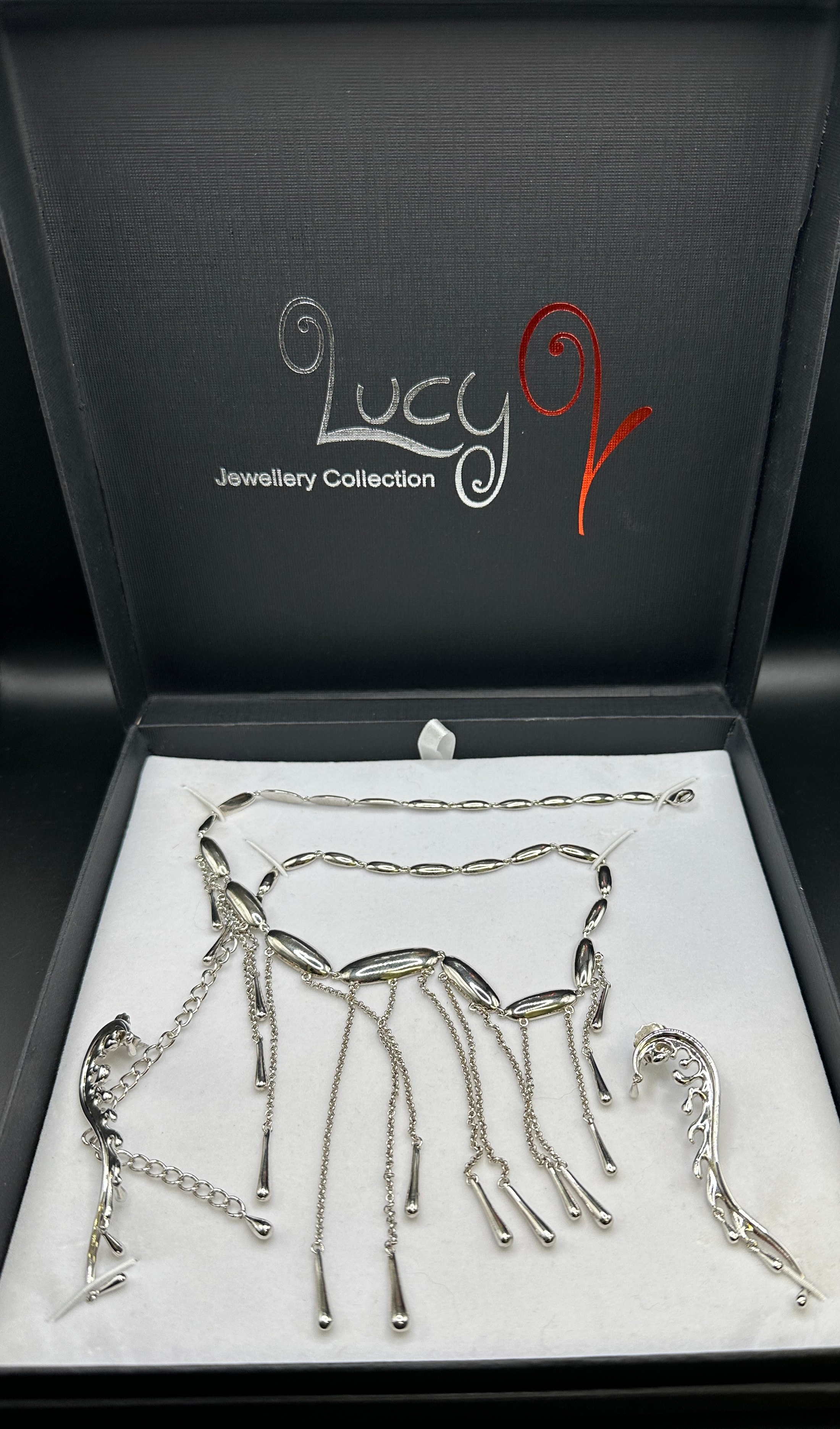 A three-piece jewellery set by Lucy Quartermaine, presented in its original black hinged box labeled “Lucy 9 Jewellery Collection.” The contemporary set comprises three pieces crafted from bright, polished silver-tone metal: a simple necklace with elongated oval links, a statement necklace featuring a fringe of delicate chains suspending teardrop pendants from a similar linked body, and a pair of ear cuffs or climbers with an organic, swirling design.