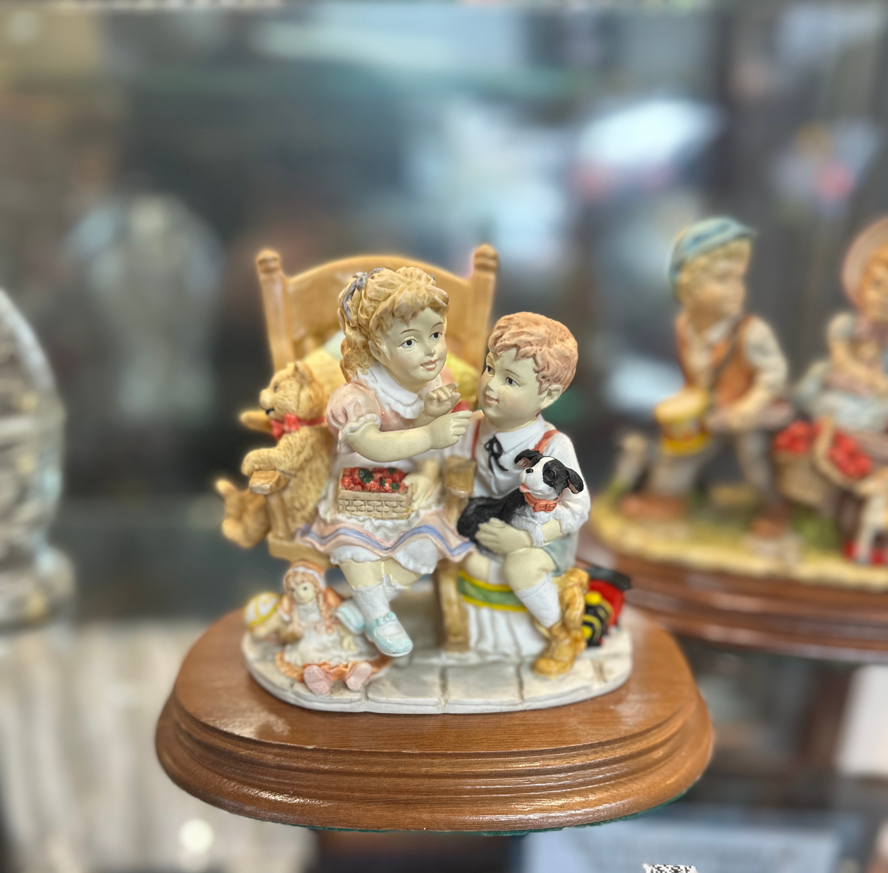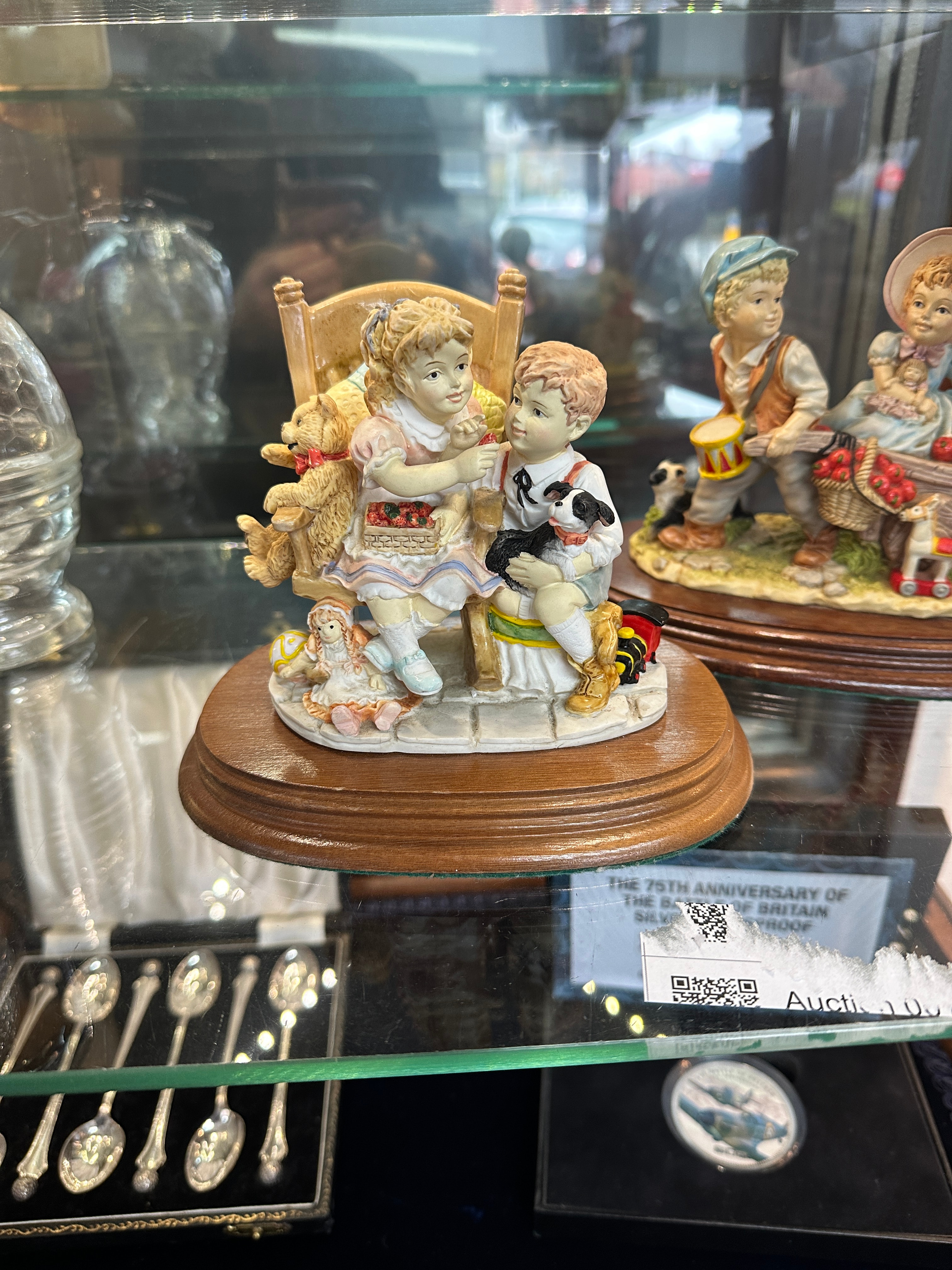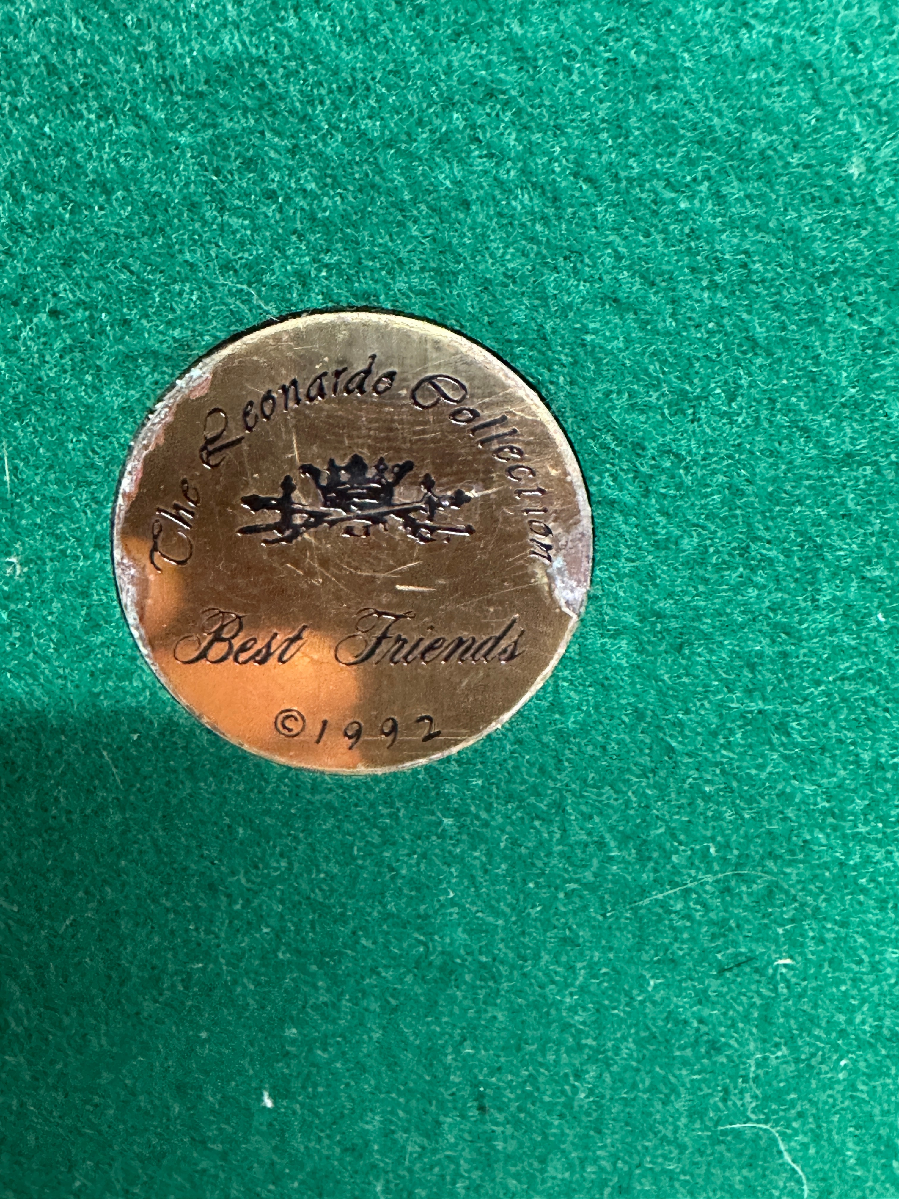 A ‘Best Friends’ figurine by The Leonardo Collection, dated 1992. This late 20th-century decorative figurine is crafted from polychrome painted ceramic or porcelain, depicting a boy and a girl seated together. They are surrounded by various toys, including a dog and teddy bears, rendered in a sentimental style. The figurine is mounted on a polished wooden base, which features a brass-colored metallic disc engraved with ‘The Leonardo Collection,’ a stylized crown logo, the title ‘Best Friends,’ and the copyright year ‘©1992’.