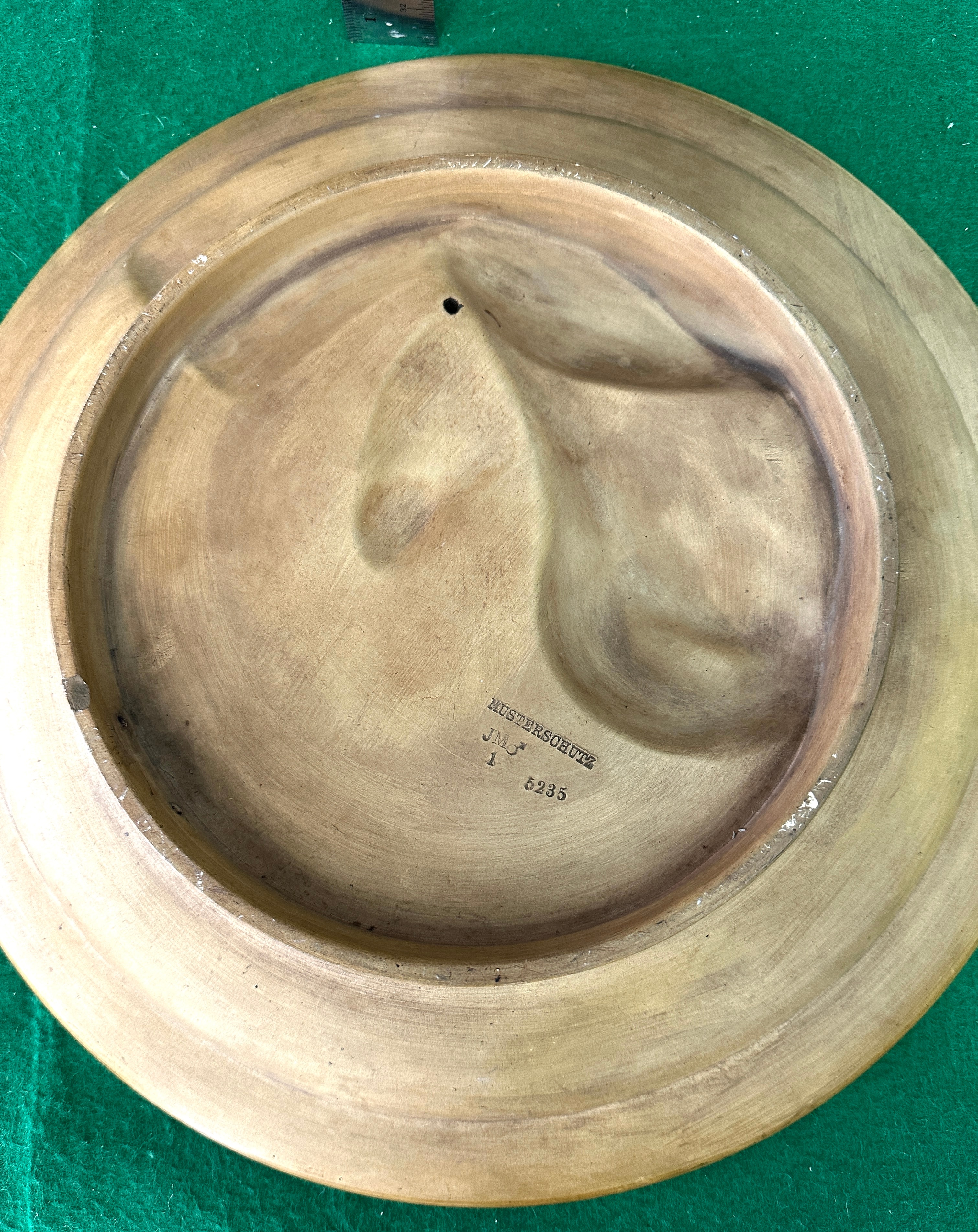 A Johann Maresch Musterschutz polychrome wall plaque, depicting a high-relief genre scene. The circular plaque features three figures in period attire within an arched interior setting, with one figure playing a mandolin-like instrument. The relief is rendered in muted, polychrome paints and is housed within a black-painted wooden frame with a gold-painted inner rim. The piece is crafted from a molded composite material, likely plaster or resin. The reverse of the plaque is marked “MUSTERSCHUTZ” along with the initials “JM G”, the number “1”, and a model or inventory number “6235”. A hole for hanging is present at the top.