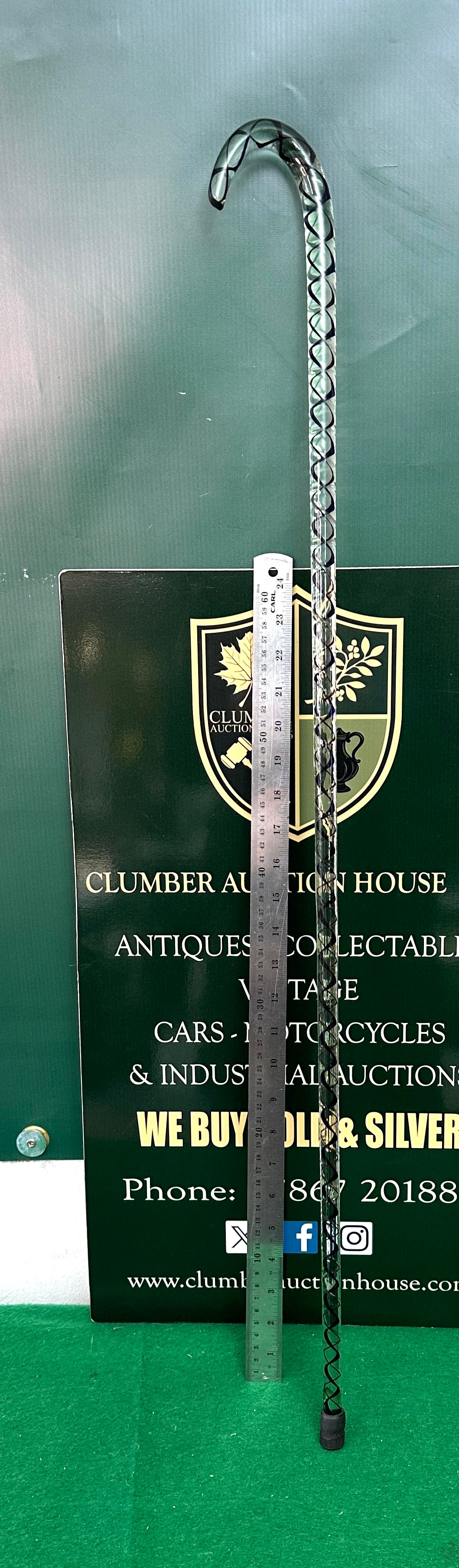 A 19th Century Nailsea spiral-twist glass walking cane. The cane features a transparent shaft and a curved crook handle, crafted from clear glass. The shaft is internally decorated with a continuous, dark, spiraling pattern that forms a repeating diamond or criss-cross motif along its length. It is fitted with a dark, ribbed rubber or plastic ferrule at its base.