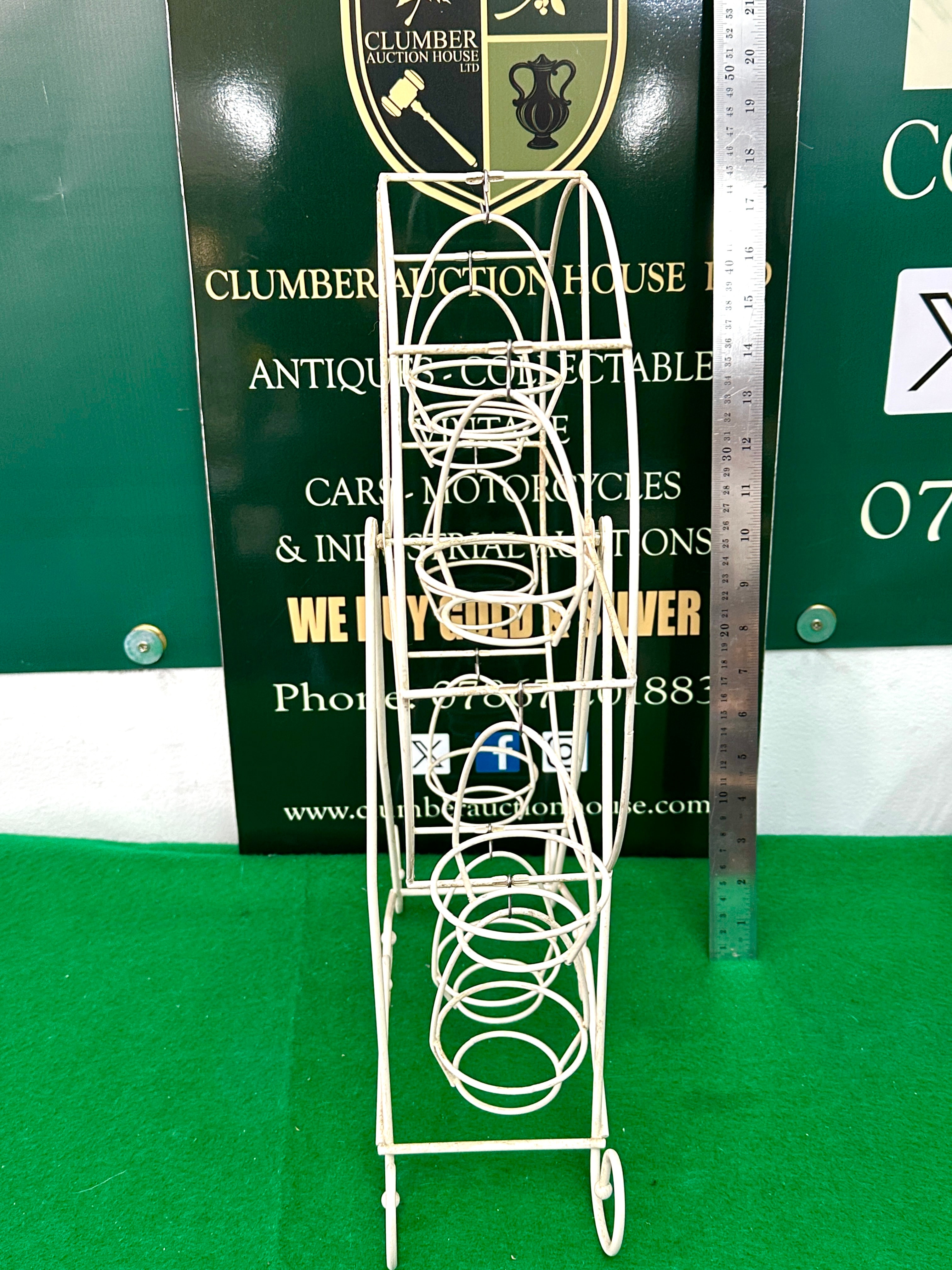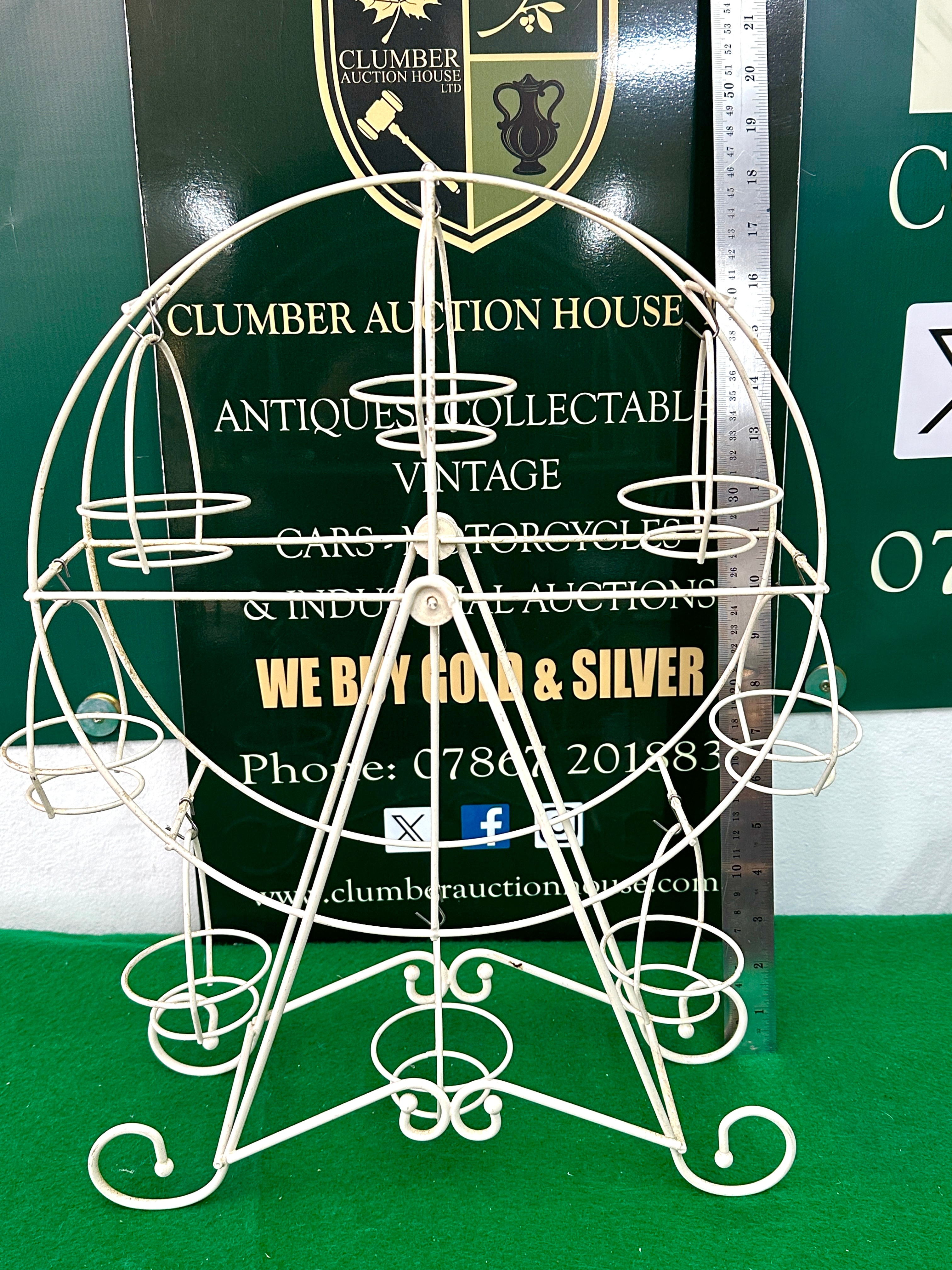 A Cobble Creek Ferris Wheel Cupcake Holder Display. Crafted from painted metal rods, likely wrought iron or steel, finished in an off-white or cream color. The design features a central rotating wheel equipped with twelve small, basket-like holders arranged symmetrically, supported by an ornate scrolled base with additional decorative loops. The style is whimsical and decorative, consistent with vintage or contemporary home decor.