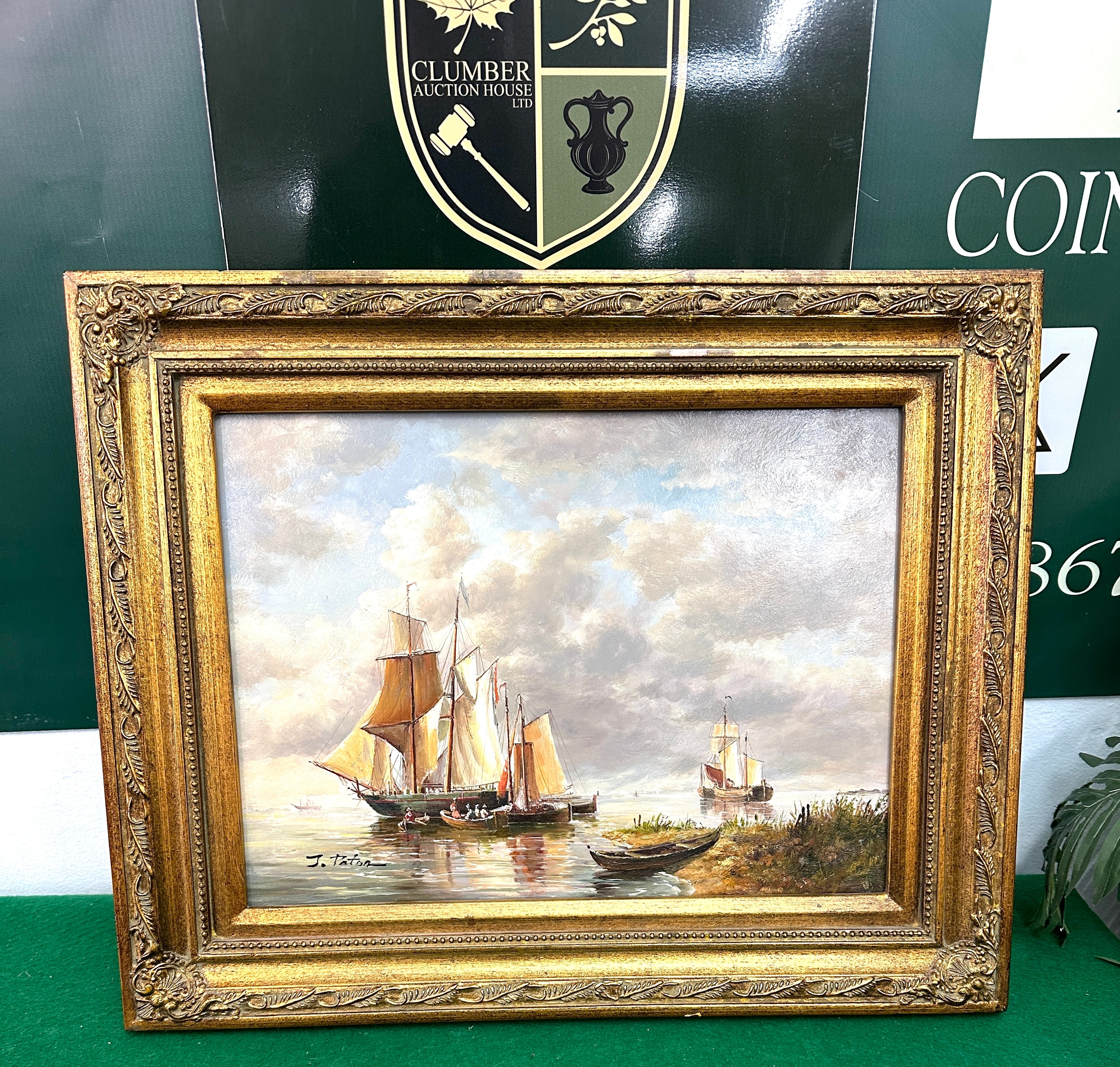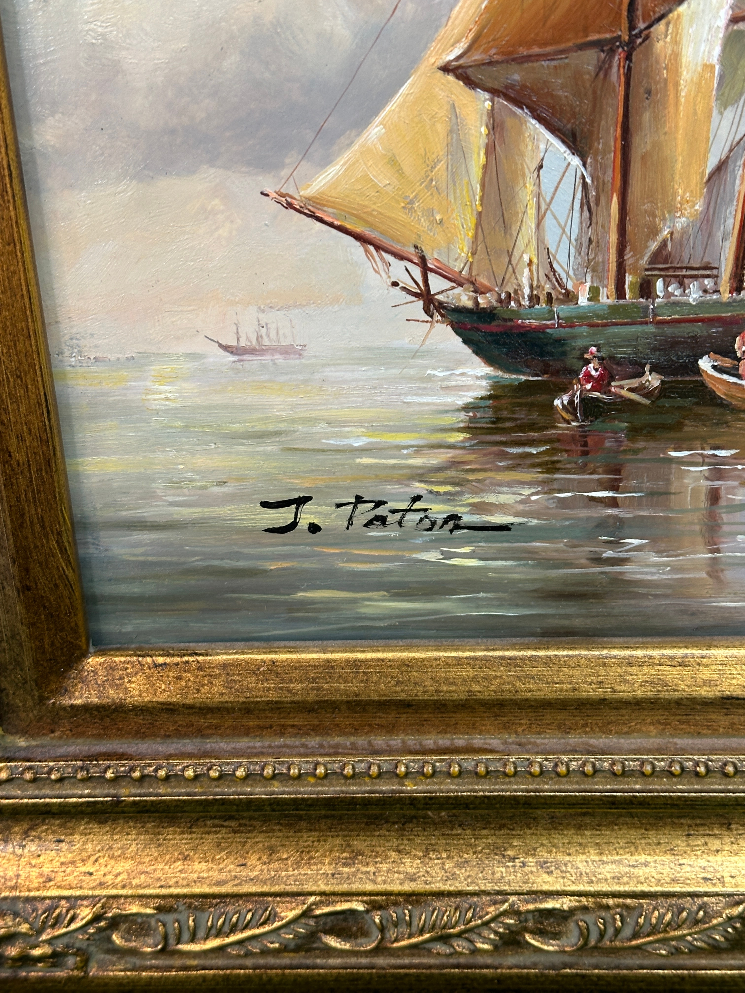 An oil painting signed ‘J. Paton’ in black script in the lower left corner, depicting a bustling marine seascape with multiple sailing vessels under a cloudy sky. The scene features figures in smaller boats near the main ships and a small boat beached on the foreground shore. The artwork is housed within an ornate, gold-toned wooden frame with visible decorative molding. The reverse of the frame shows a wooden or particle board backing, sealed with tape, and fitted with a hanging wire.