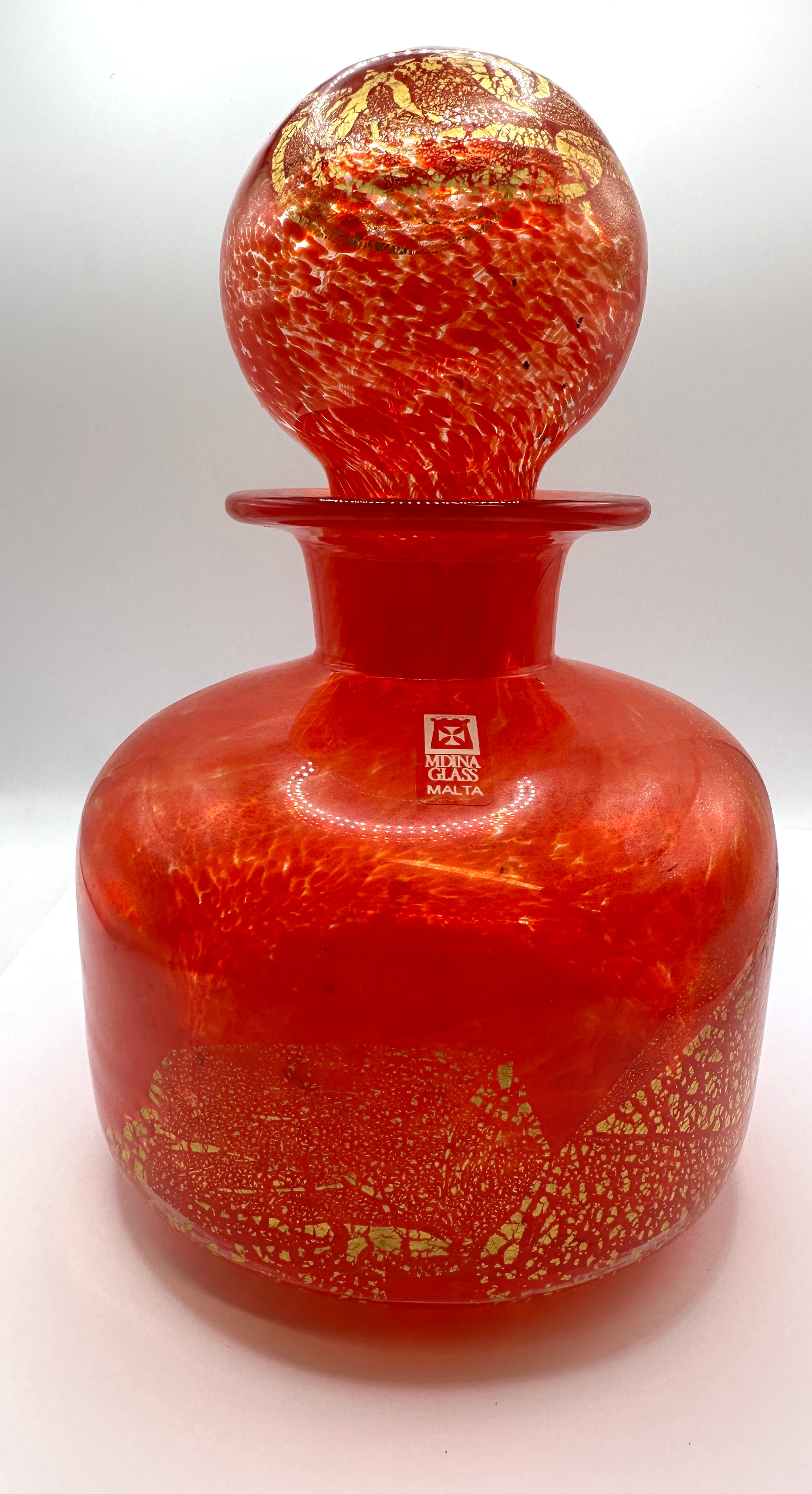 A Mdina Glass Malta art glass bottle with stopper. This vibrant red art glass bottle features a squat, rounded body and a flaring neck, accompanied by a matching spherical stopper. Both the bottle and stopper are adorned with internal gold leaf flecking; dense on the stopper and a speckled pattern on the lower body of the bottle. A white decal on the bottle’s shoulder displays a stylized cross logo above the text “MDINA GLASS MALTA.” A small white sticker with the handwritten number “6” is present on the base.