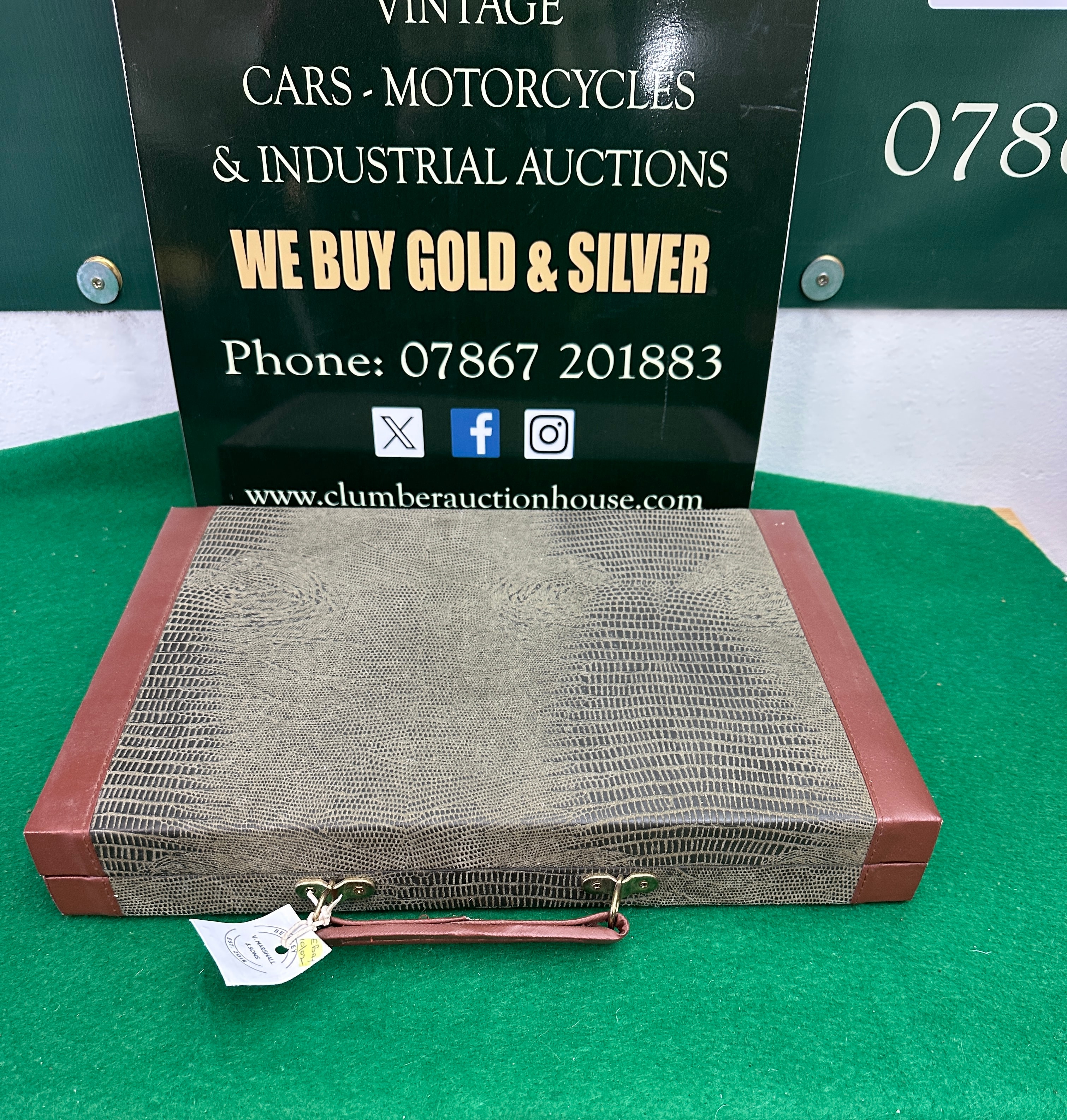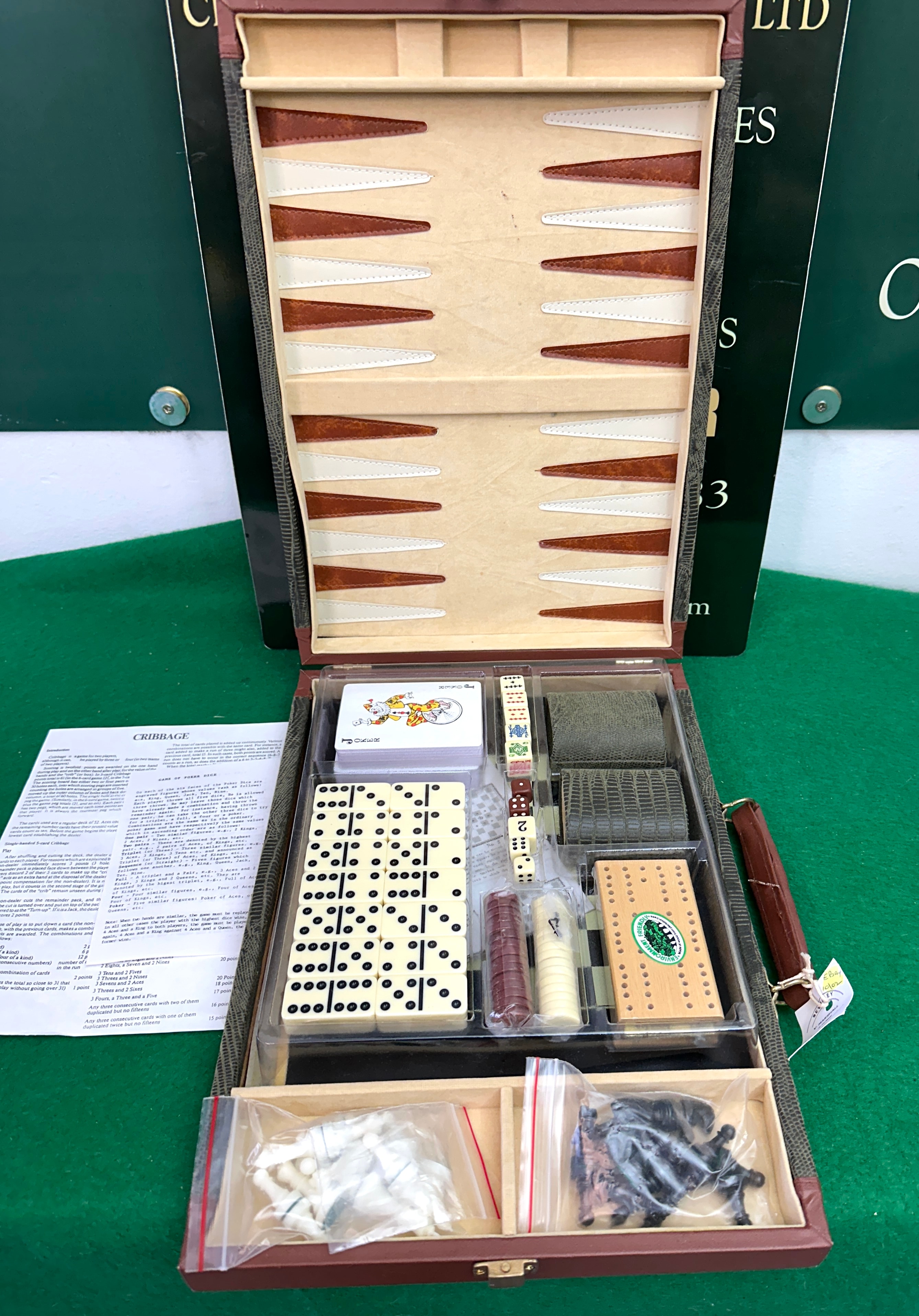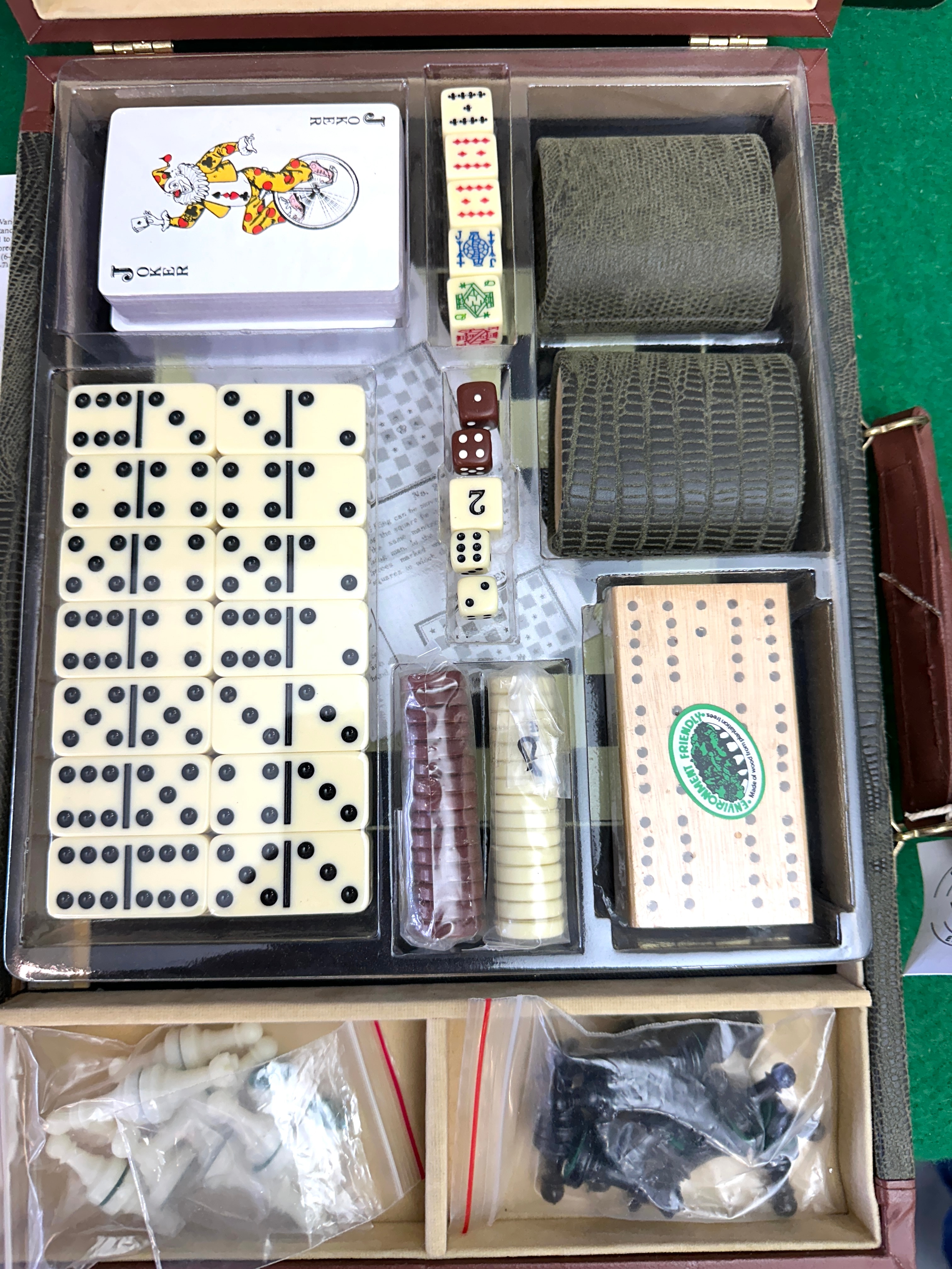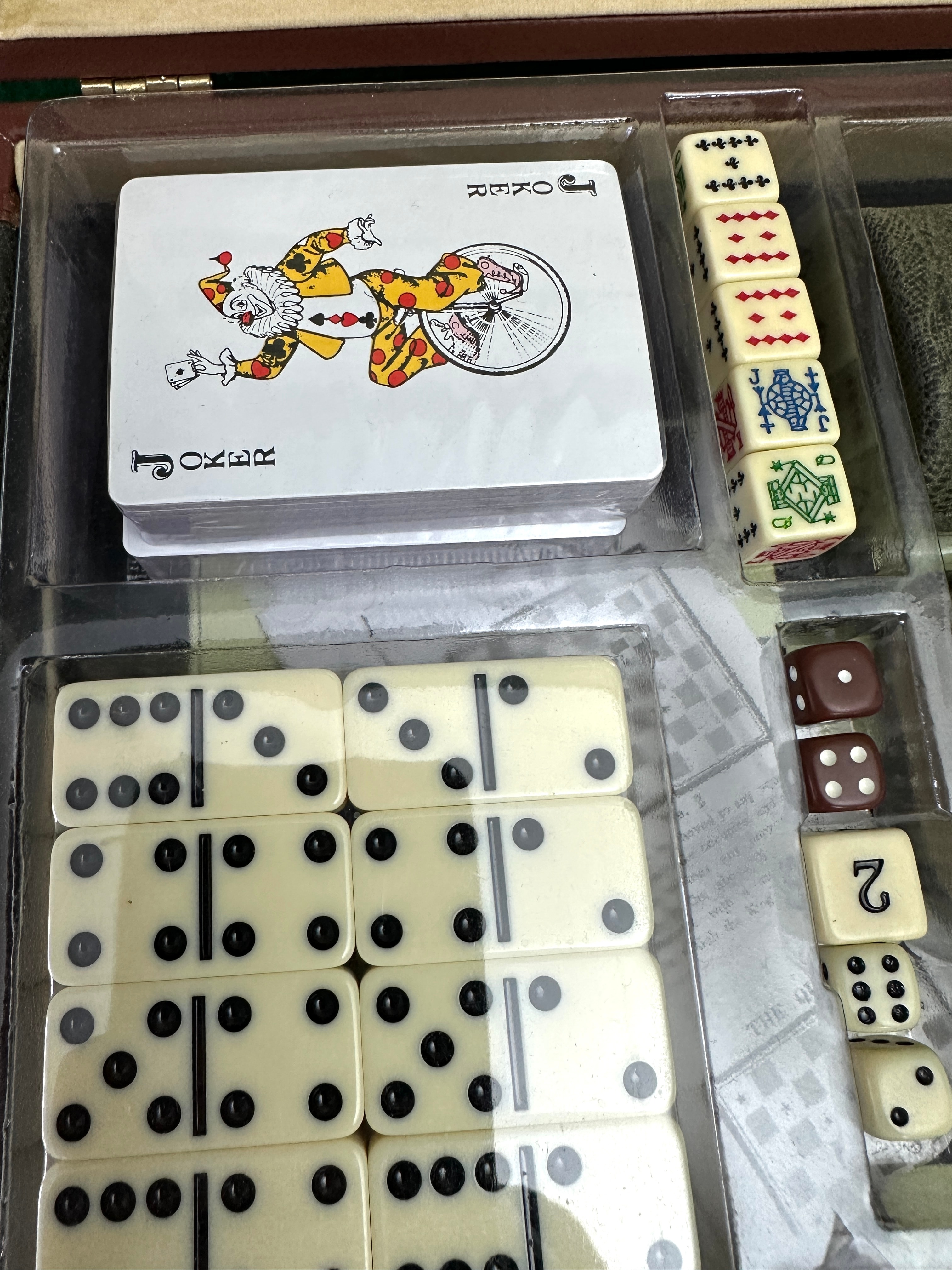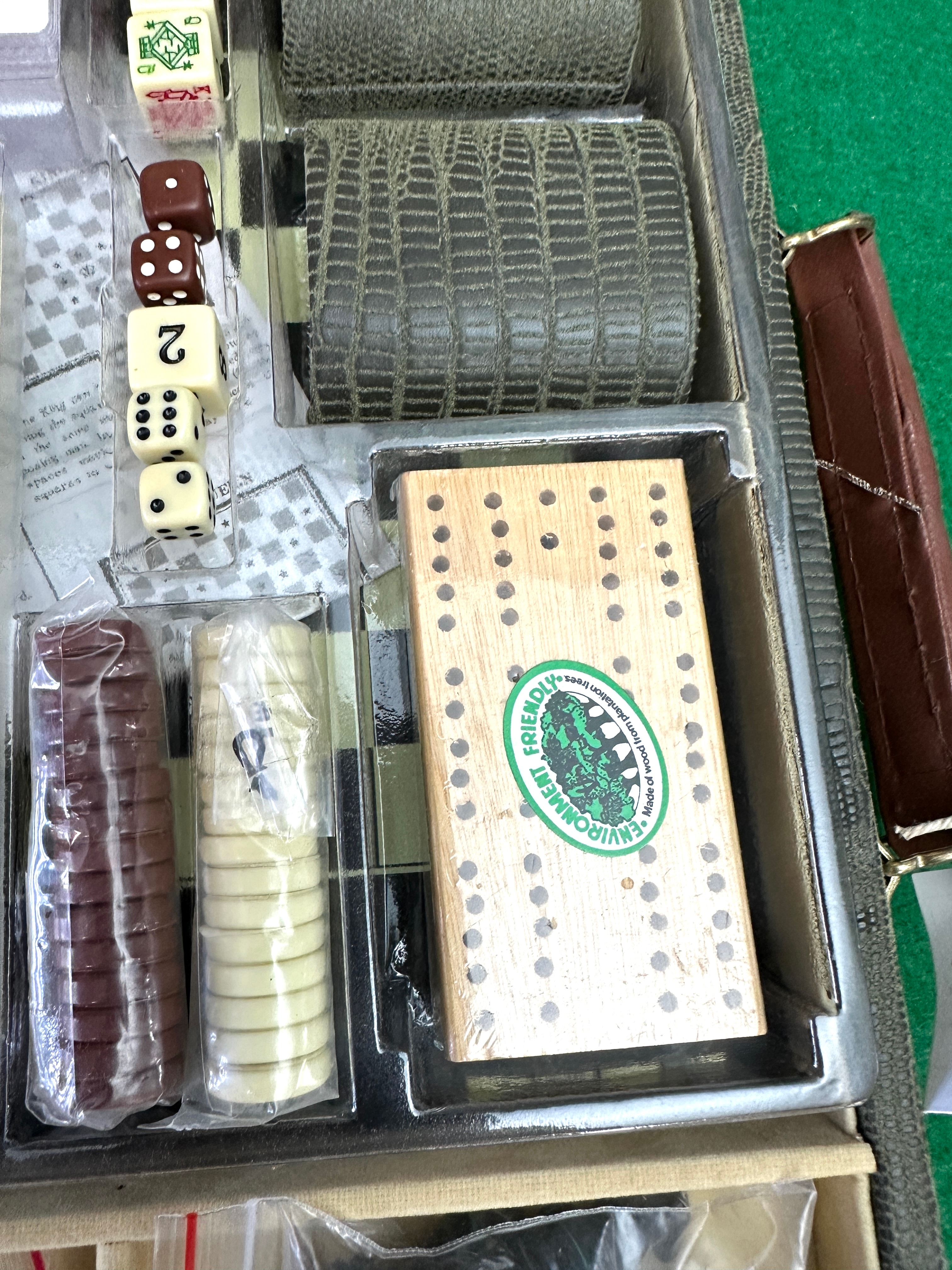 A portable, hinged multi-game compendium set housed within a dark grey/brown textured faux leather case, mimicking a lizard skin pattern. The case features contrasting smooth brown faux leather trim and metal clasps. The interior lid is marked with a backgammon board. The main compartment contains various game components organized in clear plastic trays, including off-white plastic dominoes with black pips, a deck of playing cards (with a joker visible), multiple types of dice (standard pip, numbered, and symbolic), and a light wood cribbage board. Also present are sealed bags of white and black/dark plastic game pieces, likely for chess or checkers. An instruction sheet titled “CRIBAGE” is included. The wooden cribbage board features a green oval sticker that reads “FRIENDLY ENVIRONMENT / Made of wood from plantation trees.”