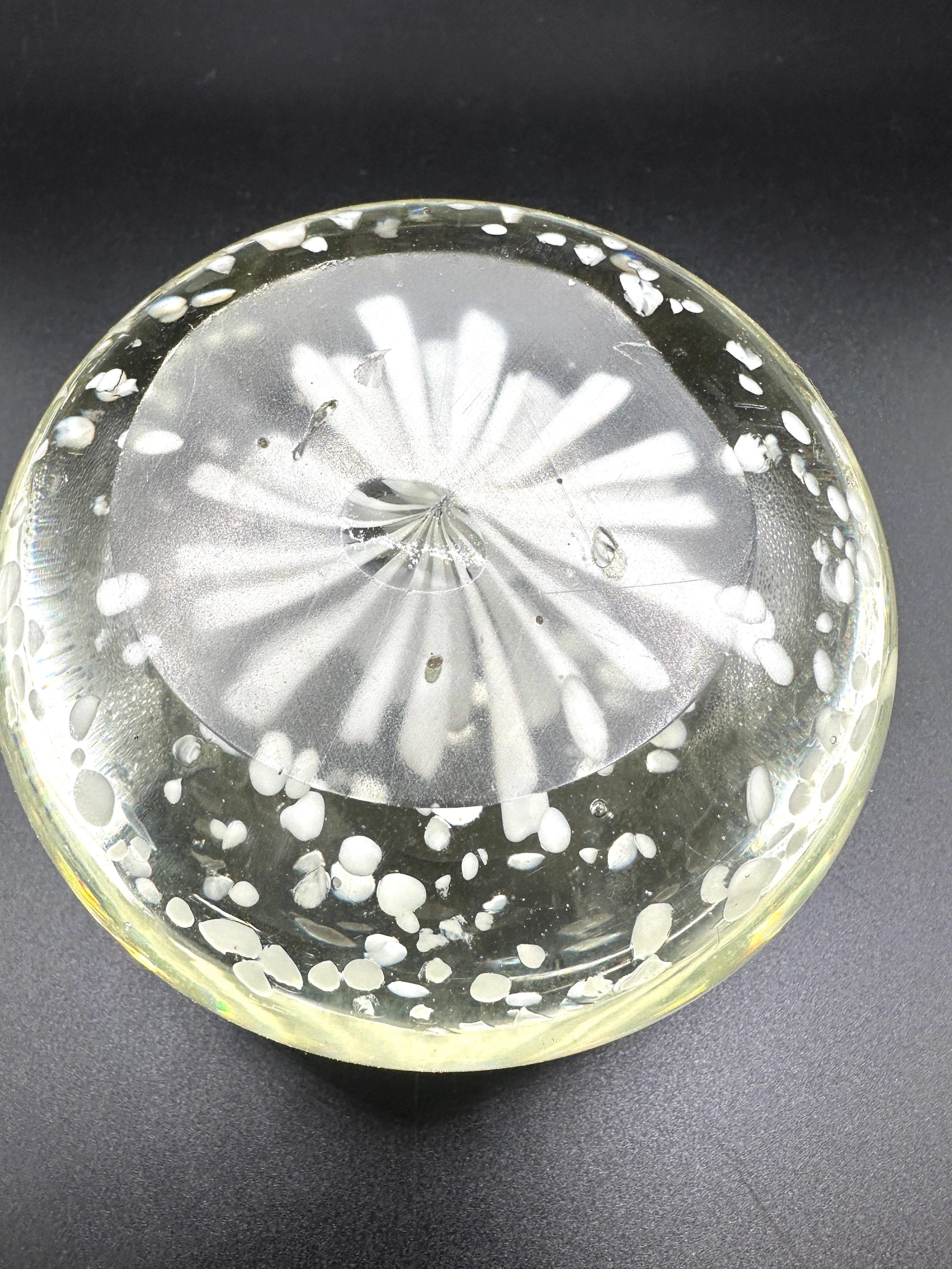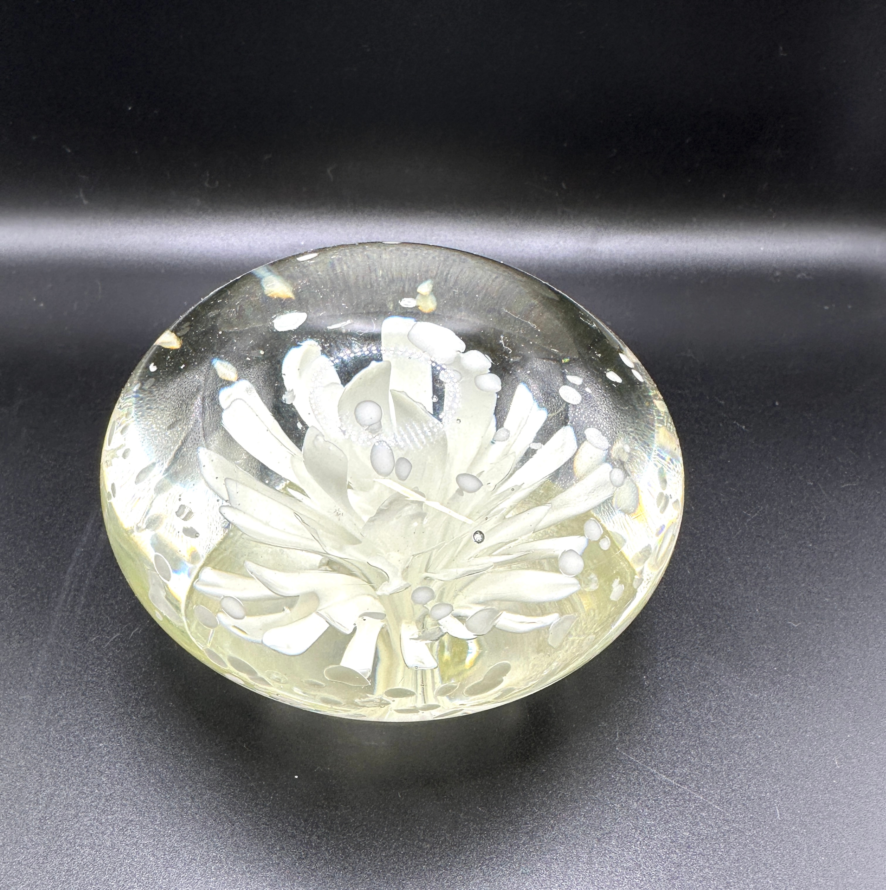 An art glass paperweight featuring a central chrysanthemum flower motif. This clear glass paperweight has a flattened domed shape. An opaque white multi-petaled floral or starburst motif, identified as a chrysanthemum, is encased within, surrounded by numerous scattered white, bubble-like inclusions. The clear glass body exhibits a subtle yellowish tint. A polished pontil mark is visible on its base. No discernible text or manufacturer’s markings are present.