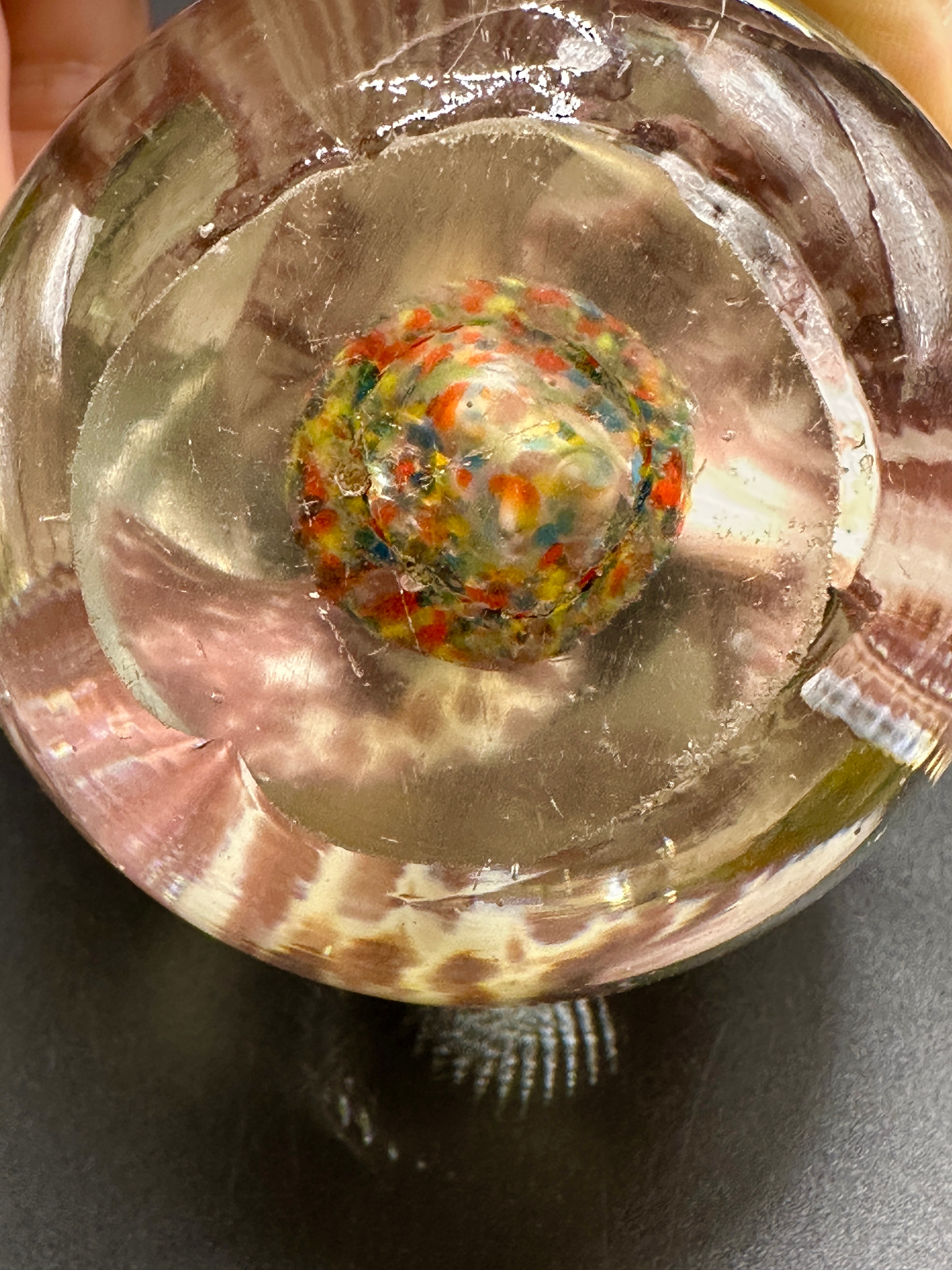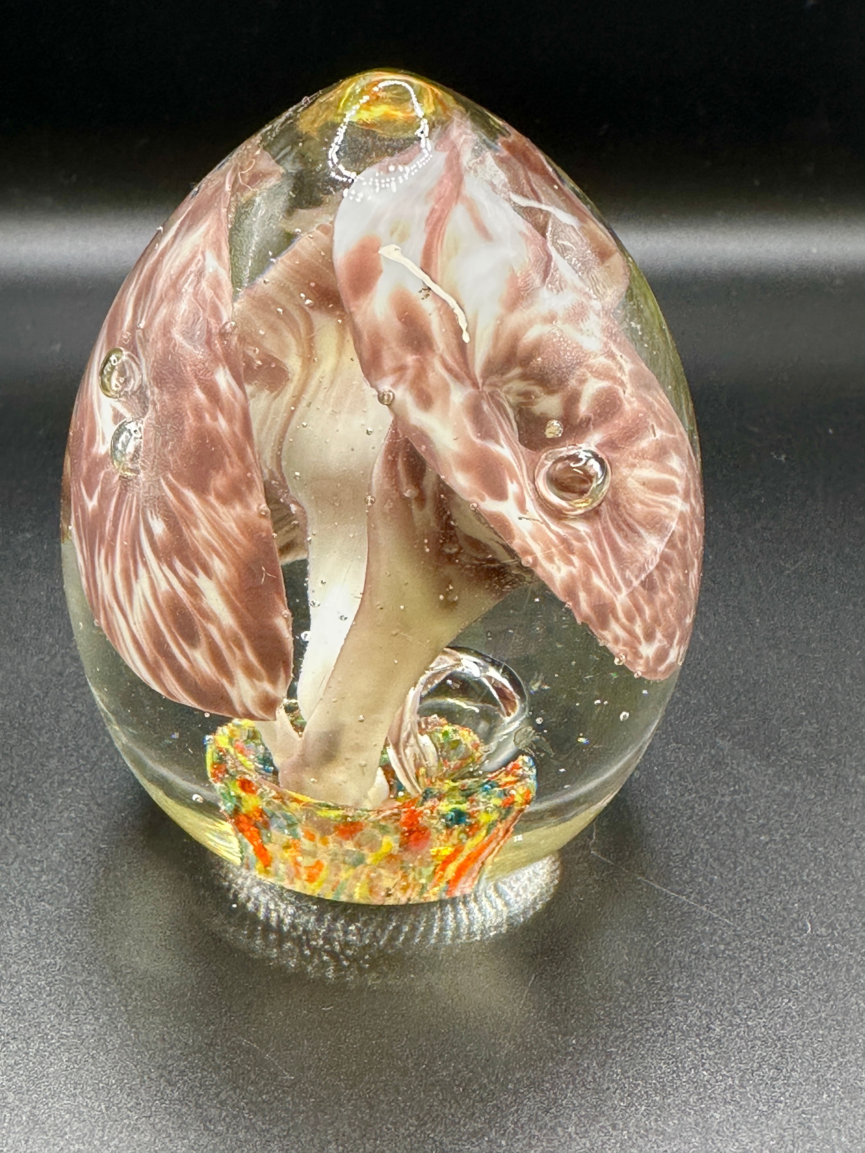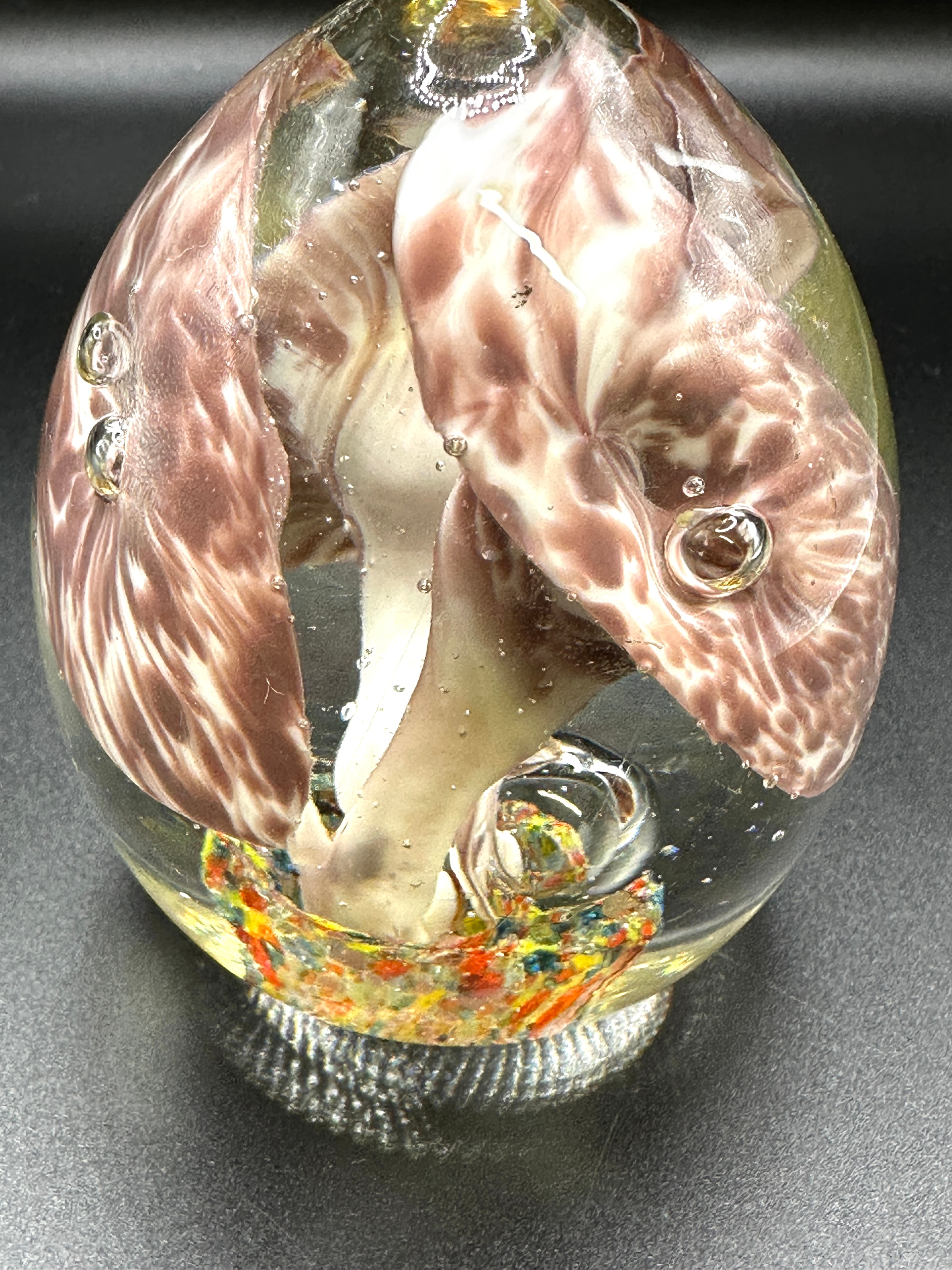A vintage art glass egg-shaped paperweight featuring a clear glass body. Encapsulated within is a three-dimensional, stylized internal design resembling a mushroom or fungal form. The central motif exhibits wavy, petal-like structures in opaque white and mottled reddish-brown hues, rising from a base of multicolored glass frit composed of red, blue, yellow, orange, and green fragments. Numerous small, spherical air bubbles are intentionally encapsulated within the clear glass. The base is flattened. No discernible text, signatures, or markings are visible.