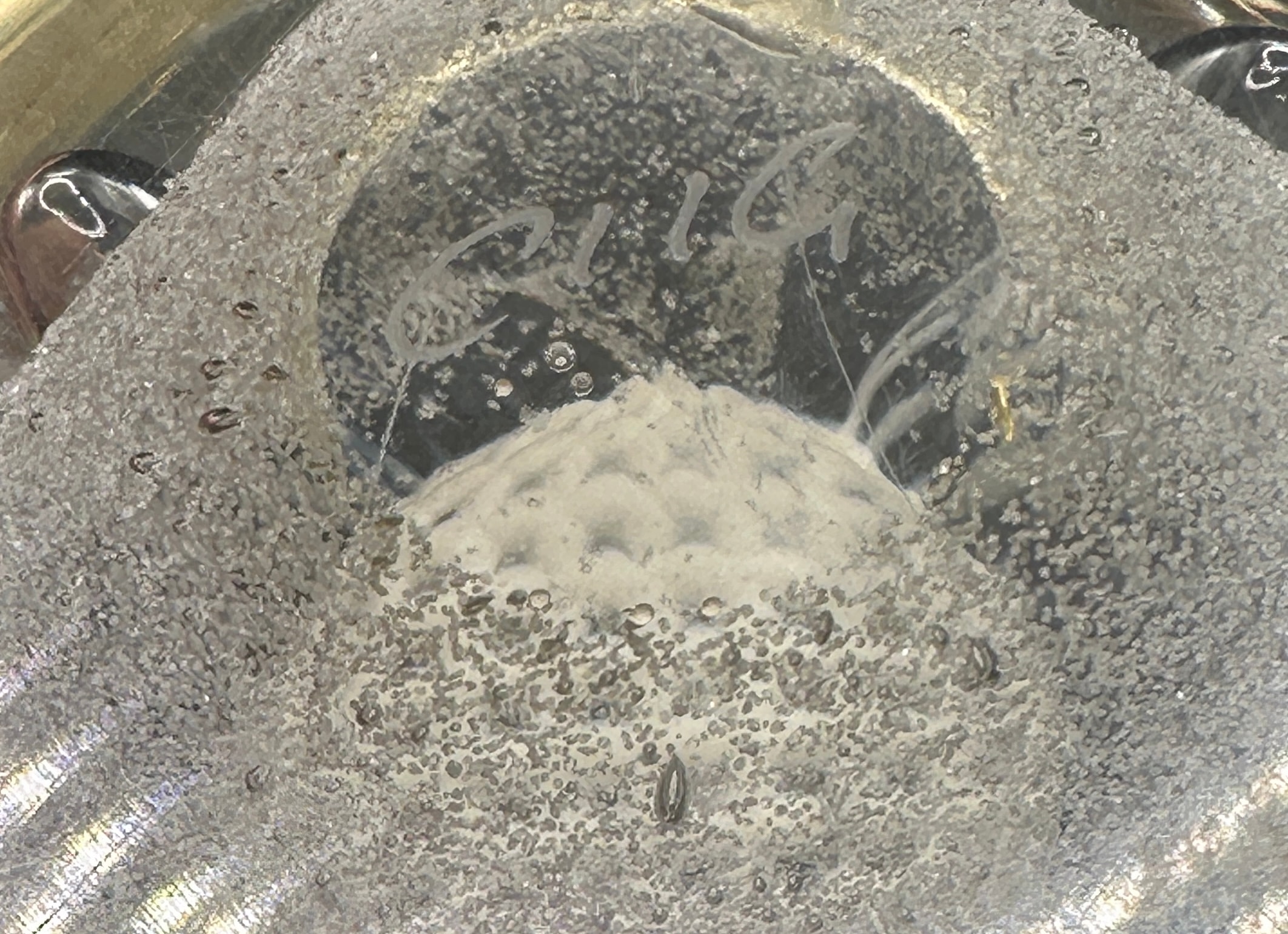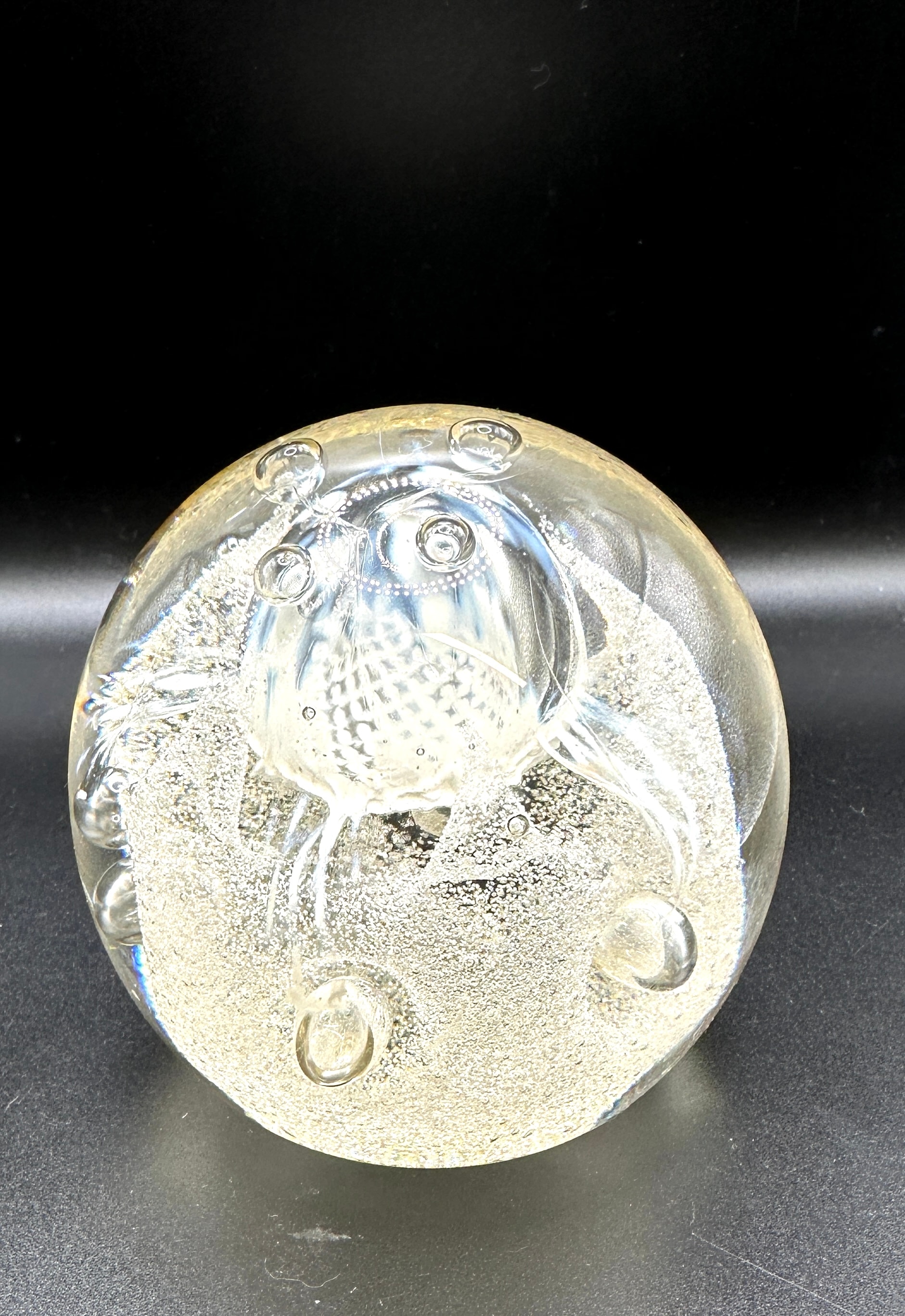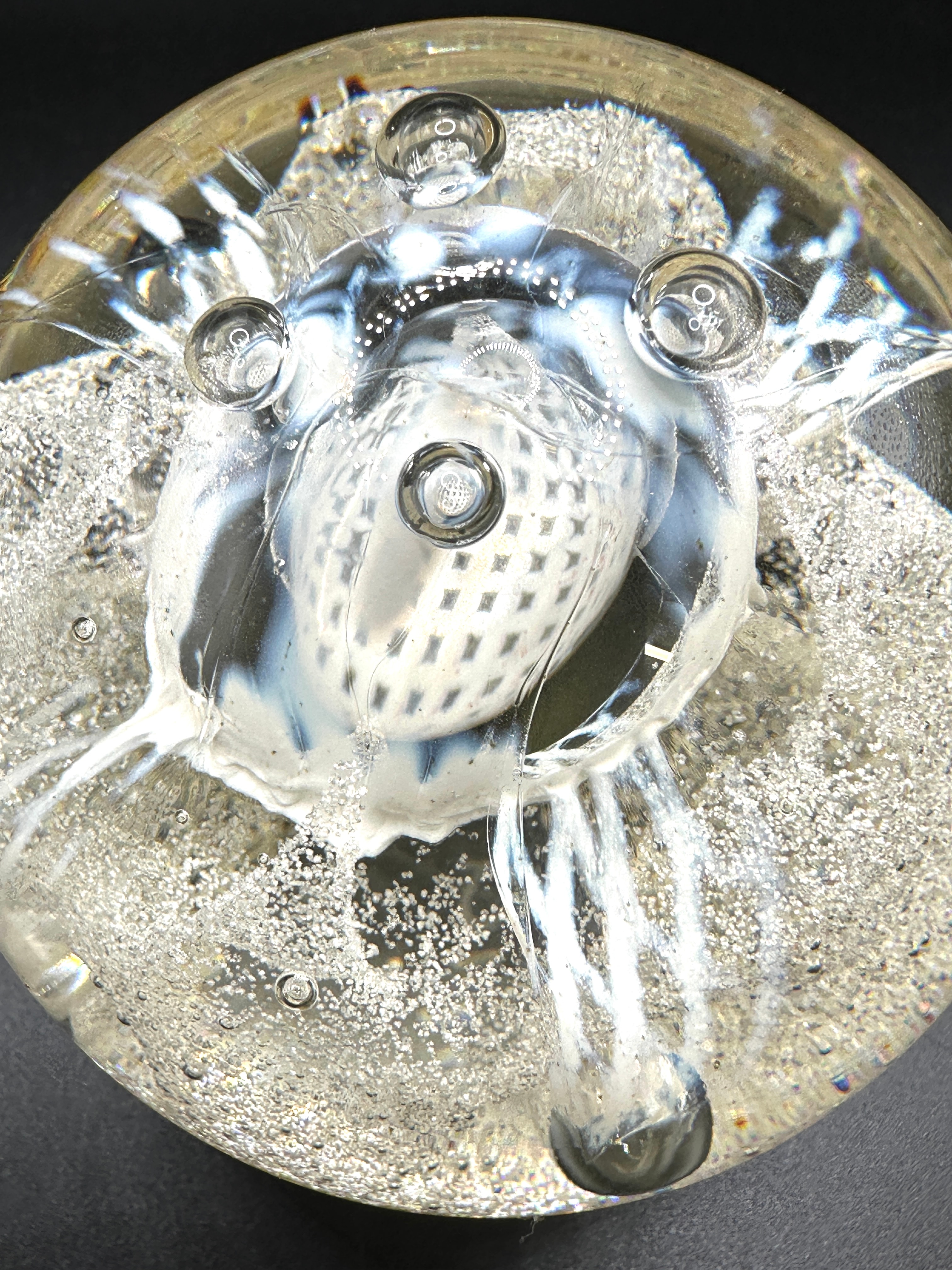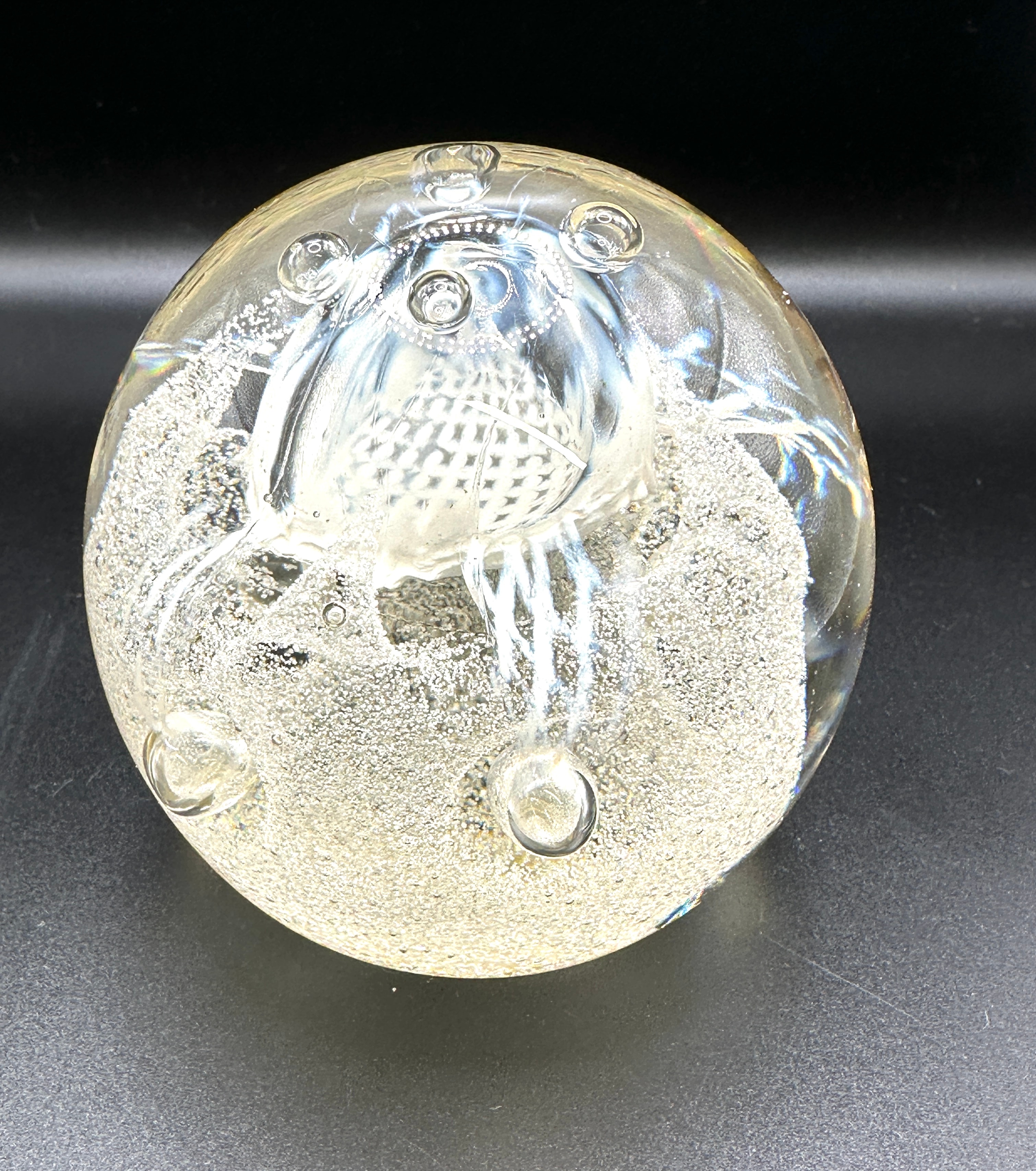 A Caithness ‘Congratulations’ paperweight, crafted from spherical clear glass with an internal lampwork design. Encased within is a milky-white, stylized form resembling a jellyfish or marine creature, featuring a textured, grid-patterned bell and flowing tendrils. This central motif is surrounded by a dense field of controlled micro-bubbles, creating a shimmering effect, along with several larger, deliberate air bubbles strategically placed around the central element. The flattened base of the paperweight bears an etched signature, “RüG”.
