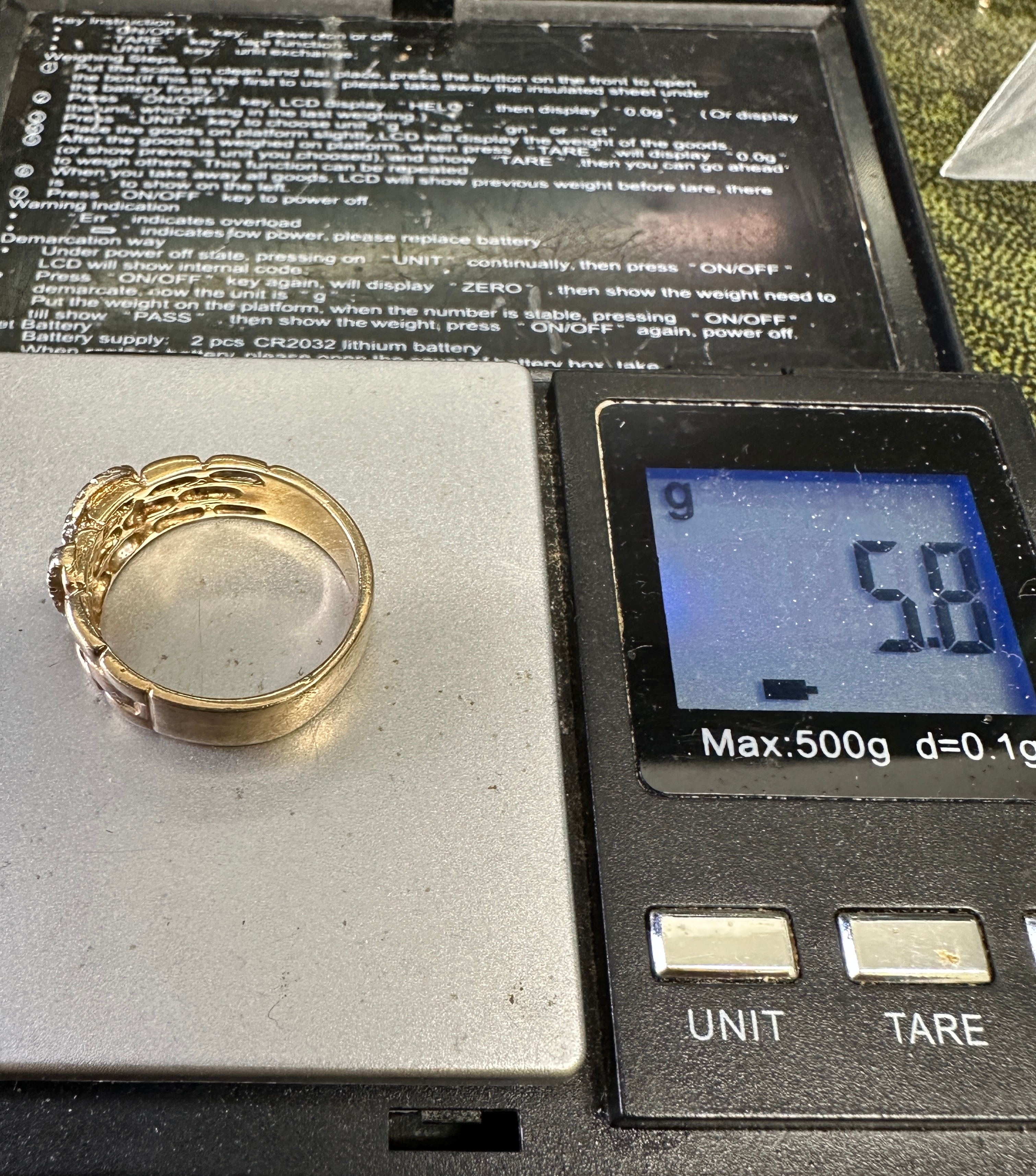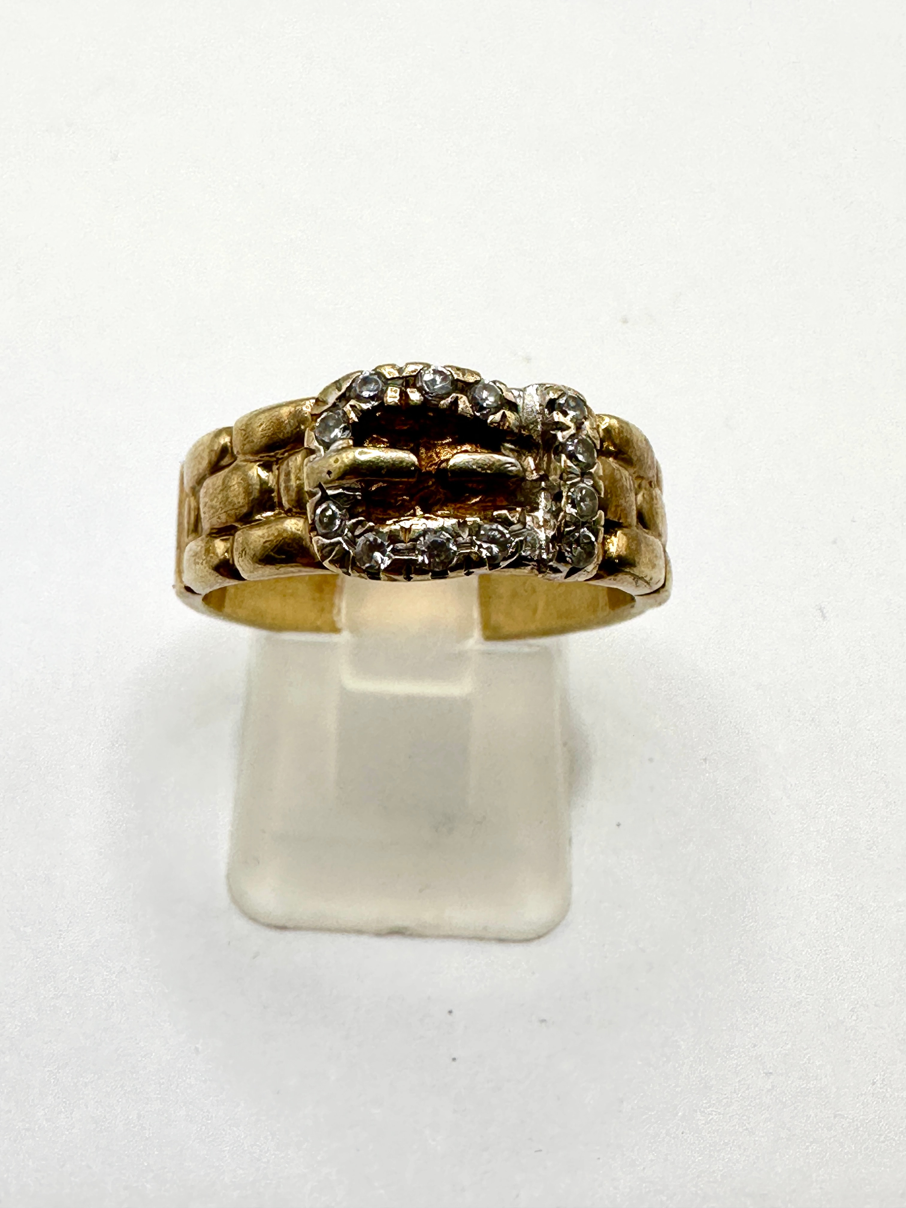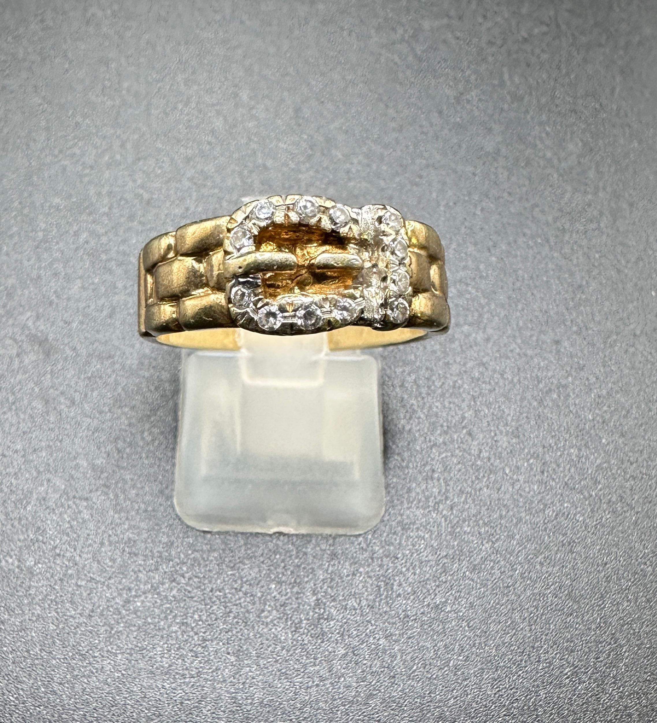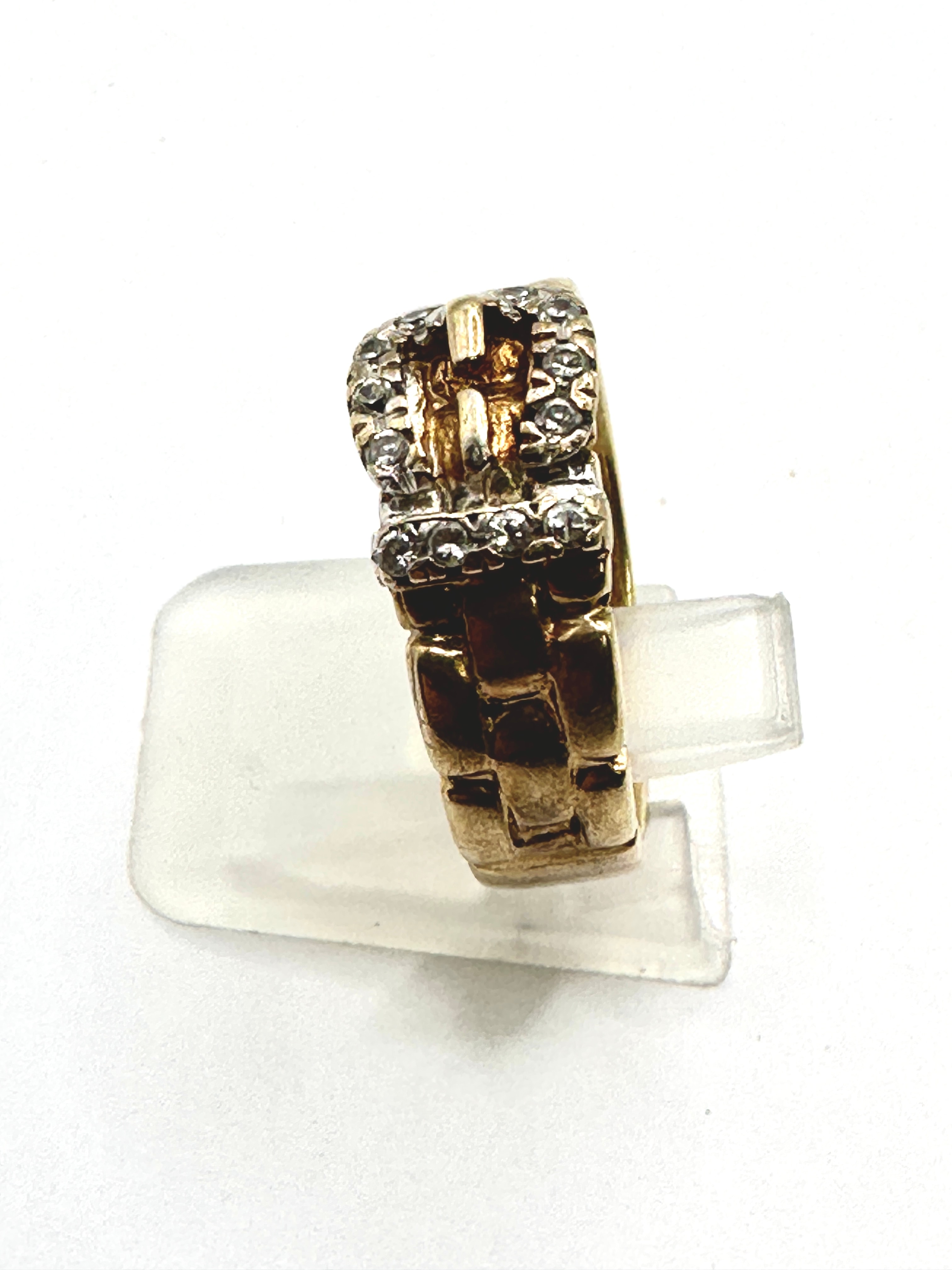 This finger ring is crafted from 9 karat yellow gold, featuring a distinctive central motif in the shape of a belt buckle. The buckle is adorned with numerous small, round, colorless stones, set in a contrasting white metal. The ring’s band exhibits a textured, segmented, or brick-like design, characteristic of the ‘nugget’ style. No legible manufacturer’s marks or inscriptions are visible.
