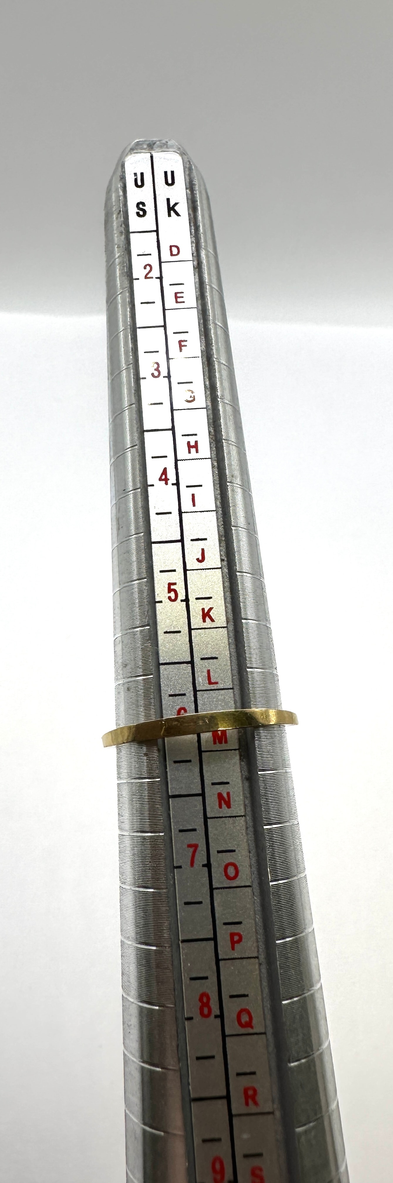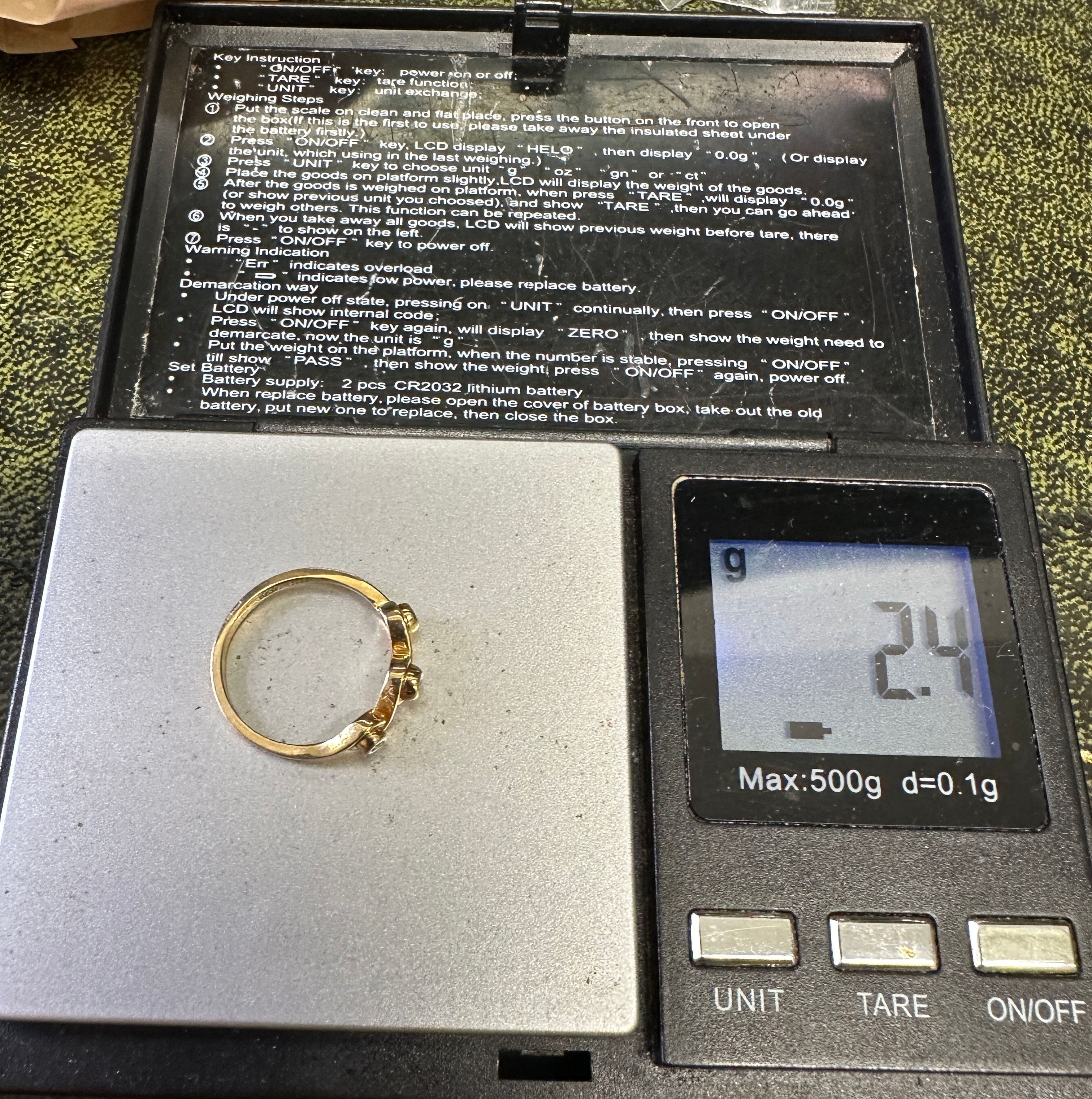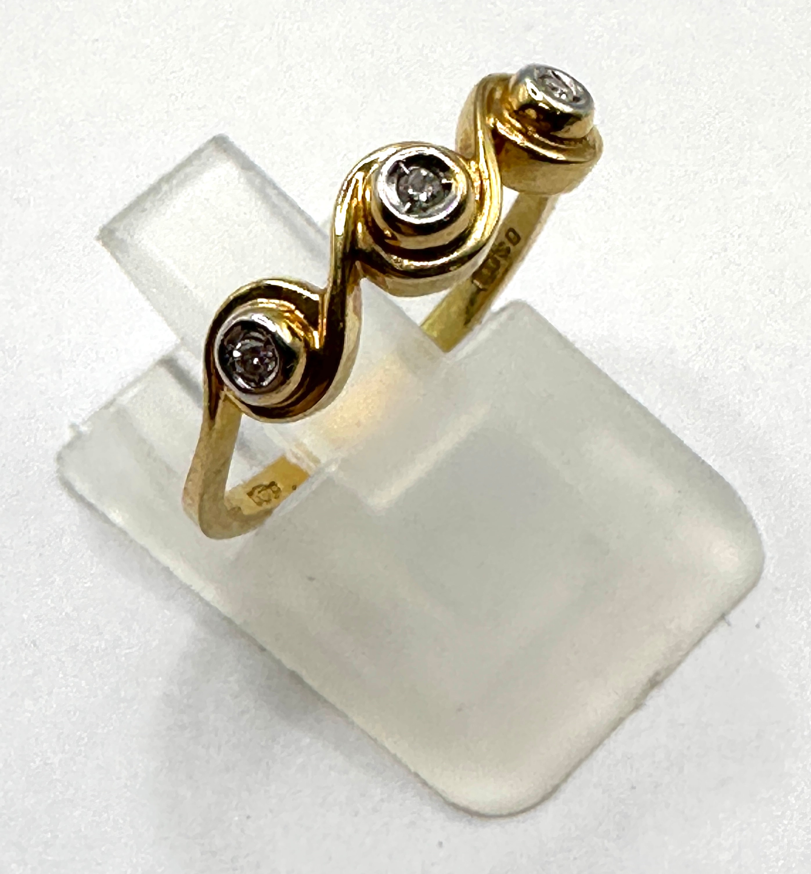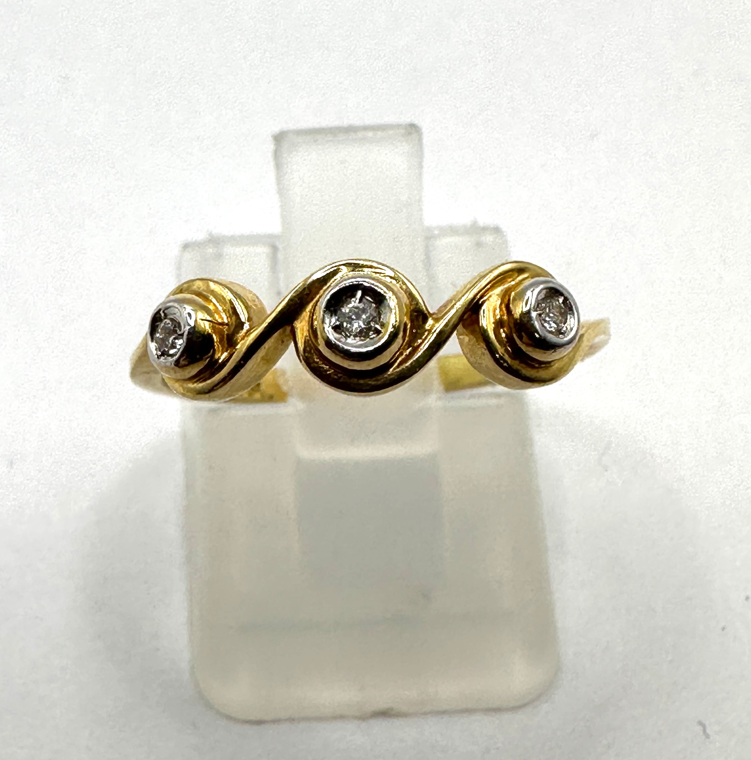 An 18k gold ring featuring a contemporary design with three round white diamonds, individually set within swirling, polished metal motifs. The settings for the diamonds appear to be white metal for contrast. Visible hallmarks on the inner band include a number, potentially “0.50” or “0.80”, alongside another indistinct mark, likely indicating total carat weight.