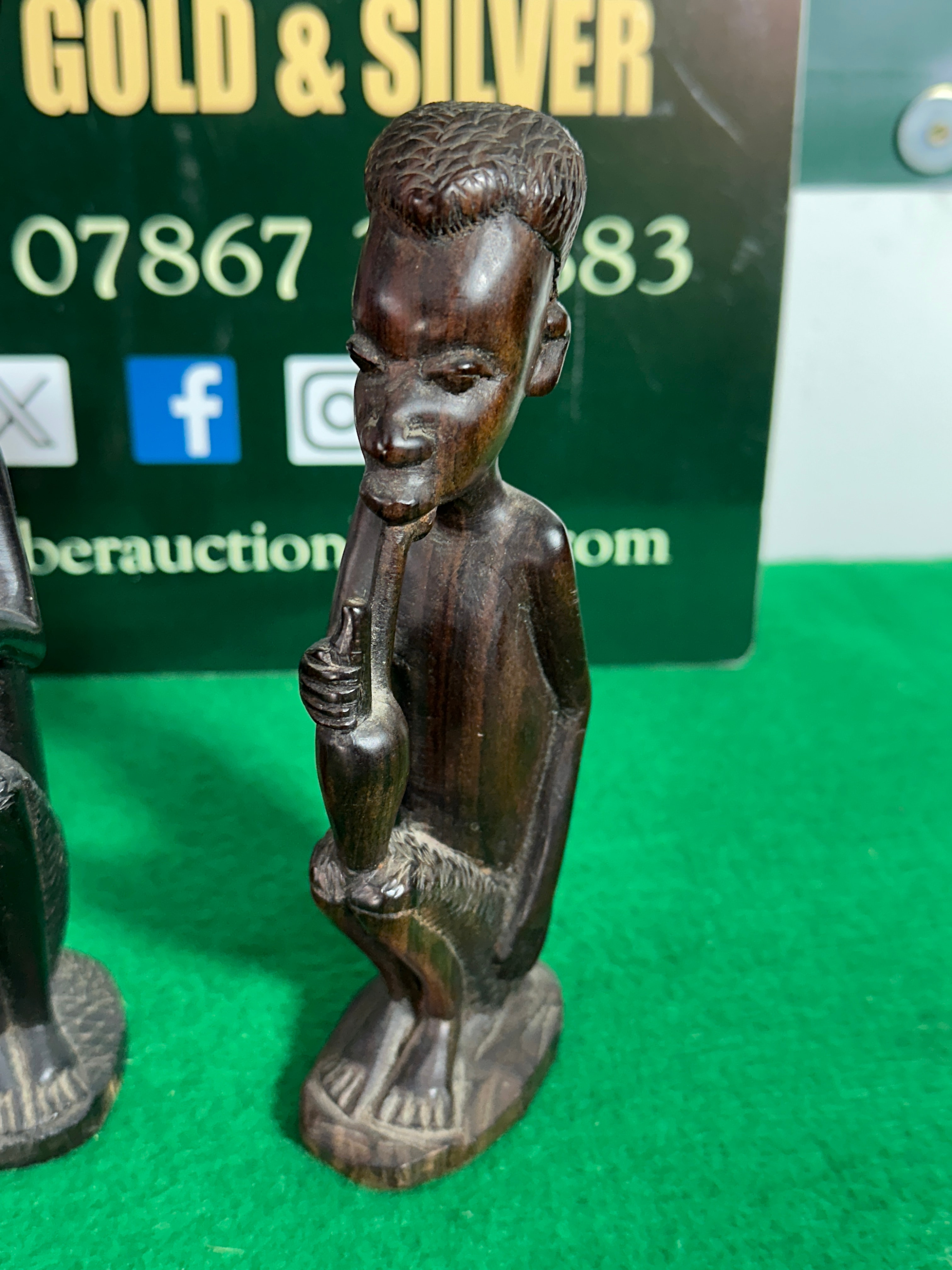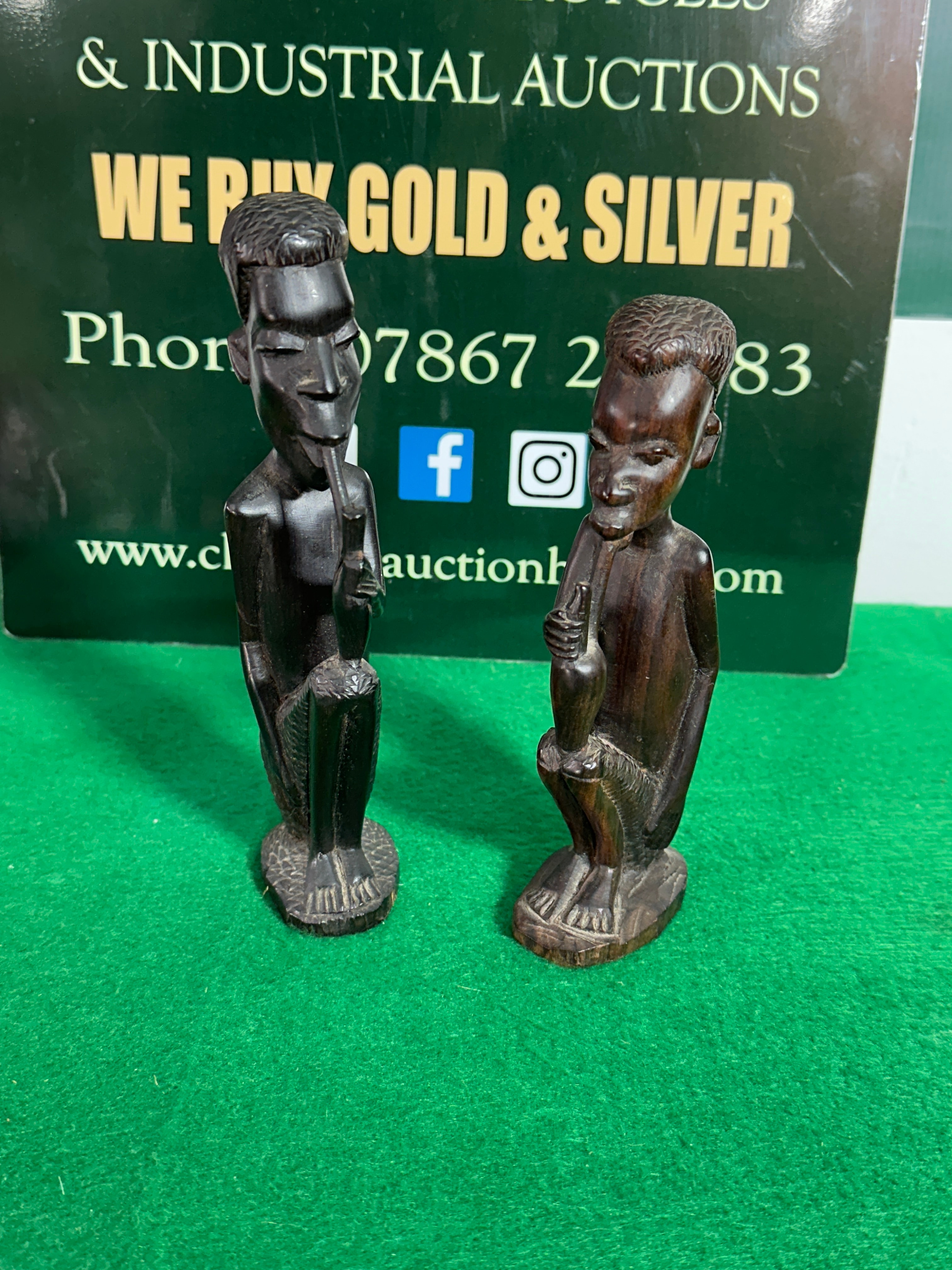 A pair of African Tribal hand-carved ebony wood figural sculptures. Each sculpture depicts a stylized standing male figure with textured, coiffed hair and angular facial features. Both figures are shown holding elongated, pipe-like objects to their mouths. They stand on integrated, oval-shaped bases with carved feet. The wood exhibits a deep brown tone with visible grain. No manufacturer’s marks or textual inscriptions are discernible.