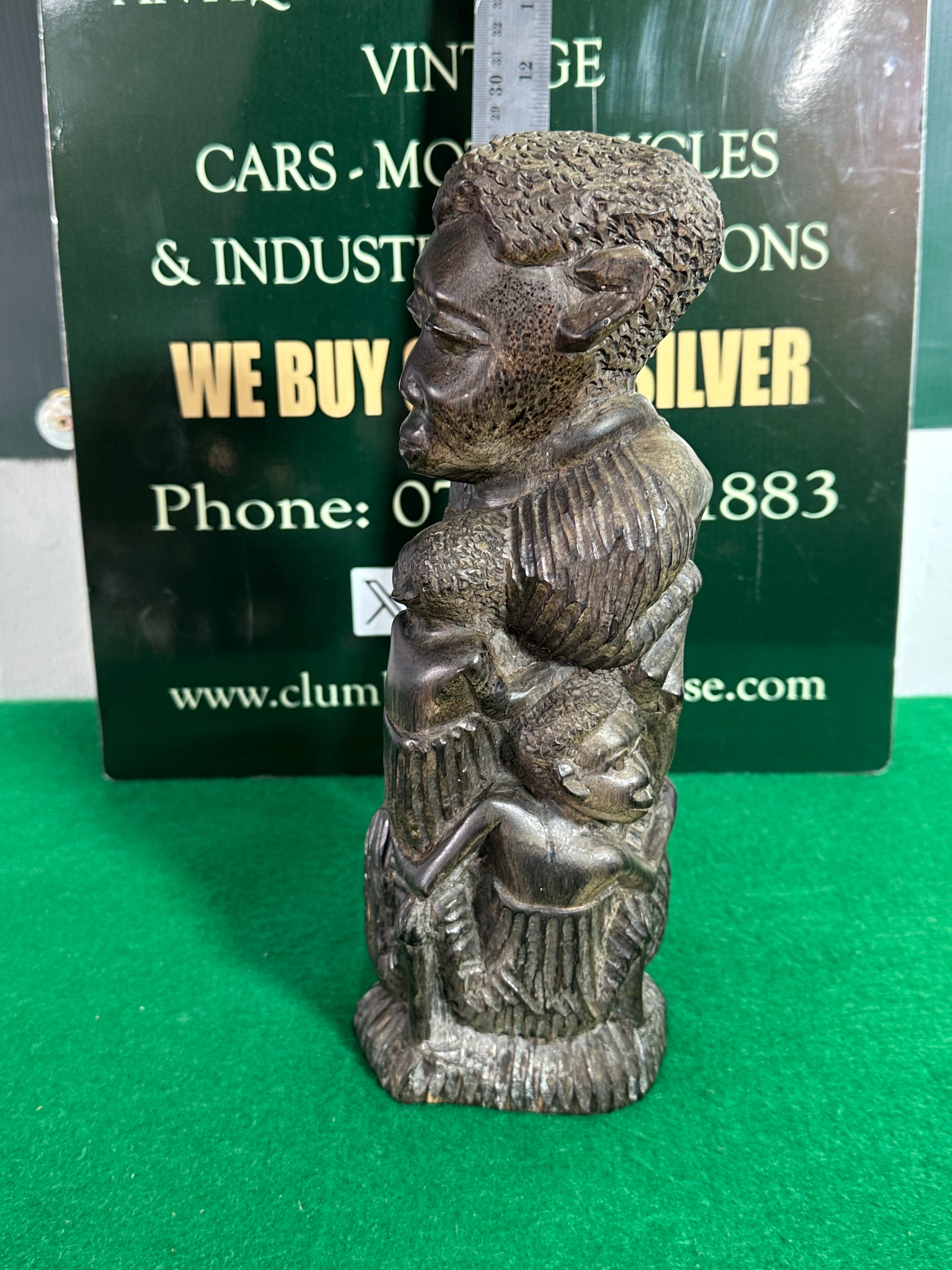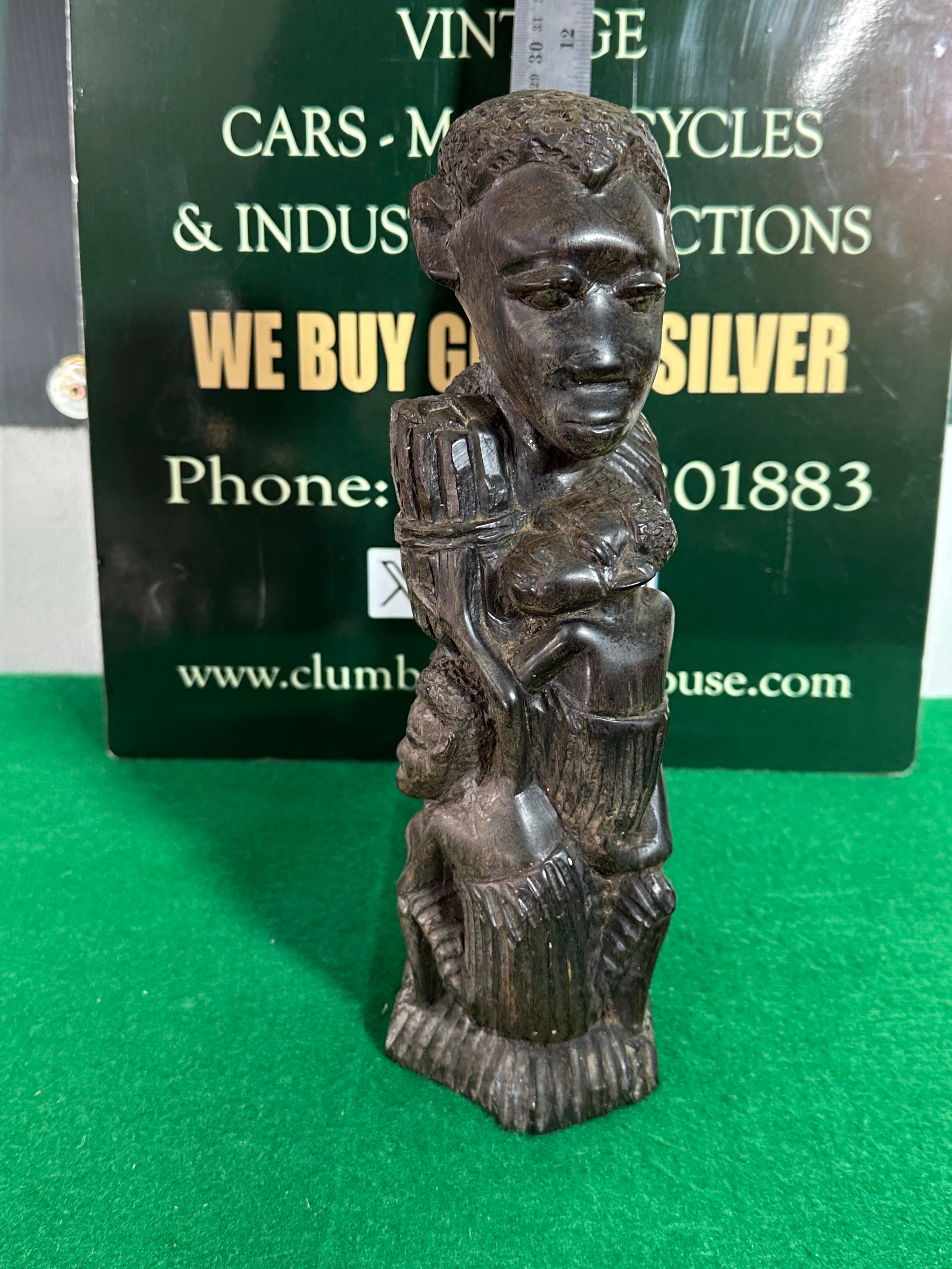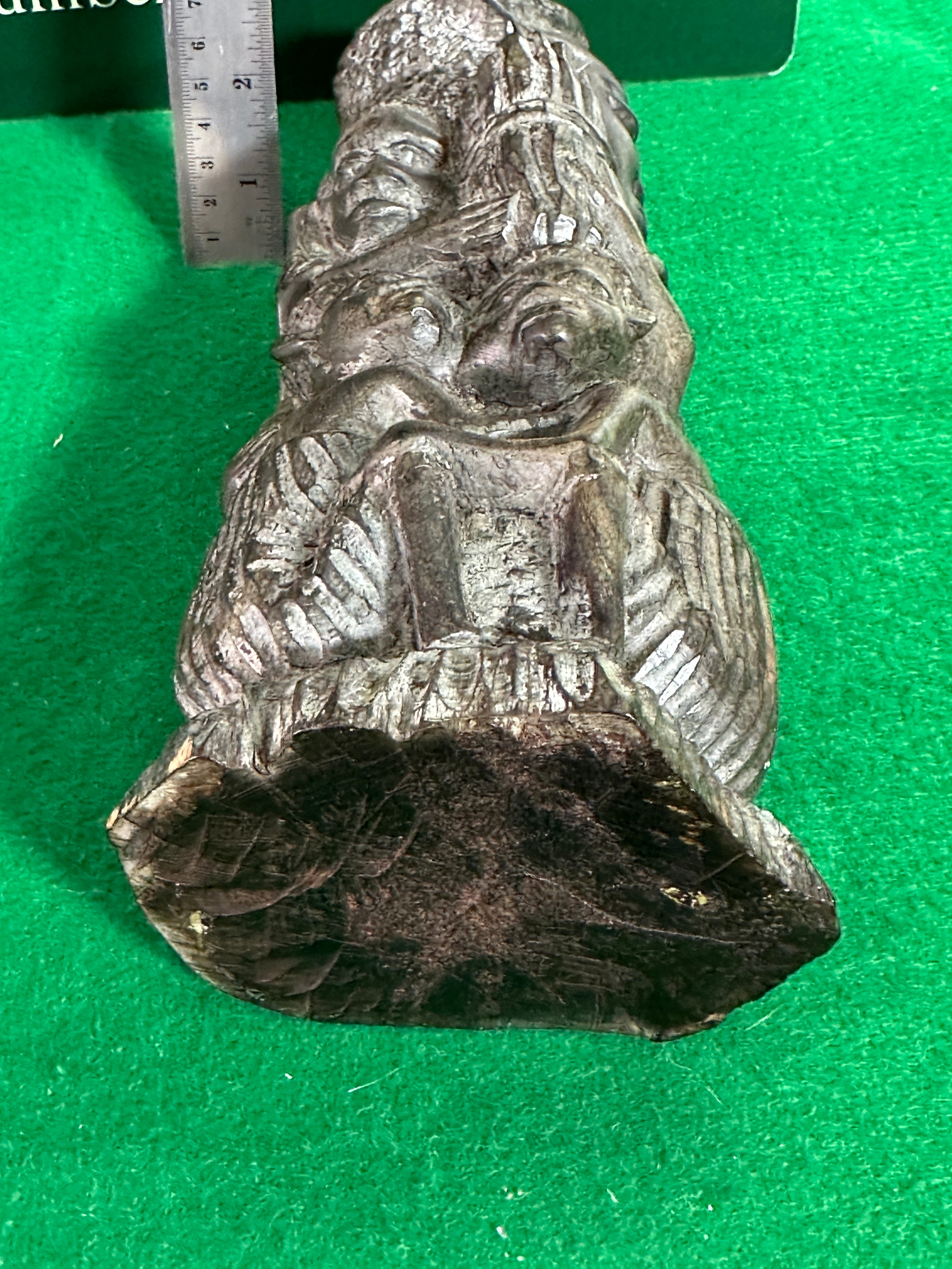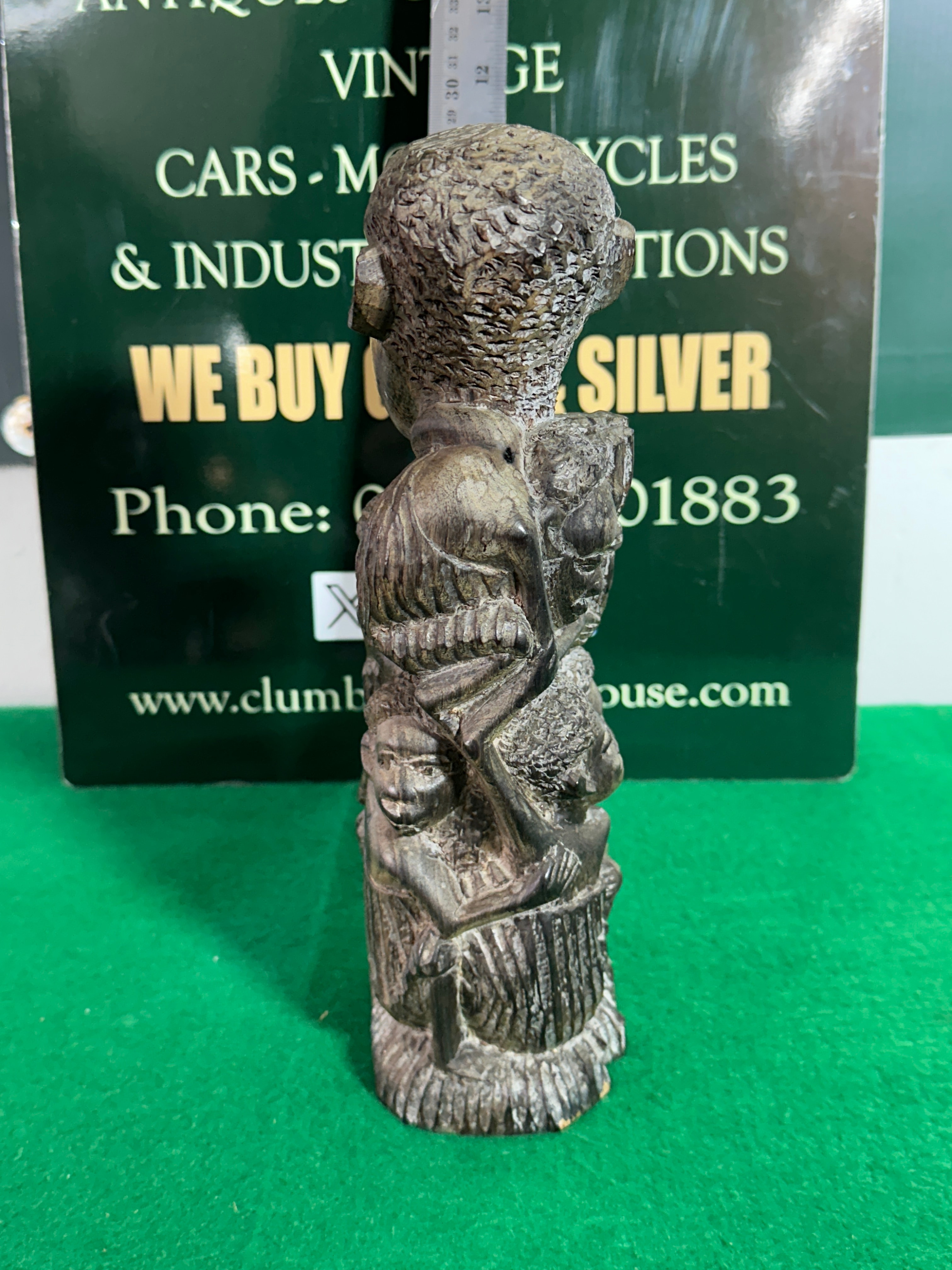 A Makonde African Ebony Wood ‘Tree of Life’ sculpture from Tanzania. This dark, carved wooden sculpture depicts an intertwined or stacked composition of multiple human figures. The style suggests tribal or folk art, characterized by detailed facial features, textured hair, and what appears to be traditional attire or body adornment. The material is dark wood with a somewhat rough finish, suggesting either age or an intentional rustic aesthetic. No discernible text or maker’s marks are present.