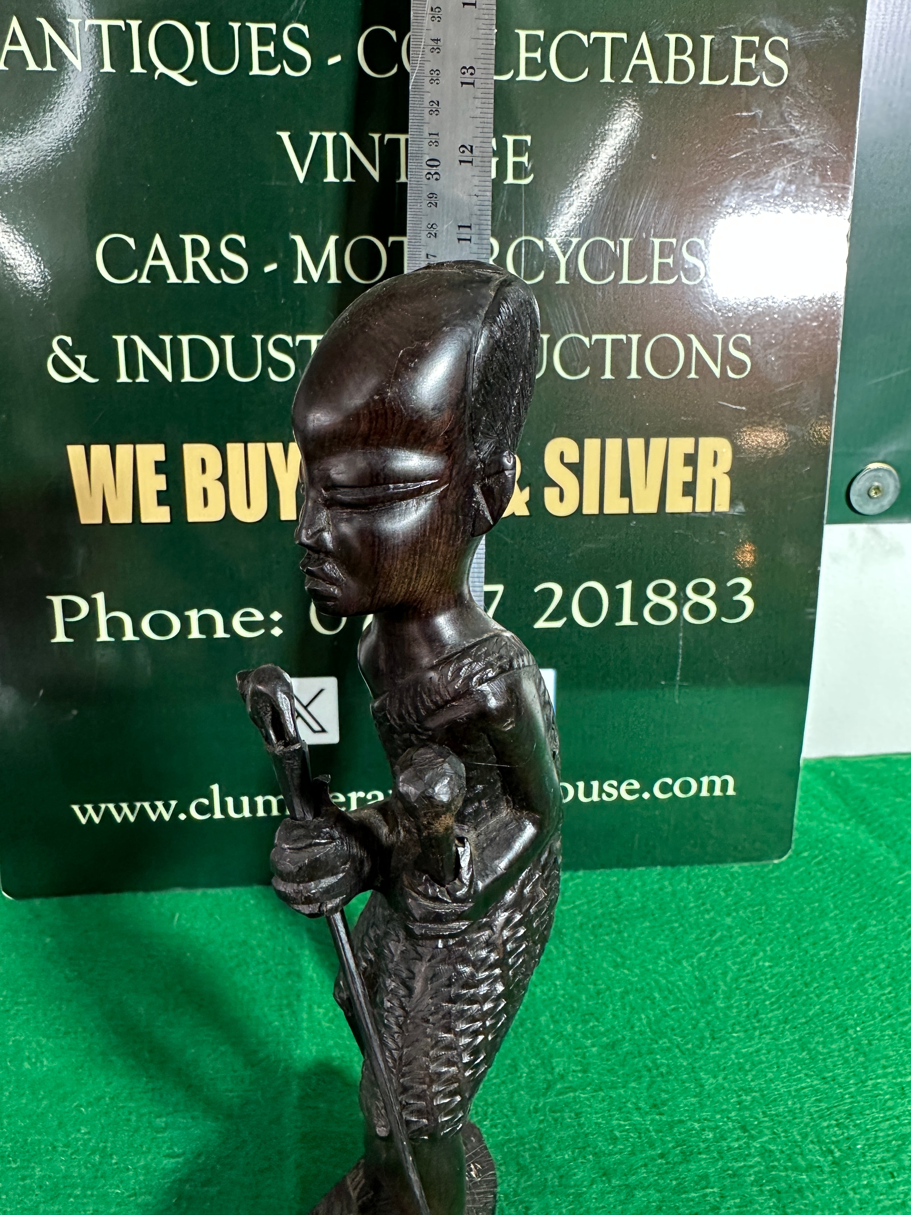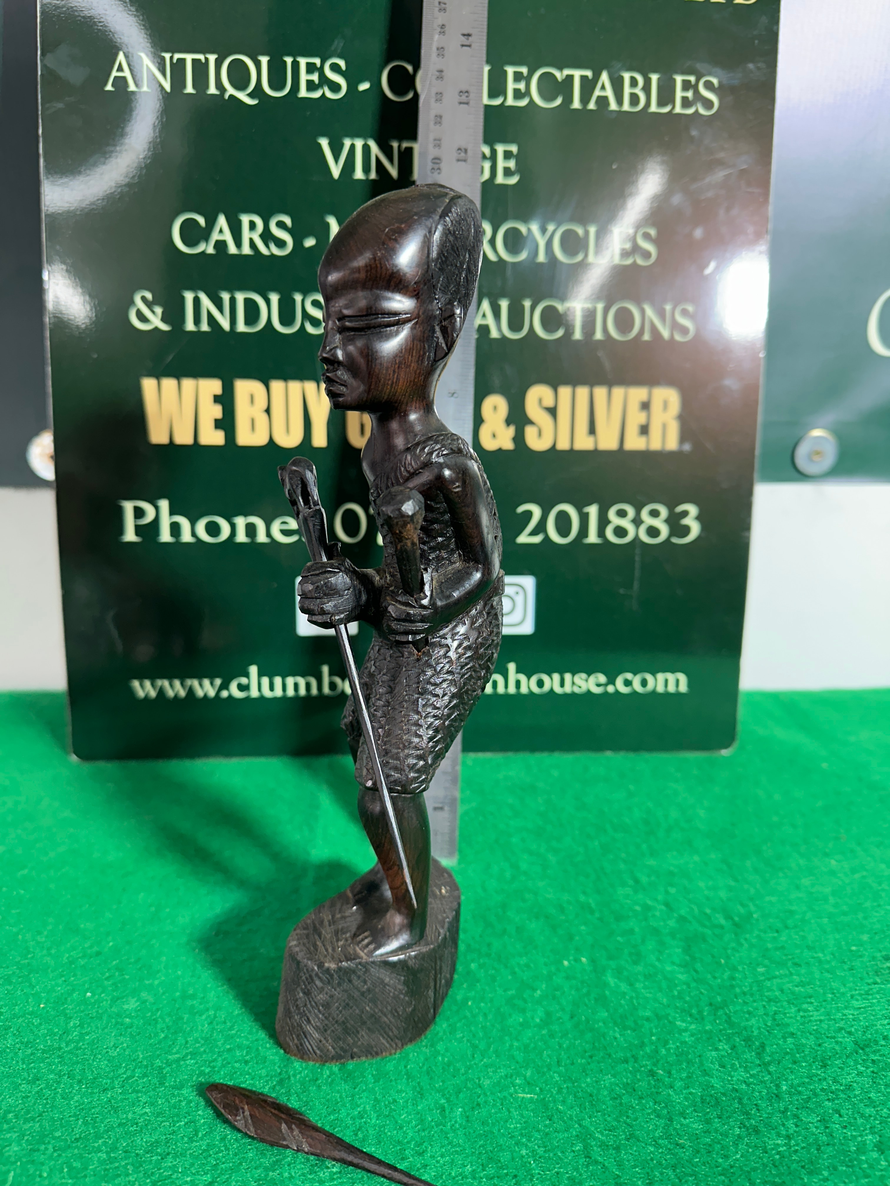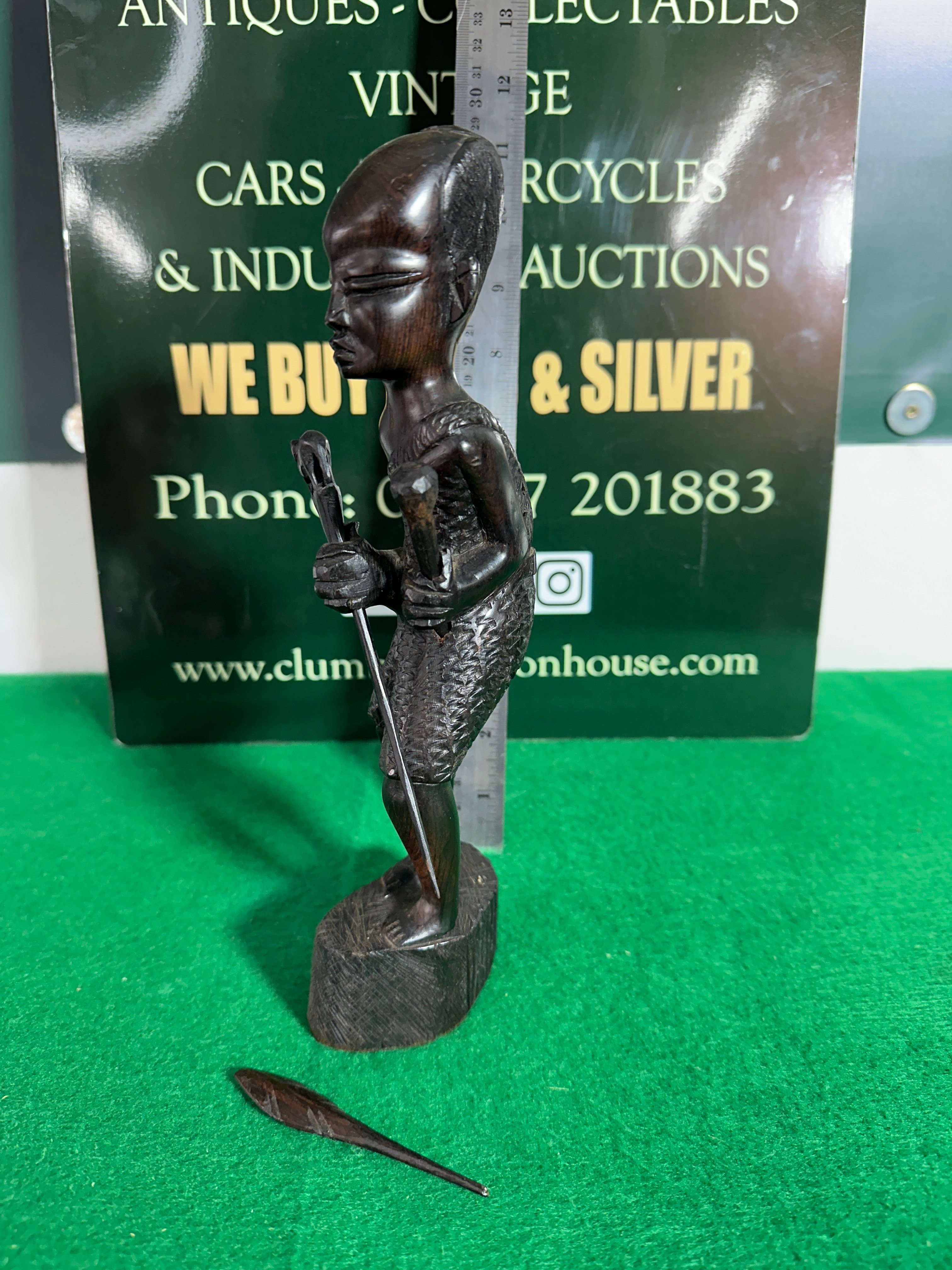 An African carved wood figure depicting a standing human-like form. The figure features a stylized head with a prominent forehead and deep-set eyes, and a textured, patterned lower body suggesting clothing. It holds a staff in one hand and a smaller, indistinct object in the other. A separate, small, pointed wooden element lies at the base of the figure. The figurine stands on a simple, roughly cut wooden plinth and exhibits a polished finish. No specific markings or text are visible on the object itself.