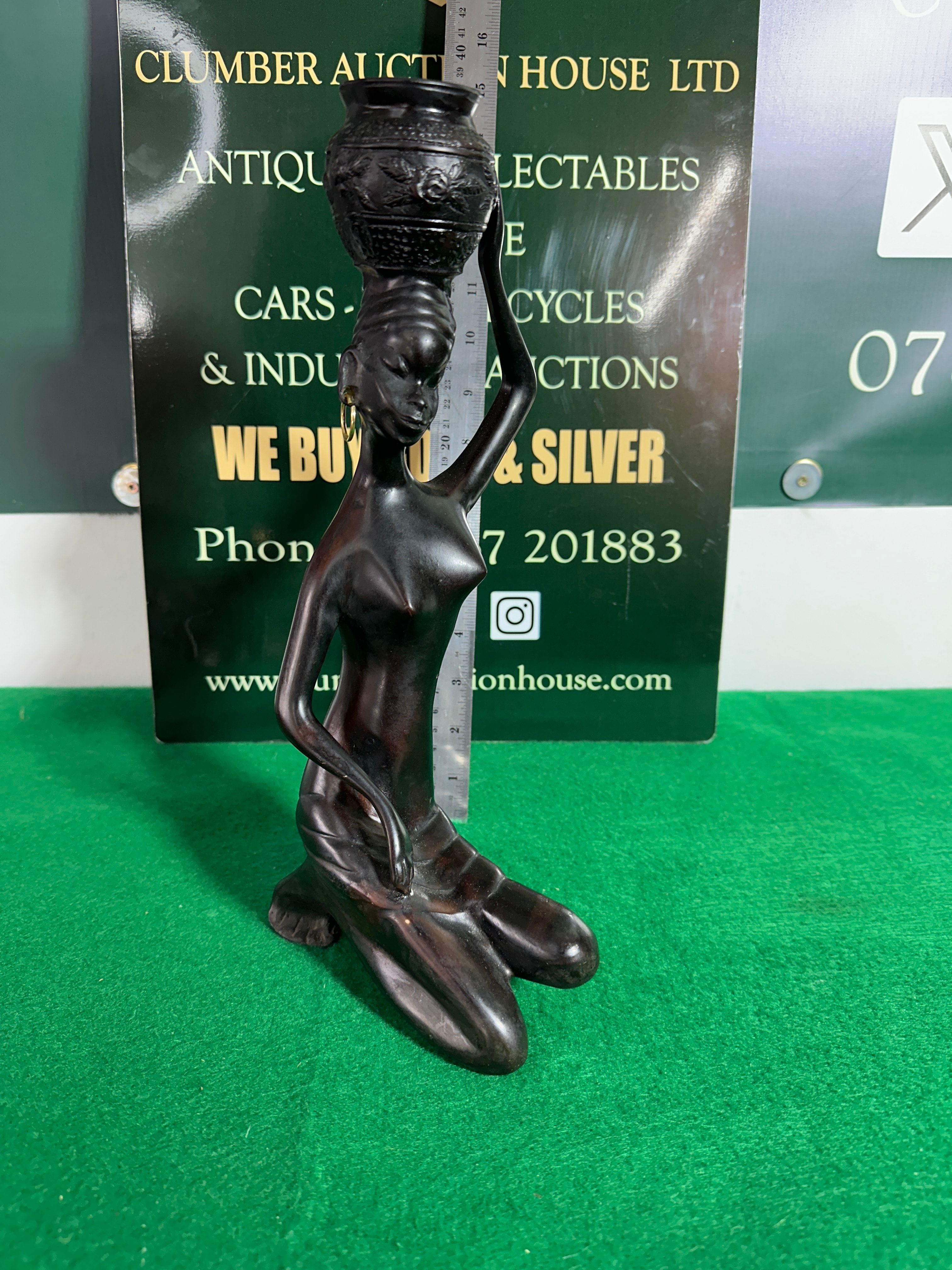 A dark-toned carved wood sculpture depicting a kneeling female figure balancing an ornate pot on her head. The figure is rendered in a stylized, African-inspired manner, featuring simplified forms and elongated limbs. She wears small gold-toned hoop earrings. The pot displays raised, decorative relief patterns, possibly floral or abstract. No specific maker’s marks or text are visible on the sculpture.