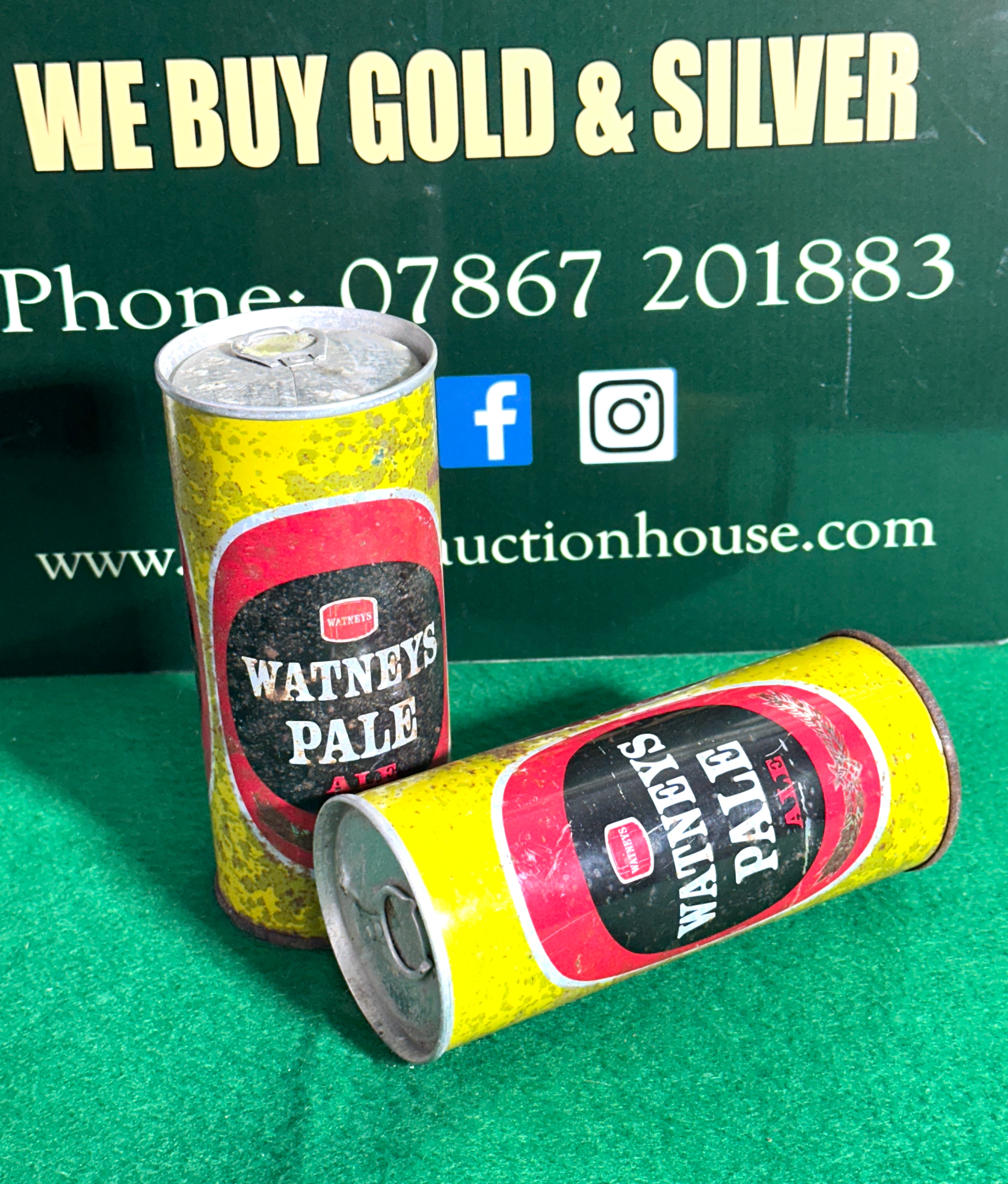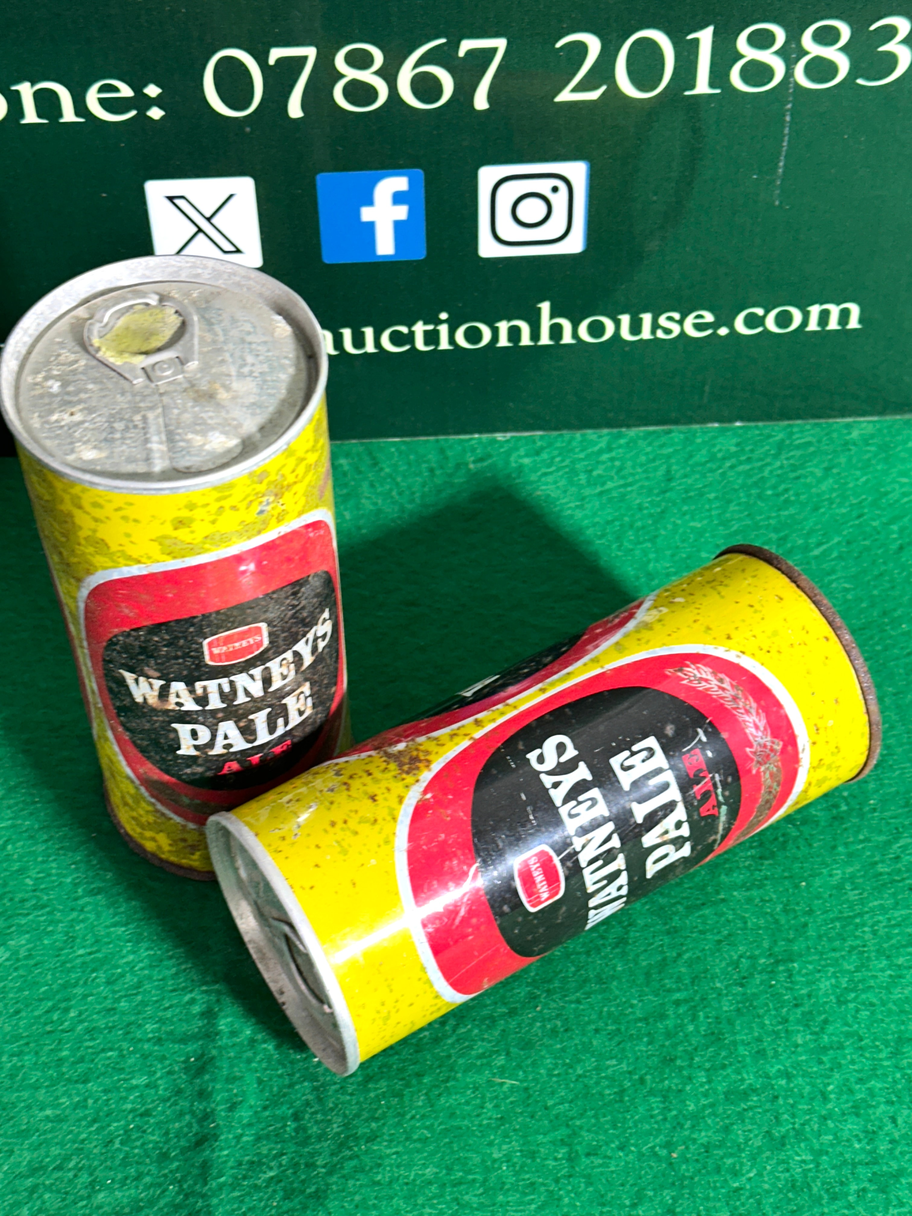 A pair of vintage Watneys Pale Ale beer cans, cylindrical in form and likely constructed from aluminum or steel. Each can features a predominantly yellow background with a central red oval band containing a black rectangular label. The text “WATNEY’S PALE ALE” is displayed in white script, complemented by a smaller red “WATNEYS” logo positioned above. Both cans are equipped with pull-tabs, indicative of a mid-to-late 20th-century production period.