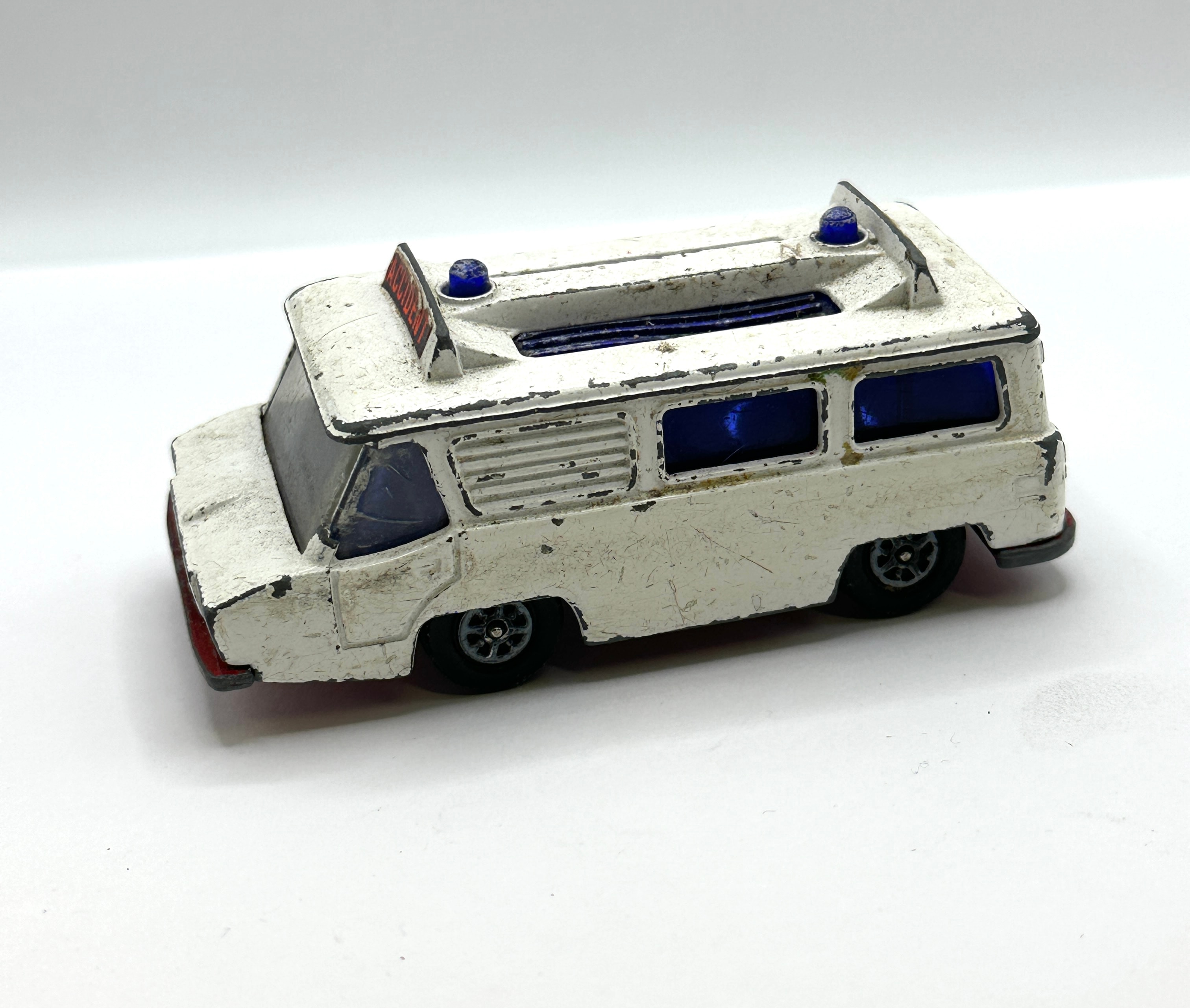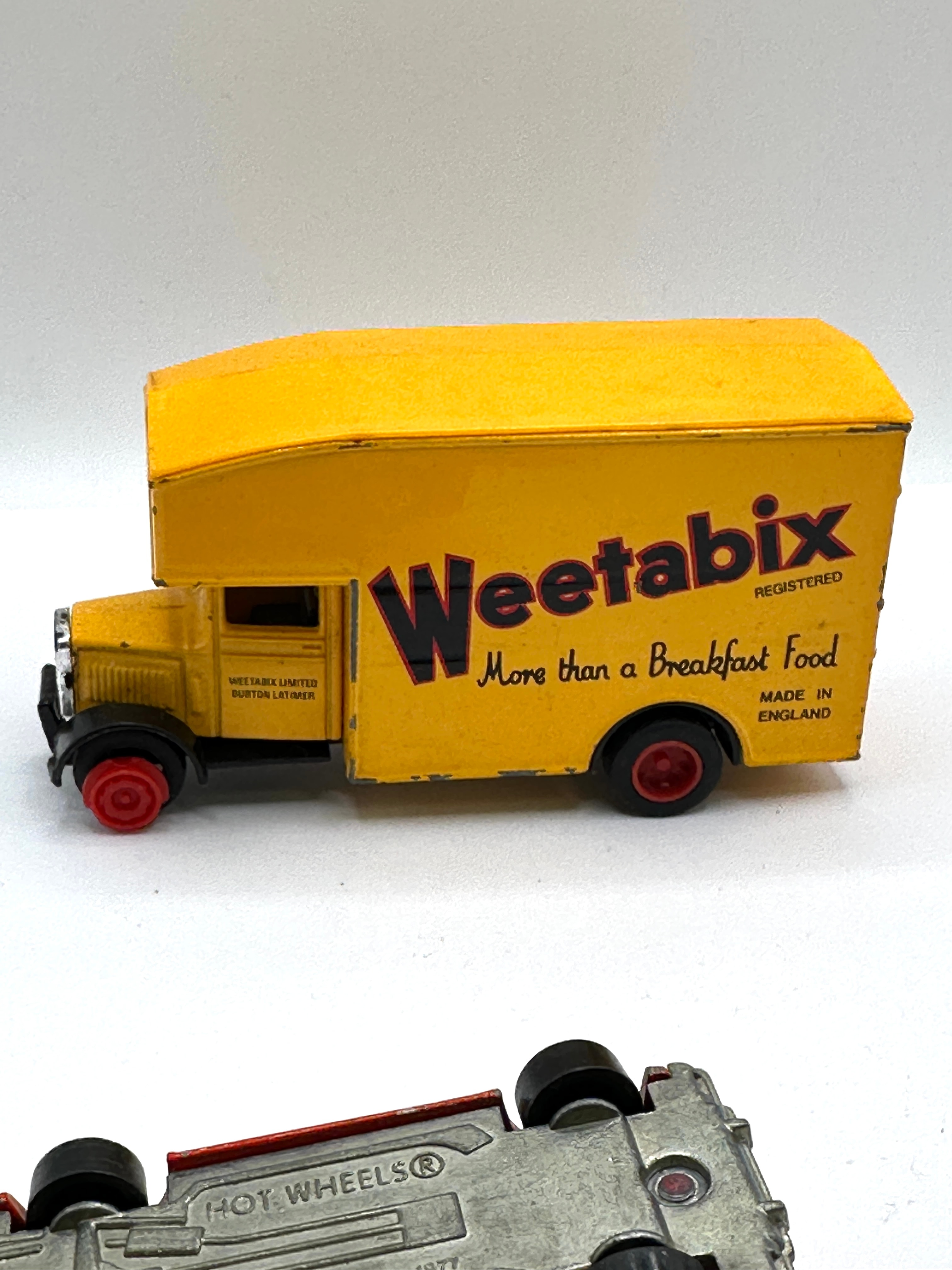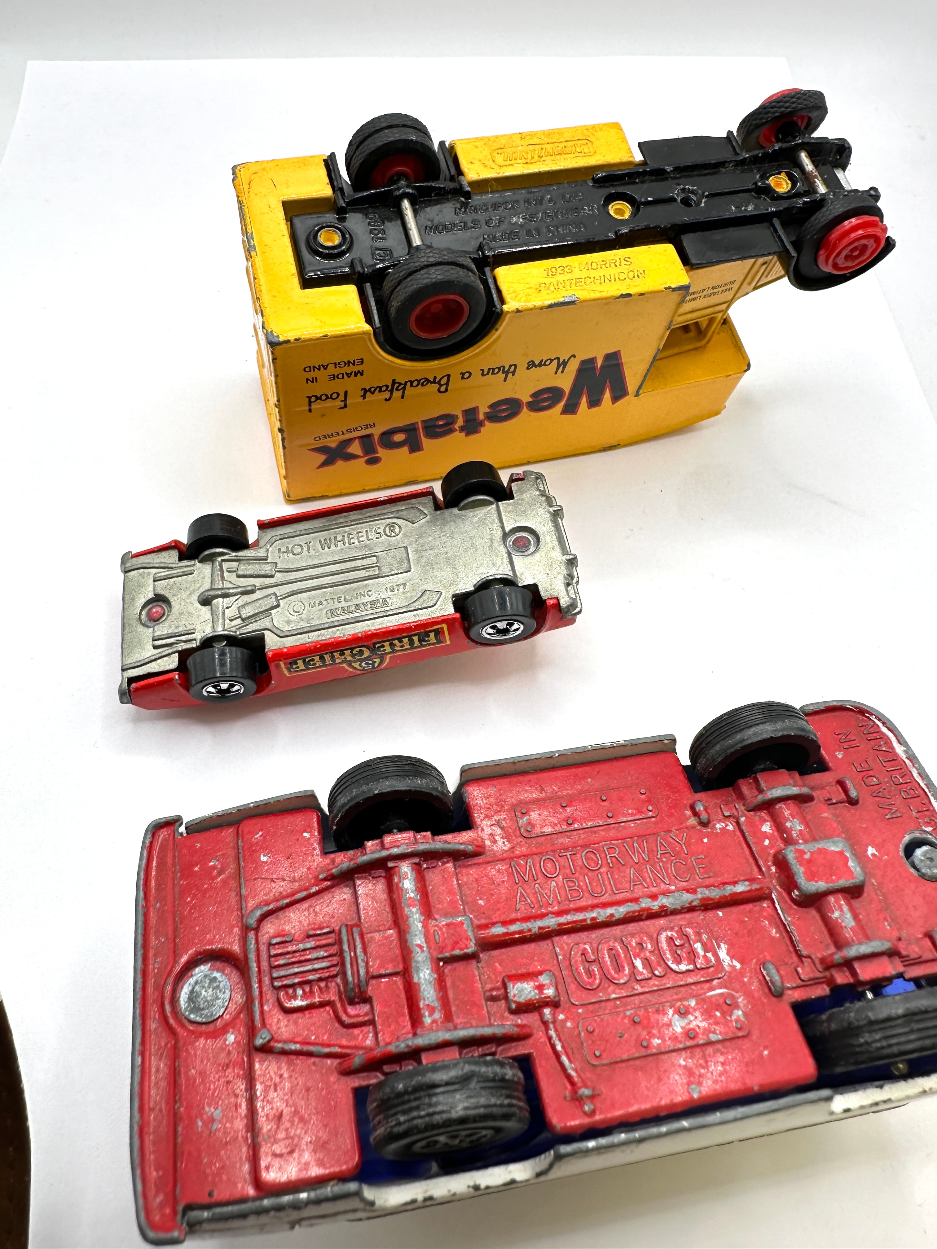 A collection of three vintage die-cast metal toy vehicles. The first is a Matchbox Models of Yesteryear Y31-B 1931 Morris Courier Weetabix Van, a yellow promotional box truck for “Weetabix,” marked “REGISTERED More than a Breakfast Food,” “MADE IN ENGLAND,” and “WEETABIX LIMITED BURTON LATIMER,” with the underside indicating “LESNEY PRODUCTS & CO LTD, MATCHBOX SERIES Nº65.” The second is a red “Fire Chief” sedan with a ‘5’ in a shield on its doors, marked “HOT WHEELS® MATTEL INC. 1977 MALAYSIA” on its base. The third is a white “Motorway Ambulance” van, featuring “ACCIDENT” on its roof sign and “CORGI, MADE IN Gt BRITAIN” on its underside.