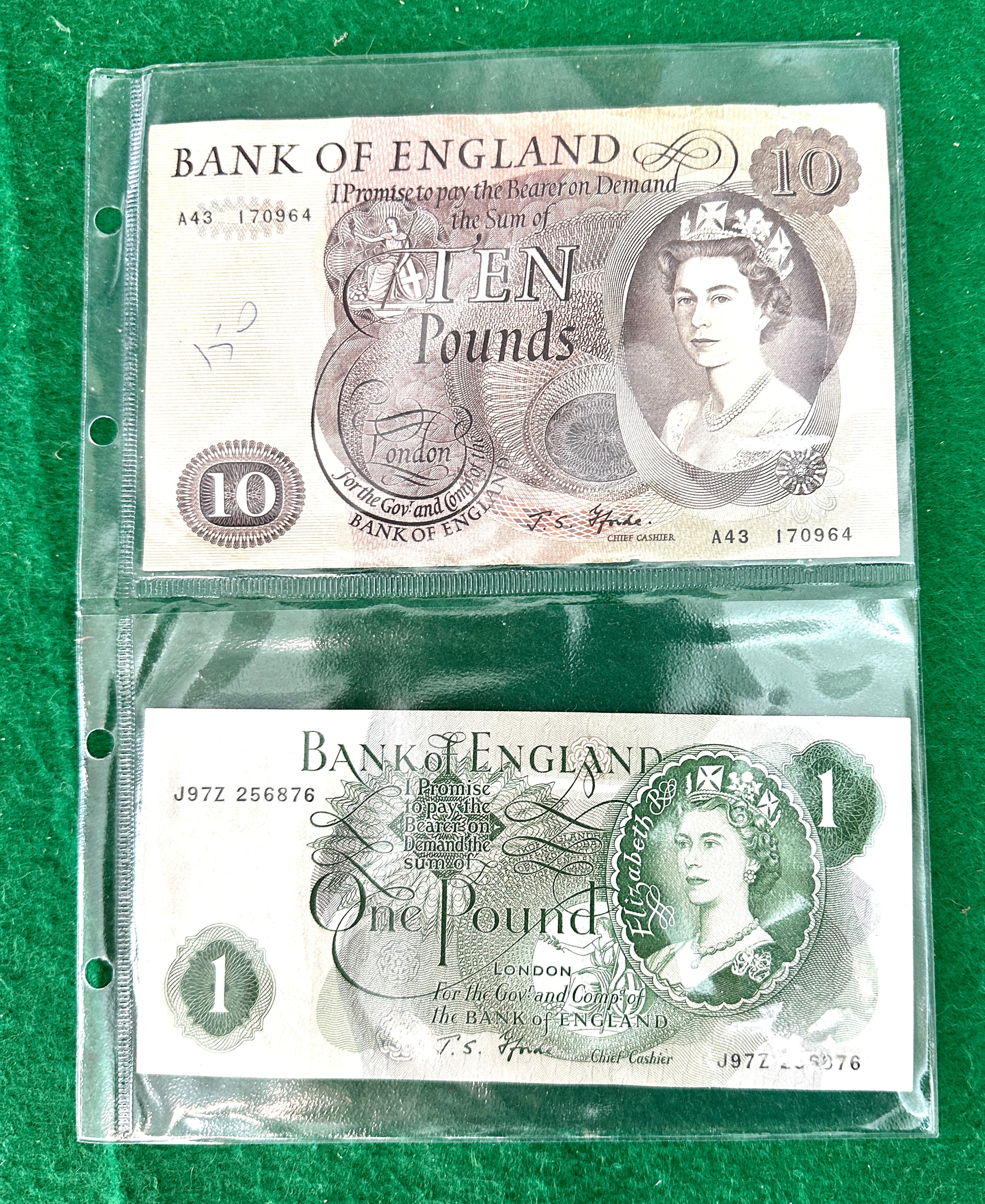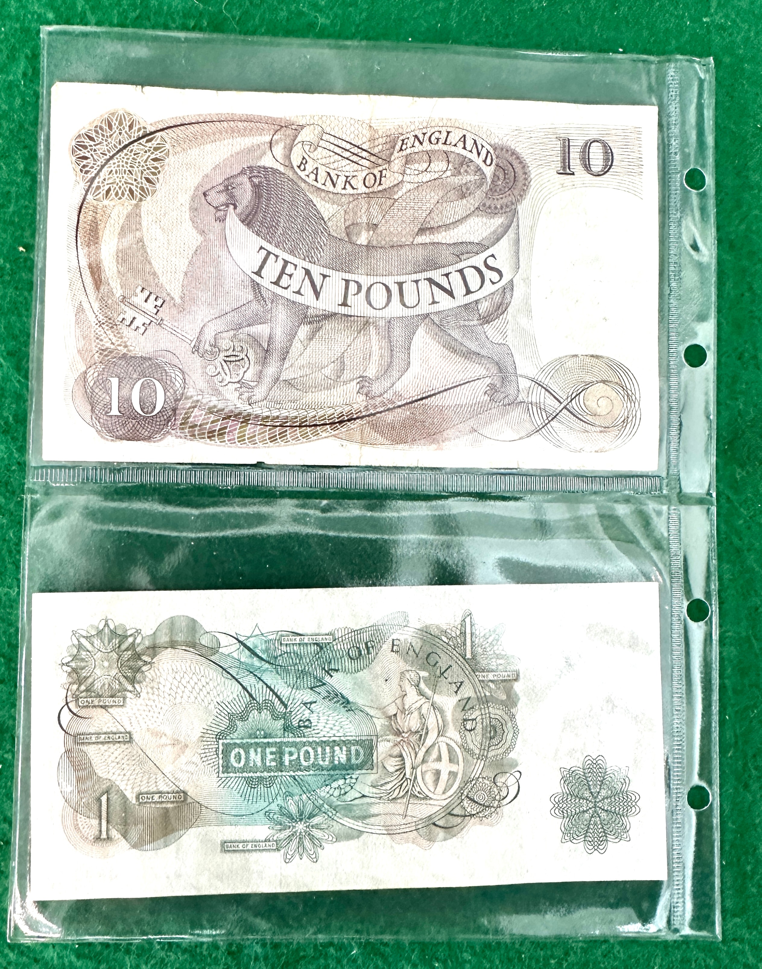 A pair of Bank of England Elizabeth II banknotes. The first is a Ten Pounds denomination, identified as P-376a, issued ND (1964-66). Its obverse features a portrait of Queen Elizabeth II, with text “BANK OF ENGLAND,” “I Promise to pay the Bearer on Demand the Sum of TEN Pounds,” “LONDON,” and a serial number “A43 170964.” The reverse depicts a stylized lion holding a key, marked “BANK OF ENGLAND” and “TEN POUNDS.” The second note is a One Pound denomination, identified as Series C, issued 1966-70, with J. S. Fforde as Chief Cashier. Its obverse also features a portrait of Queen Elizabeth II, with text “BANK OF ENGLAND,” “I Promise to pay the Bearer on Demand the Sum of ONE Pound,” “LONDON,” and a serial number “J97Z 256876.” The reverse shows a seated Britannia figure with a shield and spear, marked “BANK OF ENGLAND” and “ONE POUND.” Both notes are printed on paper and are housed in clear plastic protective sleeves within a multi-pocket binder page.