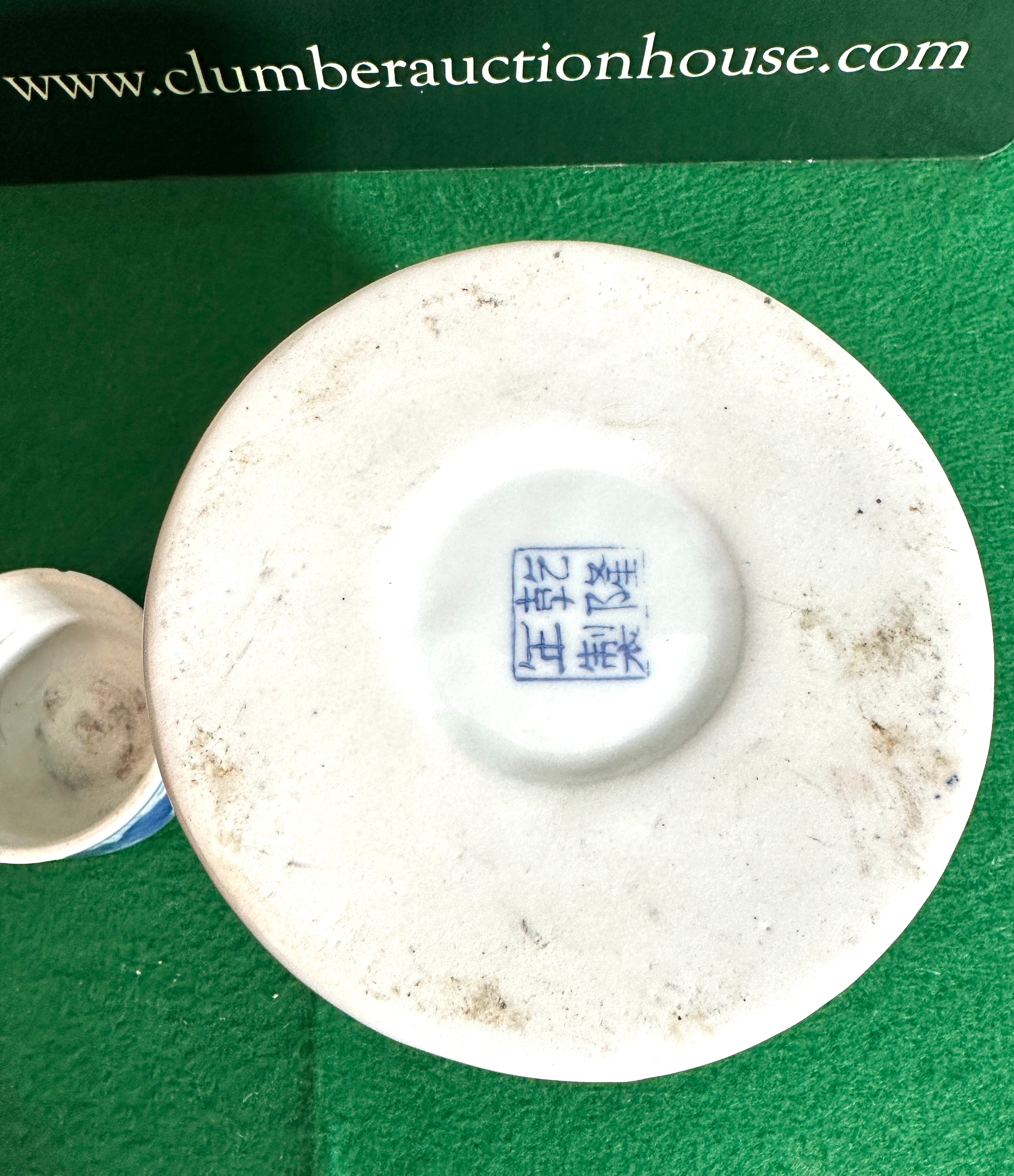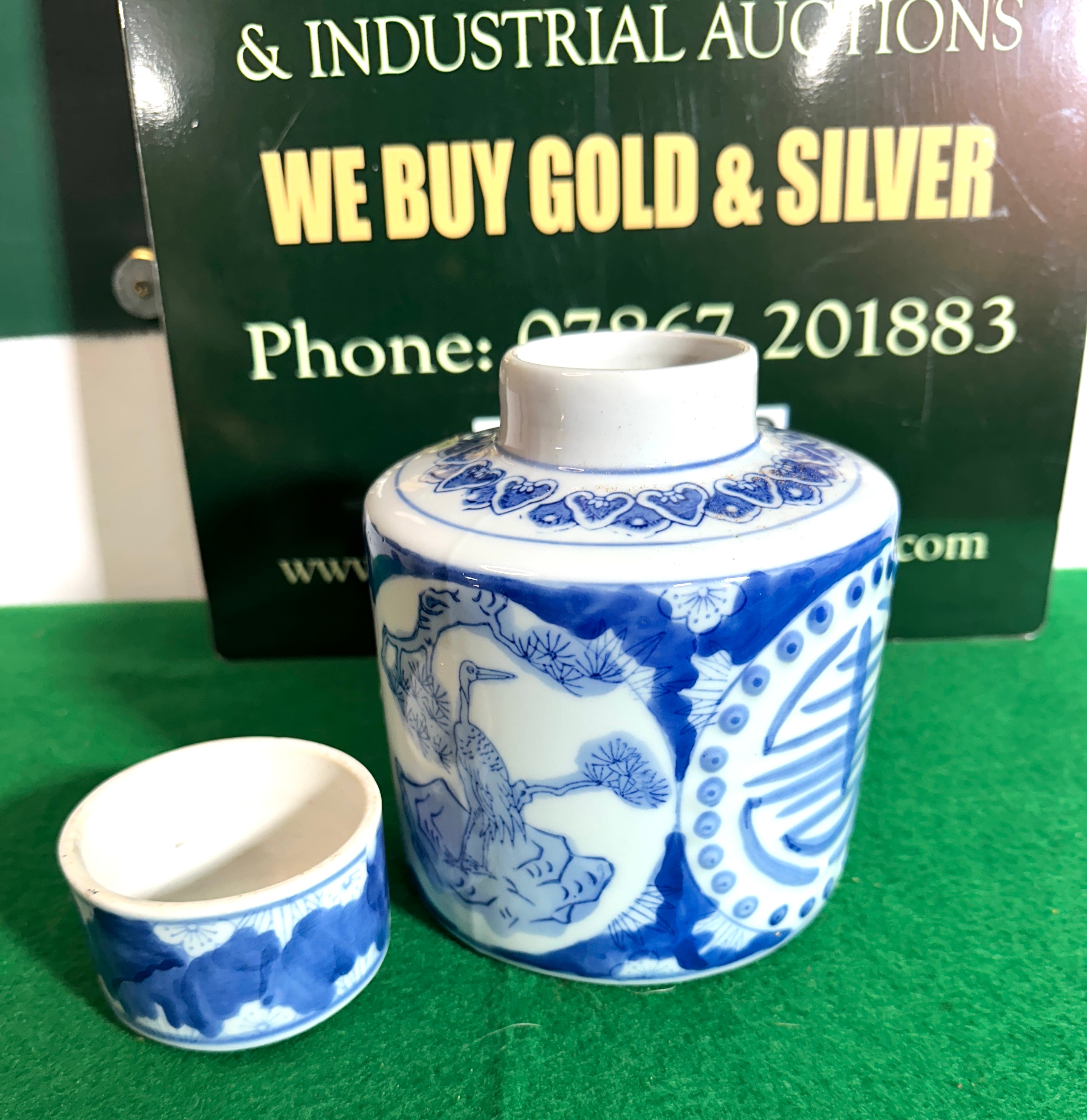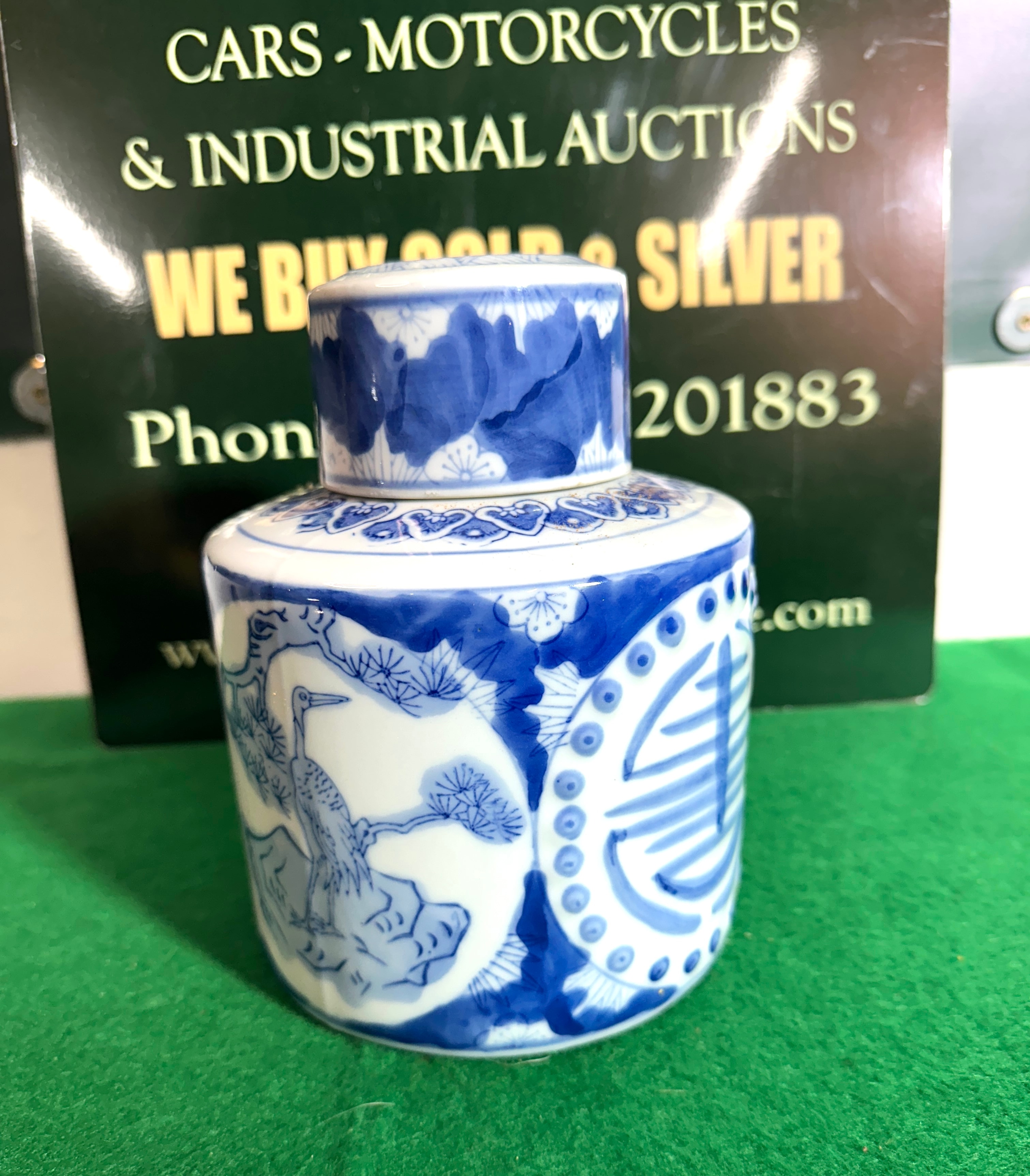 A Chinese Blue and White Porcelain ‘Double Happiness Cranes’ Ginger Jar, Qing Dynasty. This lidded cylindrical porcelain jar features underglaze cobalt blue decoration on a white ground. The ornamentation includes a scenic panel depicting a crane beside a pine tree, a roundel with stylized calligraphic or symbolic elements, and various abstract patterns. The separate lid is also decorated with blue abstract motifs. The base of the jar bears a blue underglaze four-character mark, ‘乾隆年製’ (Qiánlóng Niánzhì), translating to ‘Made in the Qianlong reign’.