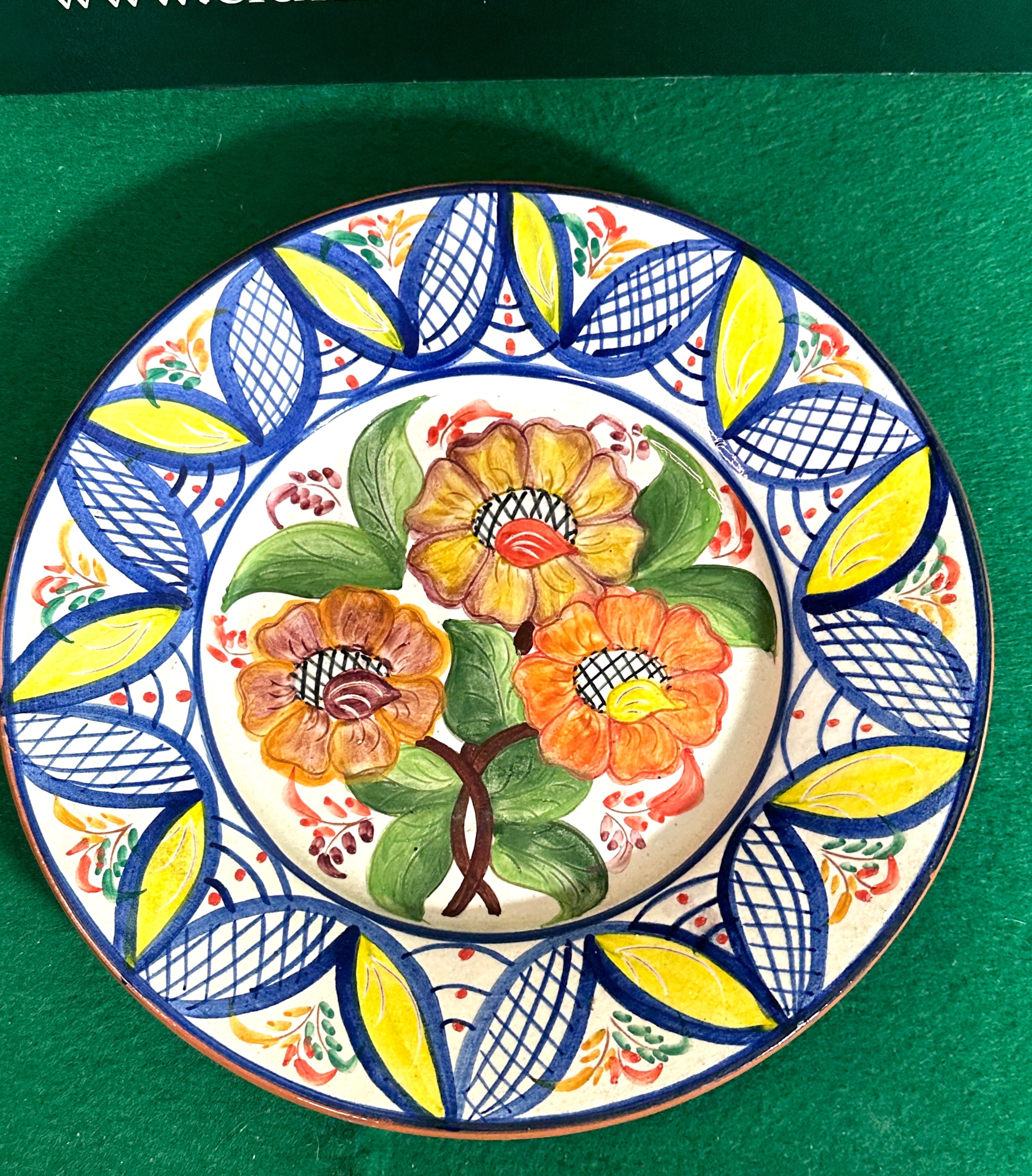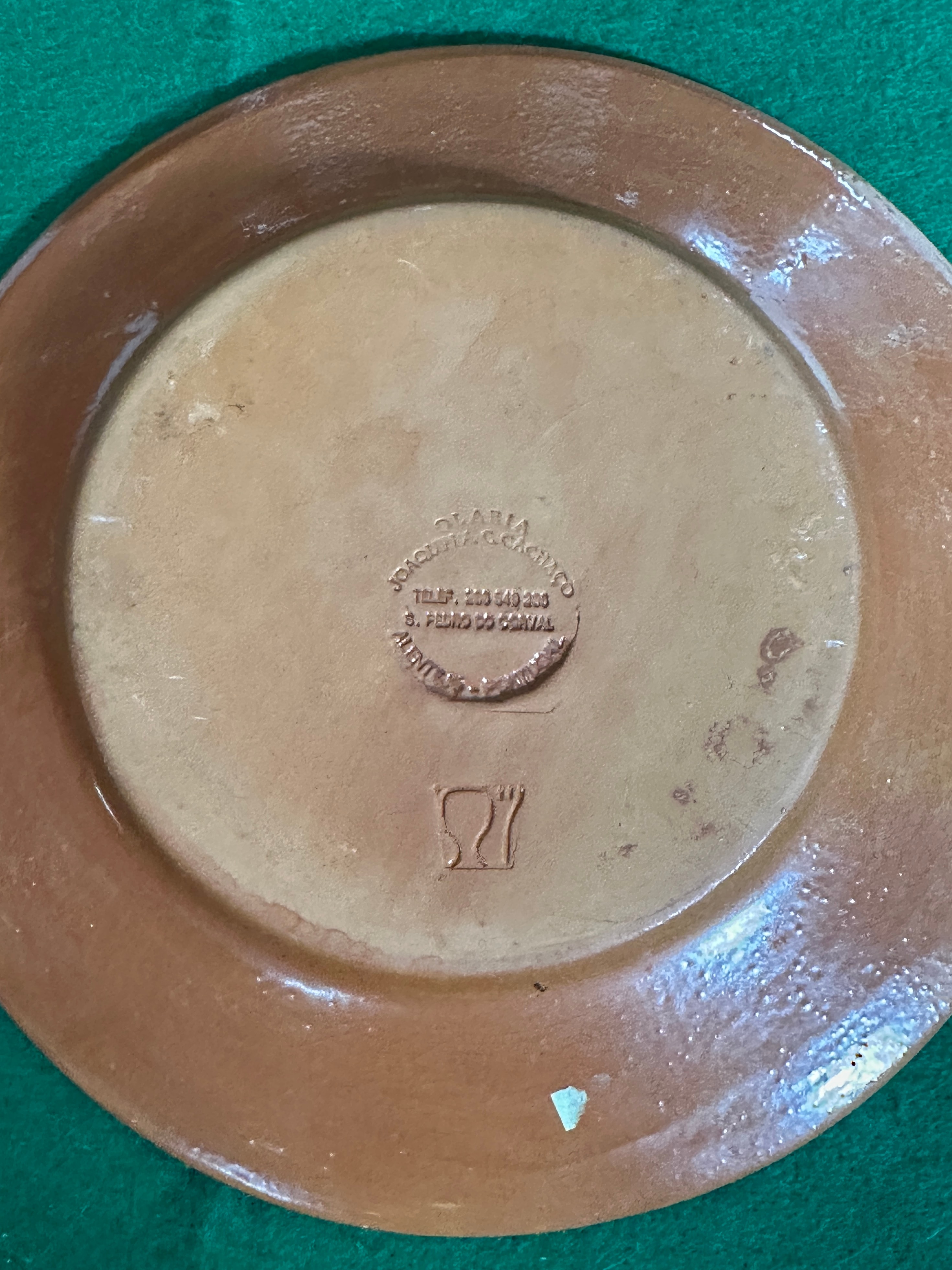 A hand-painted ceramic decorative plate or charger, crafted from reddish-brown earthenware by Olaria Joaquim C. Páscoa. The front features a vibrant folk art style, centrally adorned with three large, stylized flowers in yellow and orange hues, surrounded by green leaves and small red berries. The broad rim showcases an alternating pattern of blue cross-hatched and solid yellow leaves on a white ground with small red accents. The reverse reveals an unglazed terracotta body with impressed markings: “OLARIA JOAQUIM C. PÁSCOA”, “TELEF. 233 919 233”, “S. PEDRO DO CORVAL”, and a distinct stylized symbol.
