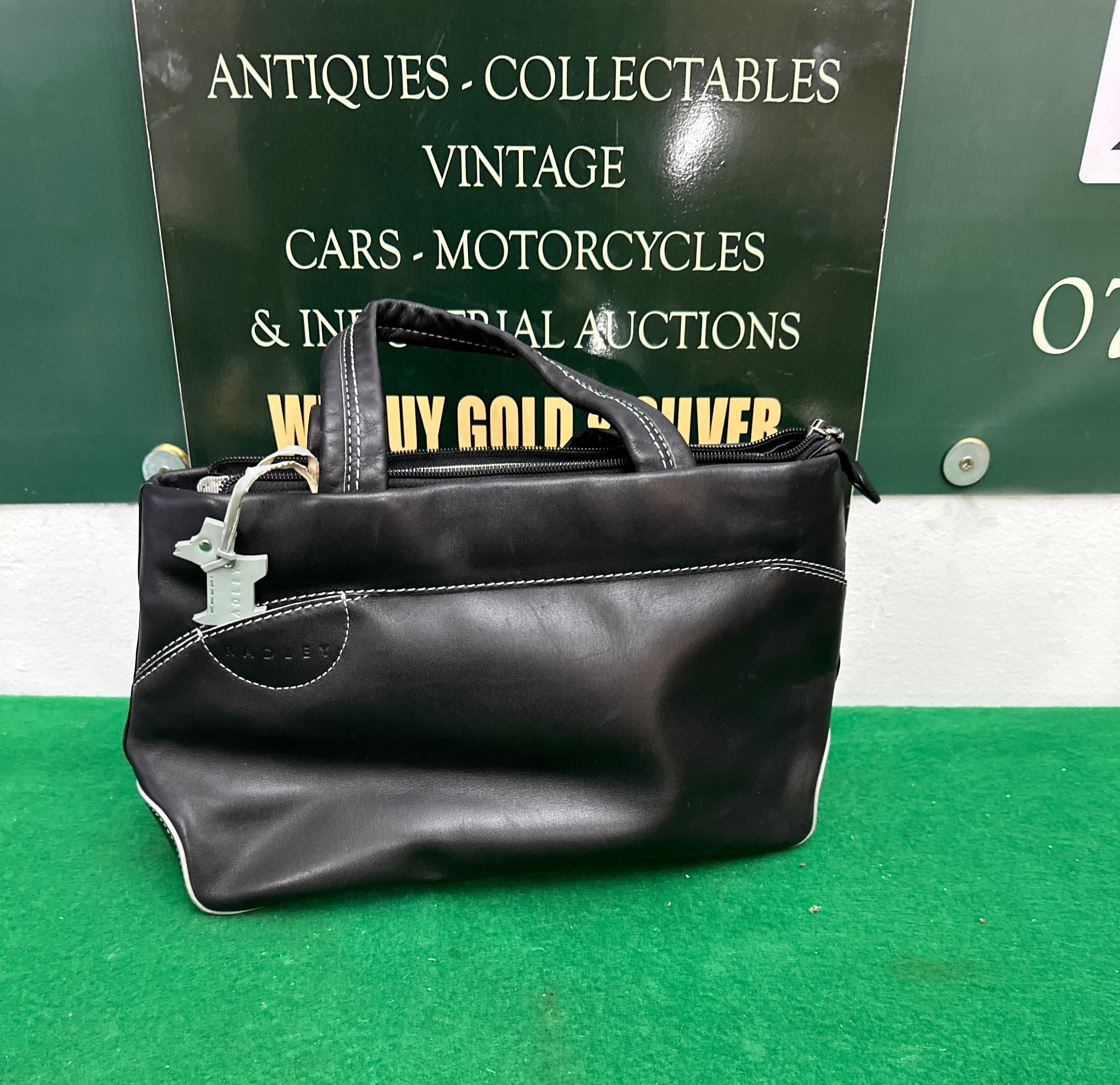 A Radley black leather handbag. This contemporary handbag features a generally rectangular form with twin top handles and a top zipper closure. It is accented with visible white contrast stitching. The front of the bag displays an embossed ‘RADLEY’ logo, and it is adorned with a pale green leather bag charm shaped like Radley’s signature Scottie dog, which also bears the ‘RADLEY’ name.