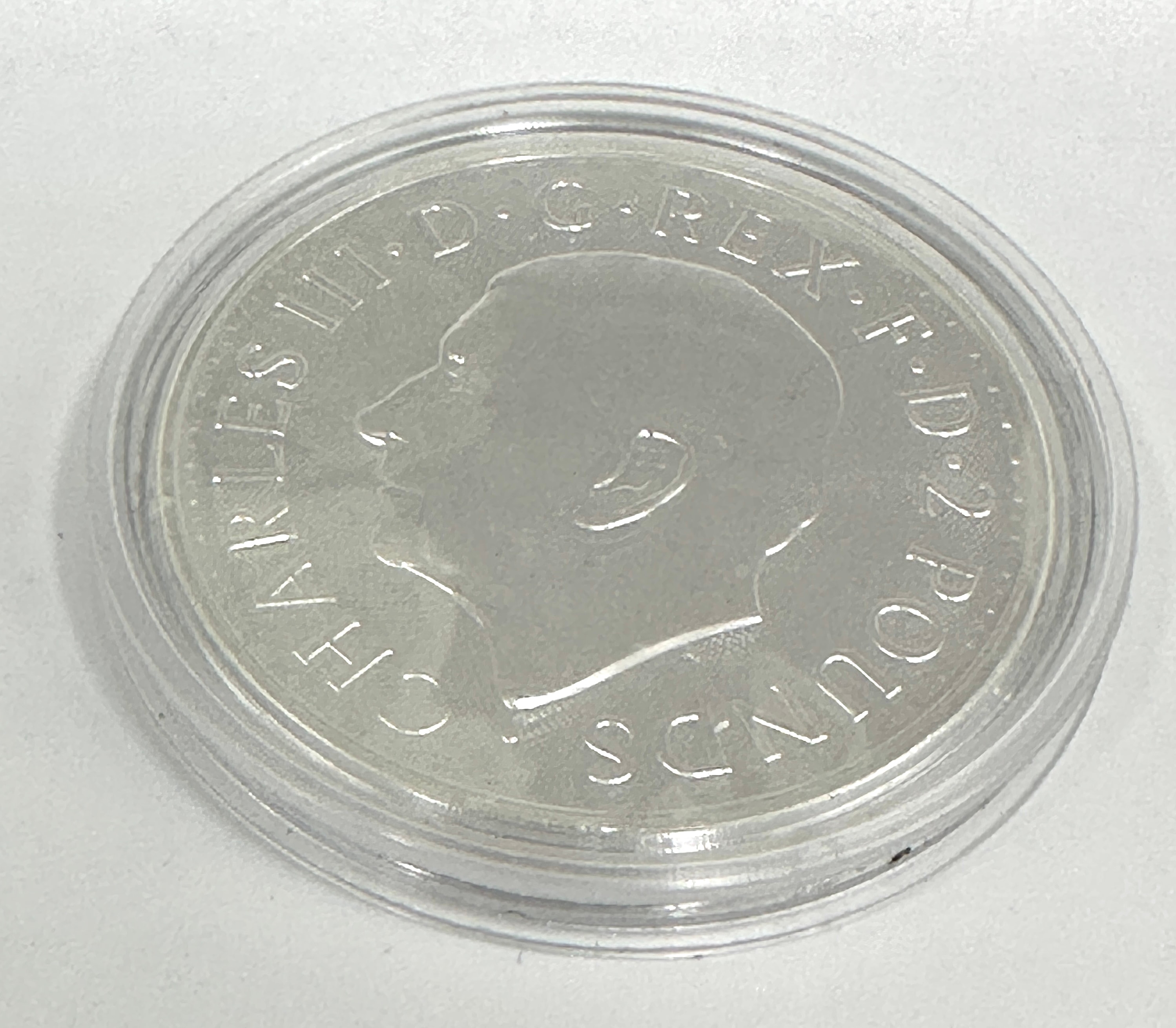 A Royal Mint 2024 Britannia 1 oz 999 Fine Silver Two Pounds Coin, housed within a clear plastic protective capsule. The obverse features a left-facing effigy of King Charles III, encircled by the inscription “CHARLES III D G REX F D” and the denomination “2 POUNDS.” The reverse displays a standing figure of Britannia holding a trident and a shield with the Union Jack design, with the surrounding text “BRITANNIA 2024 1 oz 999 FINE SILVER.”