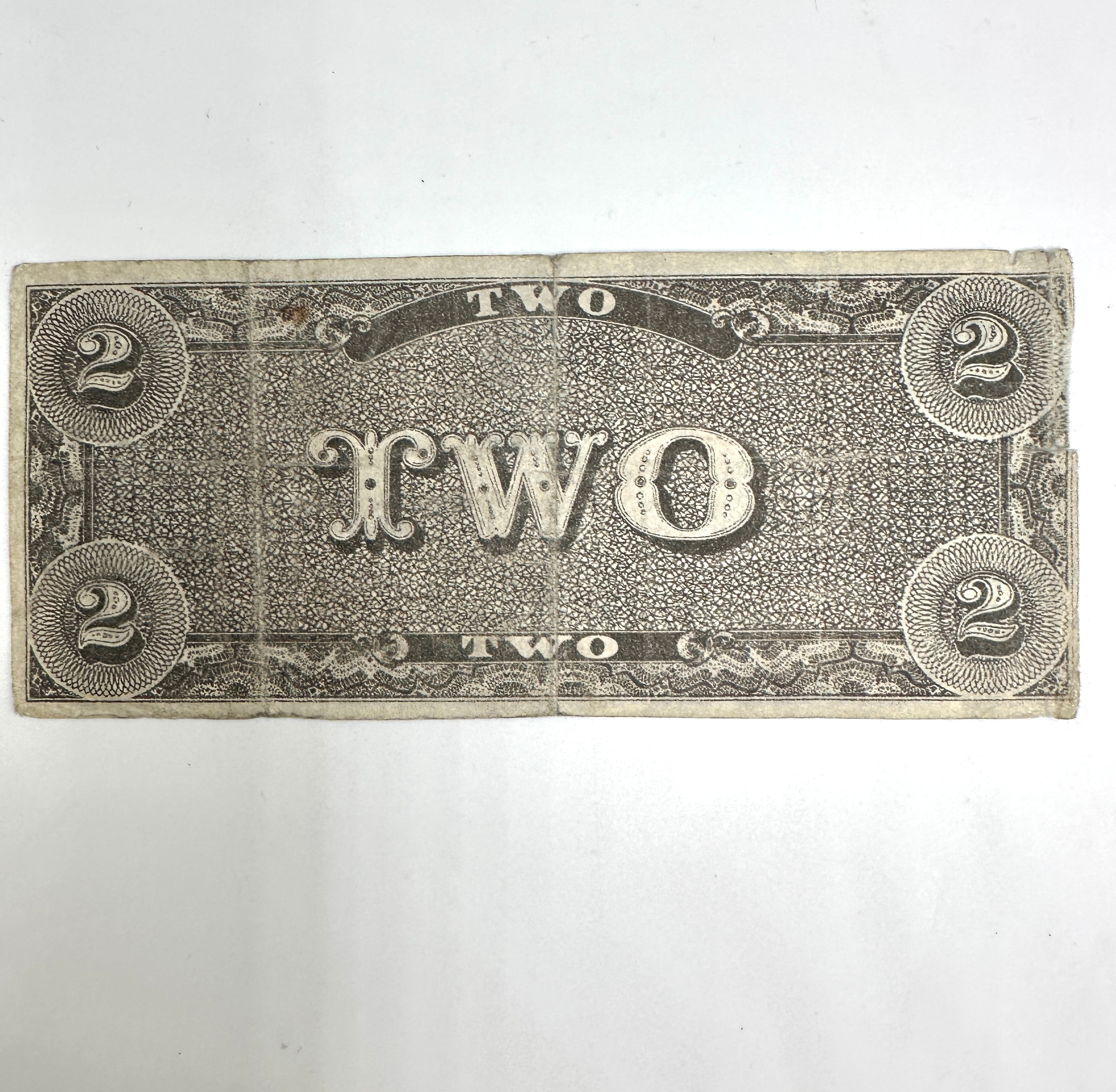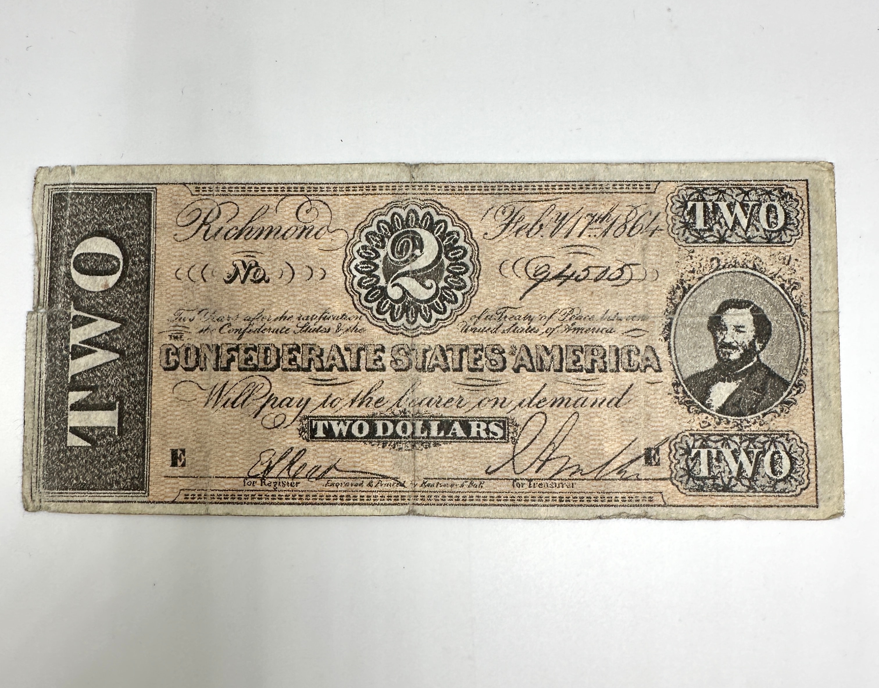 A Confederate States of America T-70 two-dollar banknote, dated February 17th, 1864. Issued from Richmond, the paper currency features an engraved design with “TWO DOLLARS” prominently displayed, along with the issuer “CONFEDERATE STATES AMERICA” and the handwritten serial number “94575.” A portrait of a bearded man appears on the right side, and text references “Six Months after the ratification of a treaty of Peace between the Confederate States & The United States of America.” The reverse exhibits an elaborate engraved pattern with “TWO” in the center and “2” in each corner.
