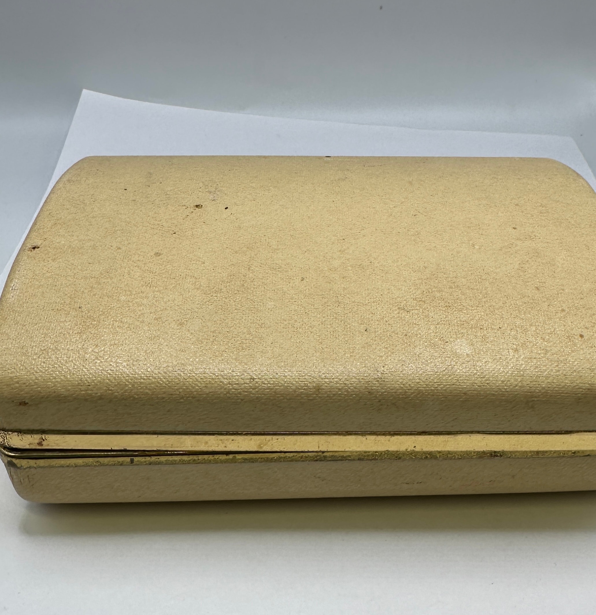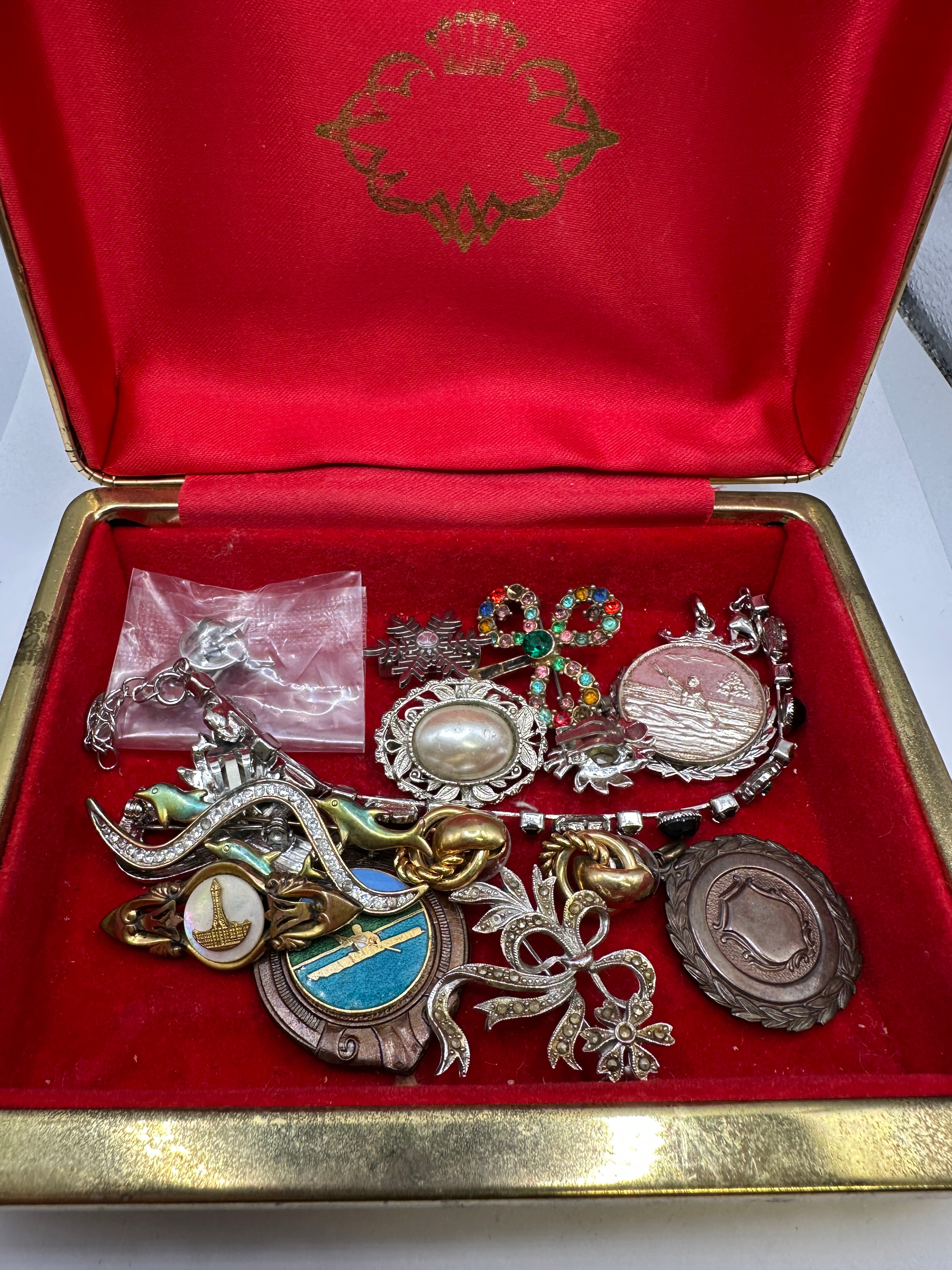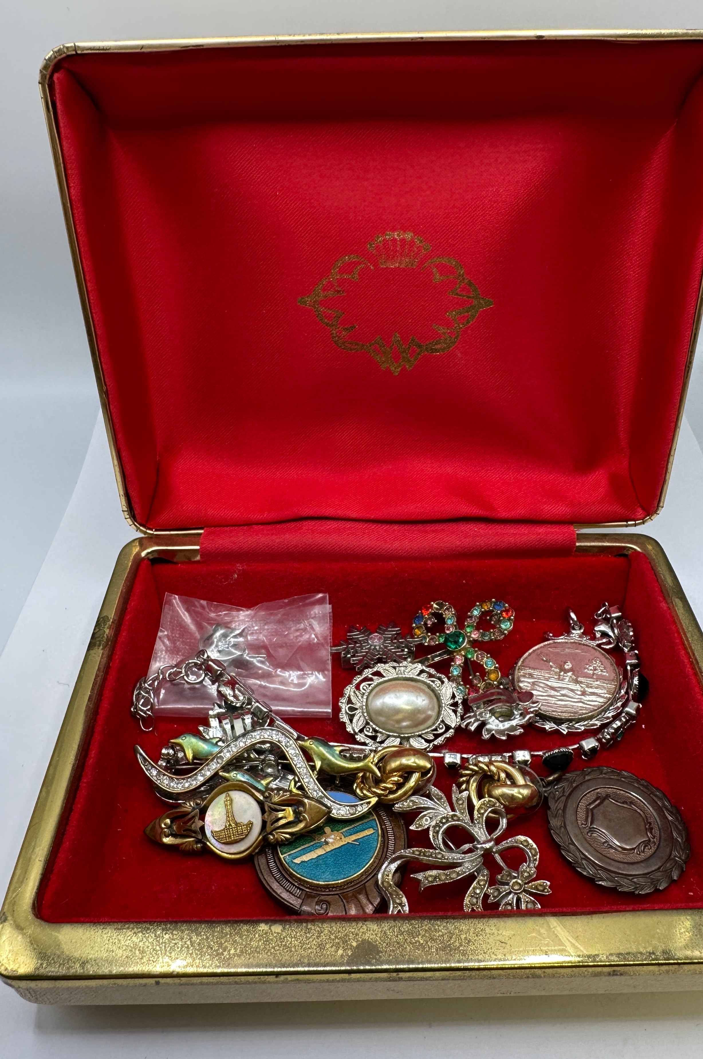 A vintage rectangular hard-sided jewelry or vanity case, featuring a light beige/cream textured exterior, likely faux leather or coated material, and a gold-tone metal frame with a clasp. The interior is lined with vibrant red velvet or satin, accented by a central gold-tone embossed crest or decorative motif on the inside lid. The case contains a varied collection of costume jewelry, predominantly brooches, necklaces, and potentially bracelets, crafted from mixed metals (gold-tone, silver-tone, bronze-tone) and adorned with faux pearls, clear and colored rhinestones, and enamel in diverse designs including figurative elements, architectural representations, and abstract patterns.