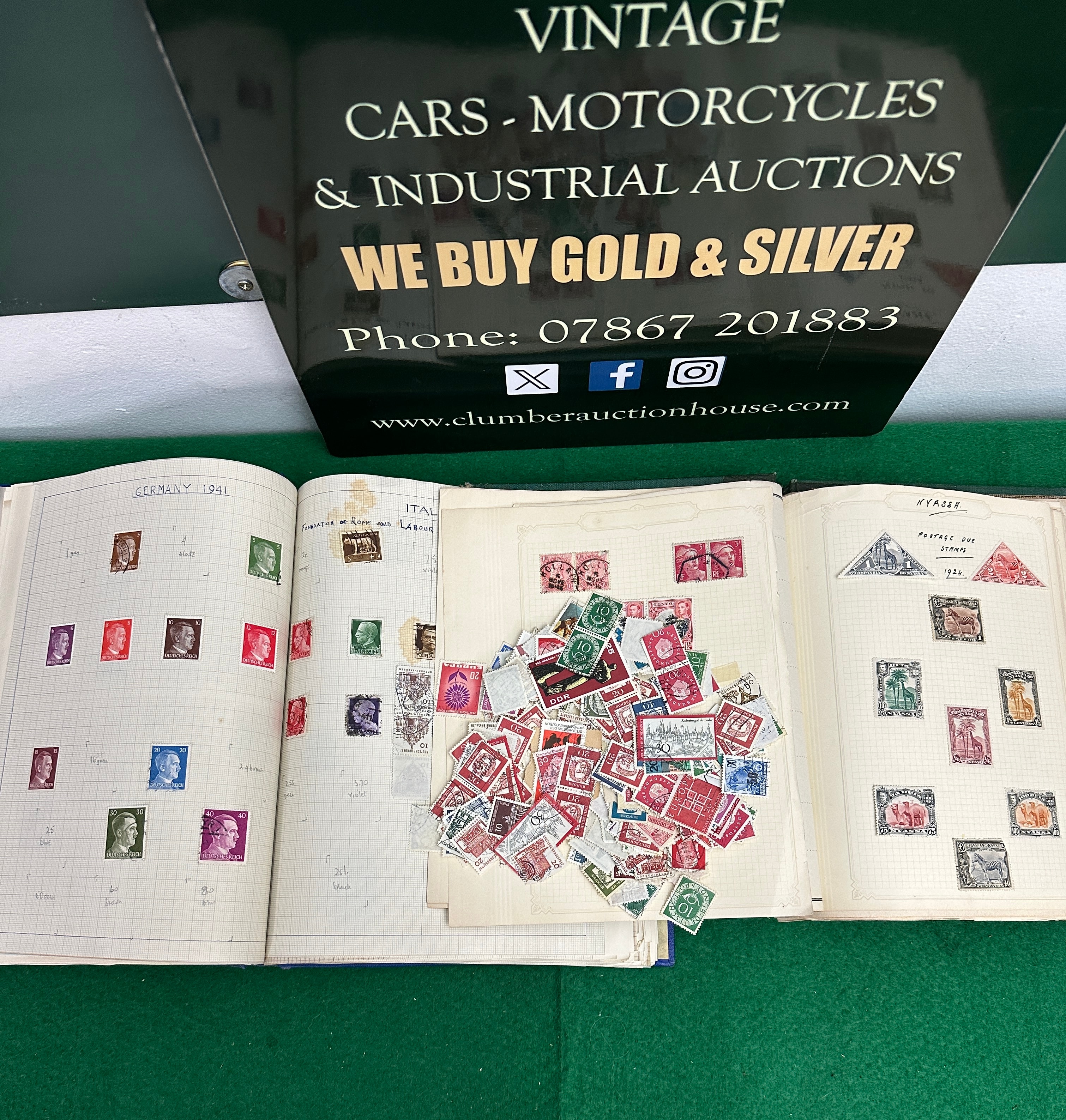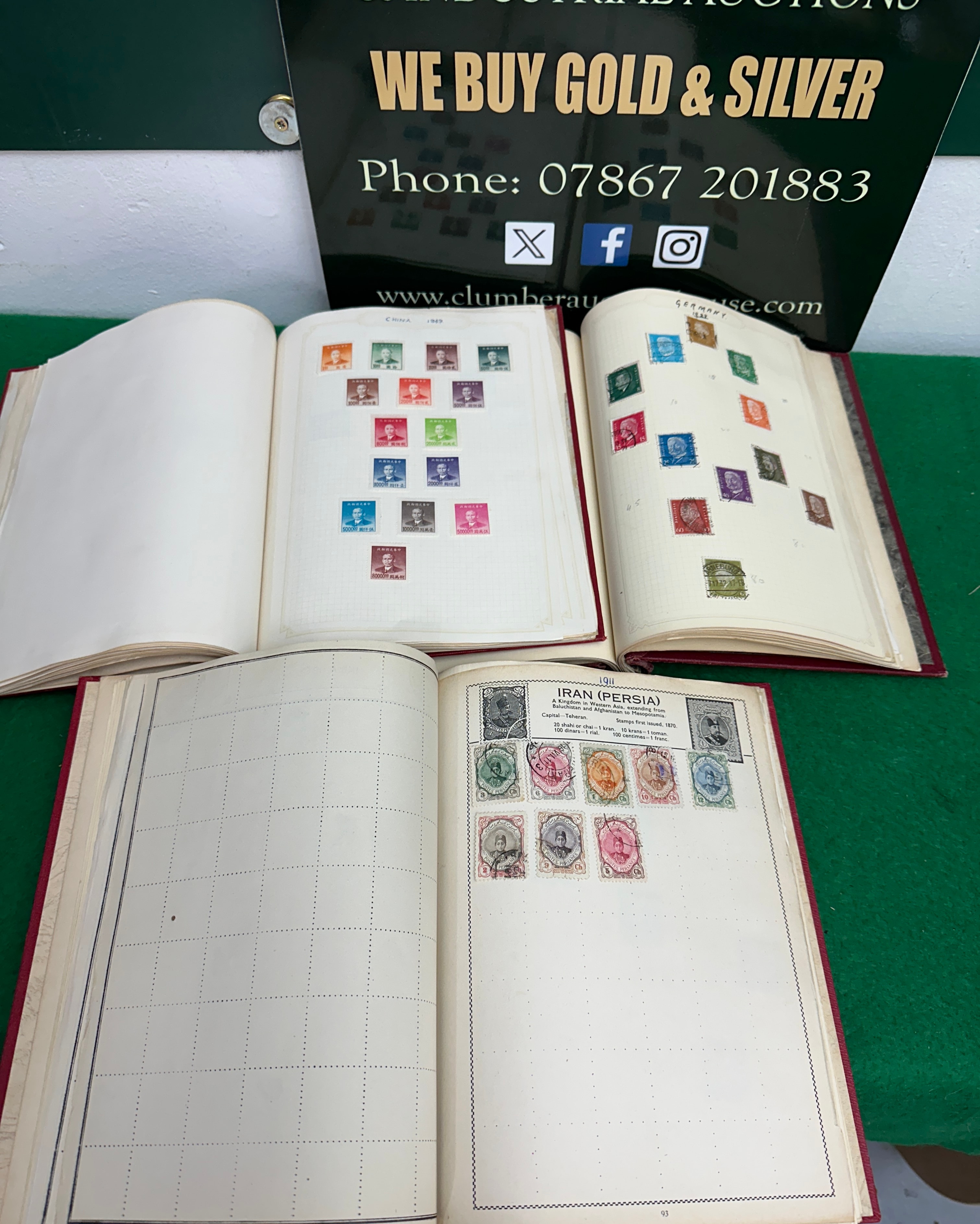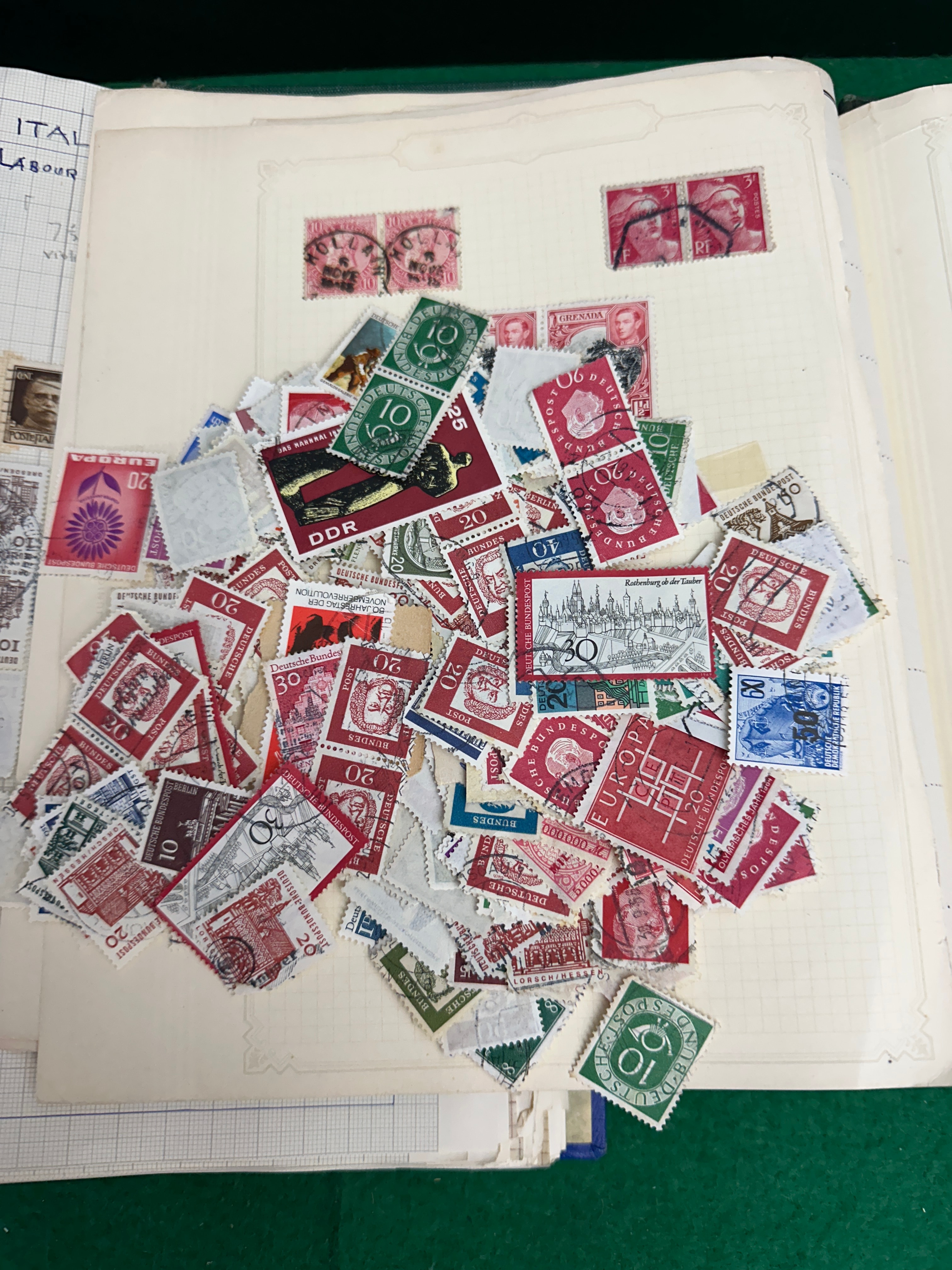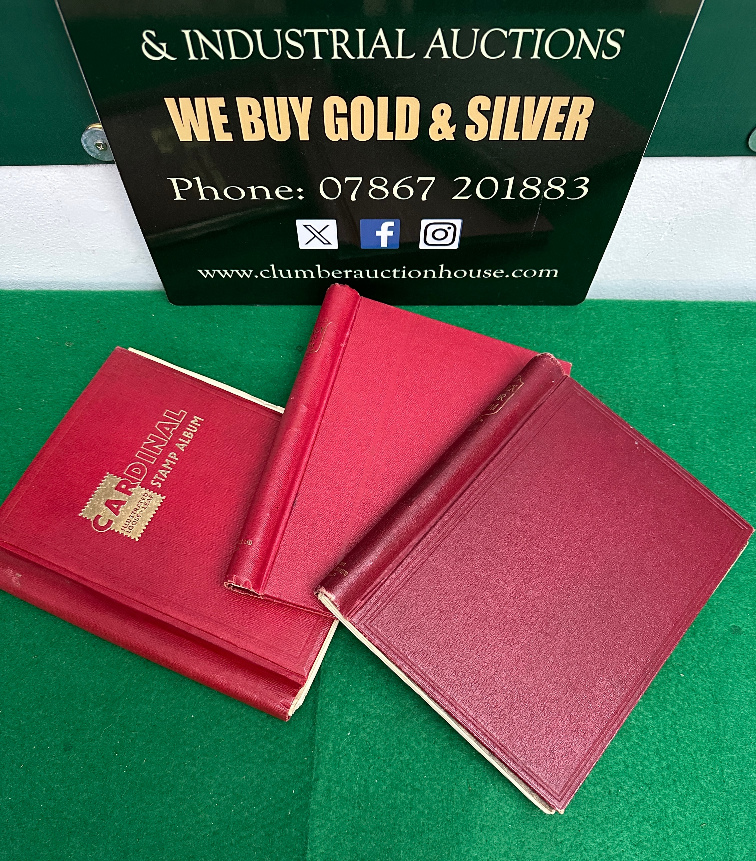 A collection of three hardbound stamp albums, predominantly with red covers, one of which is explicitly marked “CARDINAL STAMP ALBUM”. The albums contain a significant number of postage stamps, some neatly mounted on grid-lined or plain pages, while others are accumulated in loose piles within the albums. Visible headings and handwritten annotations on the pages indicate categorized collections for “GERMANY 1941”, “ITALIAN LABOUR”, “PORTUGAL 1922”, and “IRAN (PERSIA)” with associated dates “1870-1926” and “ESTIMATED 1907”. Individual stamps exhibit various denominations, pictorial designs, and country names, including “GRENADA” and “DDR” (German Democratic Republic), suggesting a diverse geographical and chronological scope spanning from at least the late 19th century into the mid-20th century and potentially later.