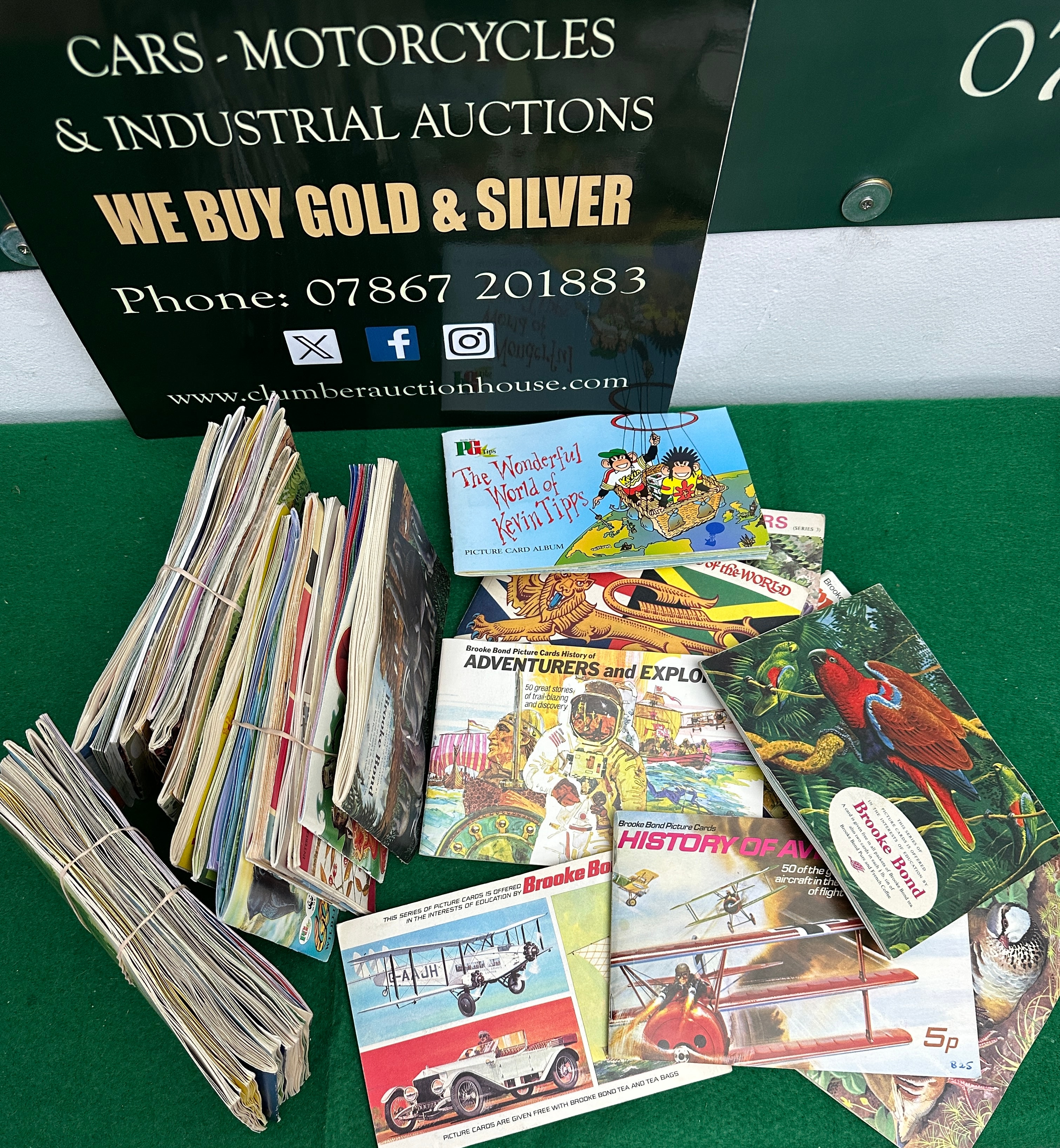 A substantial collection of vintage paper ephemera, primarily consisting of numerous stacked booklets, albums, and individual picture cards. Many items are secured with rubber bands. Visible titles include “The Wonderful World of Kevin Tupps – PICTURE CARD ALBUM,” “ADVENTURERS AND EXPLORERS,” and “Brooke Bond Picture Cards HISTORY OF AVIATION.” Several items prominently display “Brooke Bond” branding, indicating a common origin or theme. The material is paper and light cardstock.