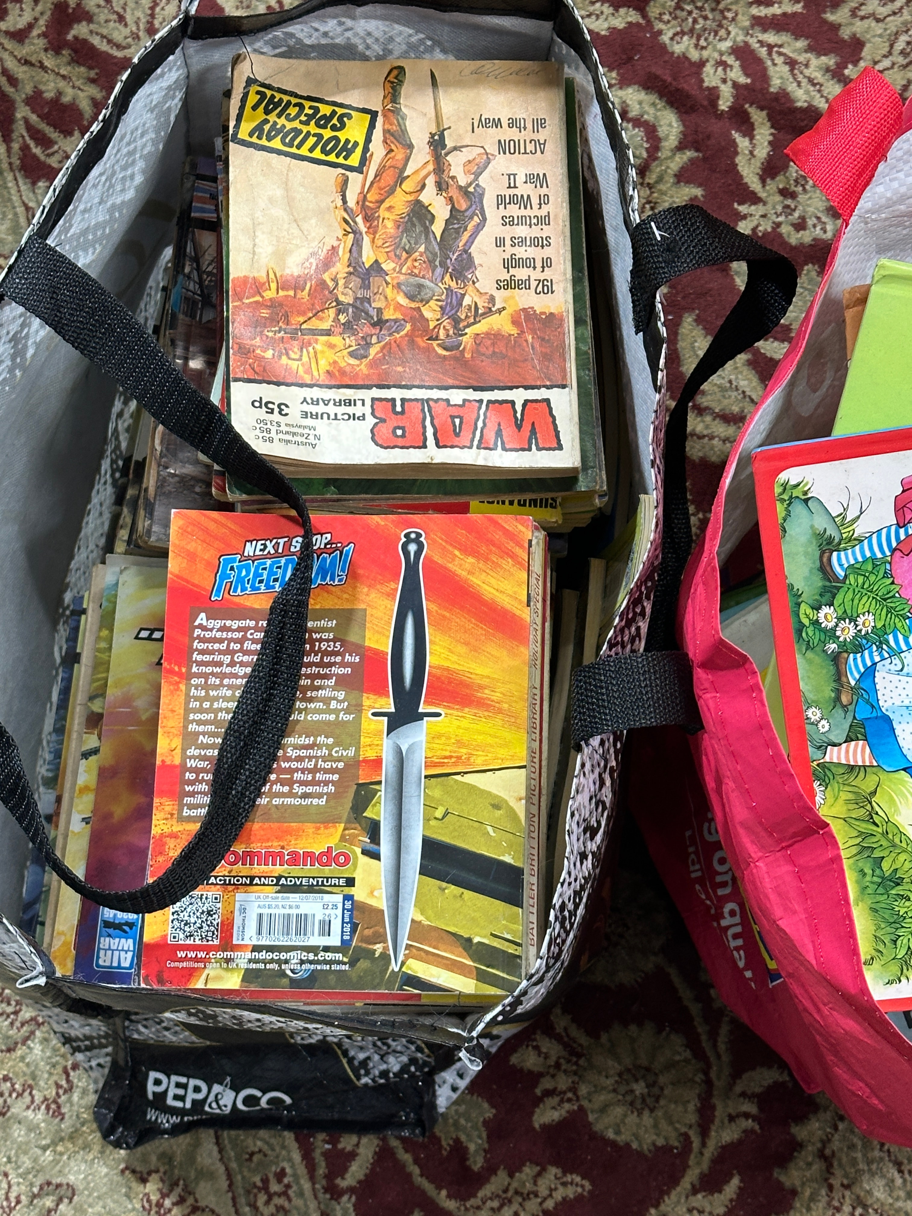 A collection of children’s storybooks, prominently featuring ‘Best Loved Fairy Tales’ likely published by Parents’ Magazine, alongside a group of vintage war and action comic books. The children’s books, predominantly illustrated, include ‘Grimm’s FAIRY TALES’ and volumes with a partially visible ‘Disney’ logo and a spine reading ‘Happy Bed’. The war and action comic books or picture library magazines include titles such as ‘WAR PICTURE LIBRARY: HOLIDAY SPECIAL’ and ‘COMMANDO ACTION AND ADVENTURE!’, with visible text indicating ‘192 pages of tough pictures in War World II ACTION ALL THE WAY!’ and ‘www.commandocomics.com’. These formats typically date from the mid-to-late 20th century. The books are presented in two reusable shopping bags, one black-and-white patterned and one red.