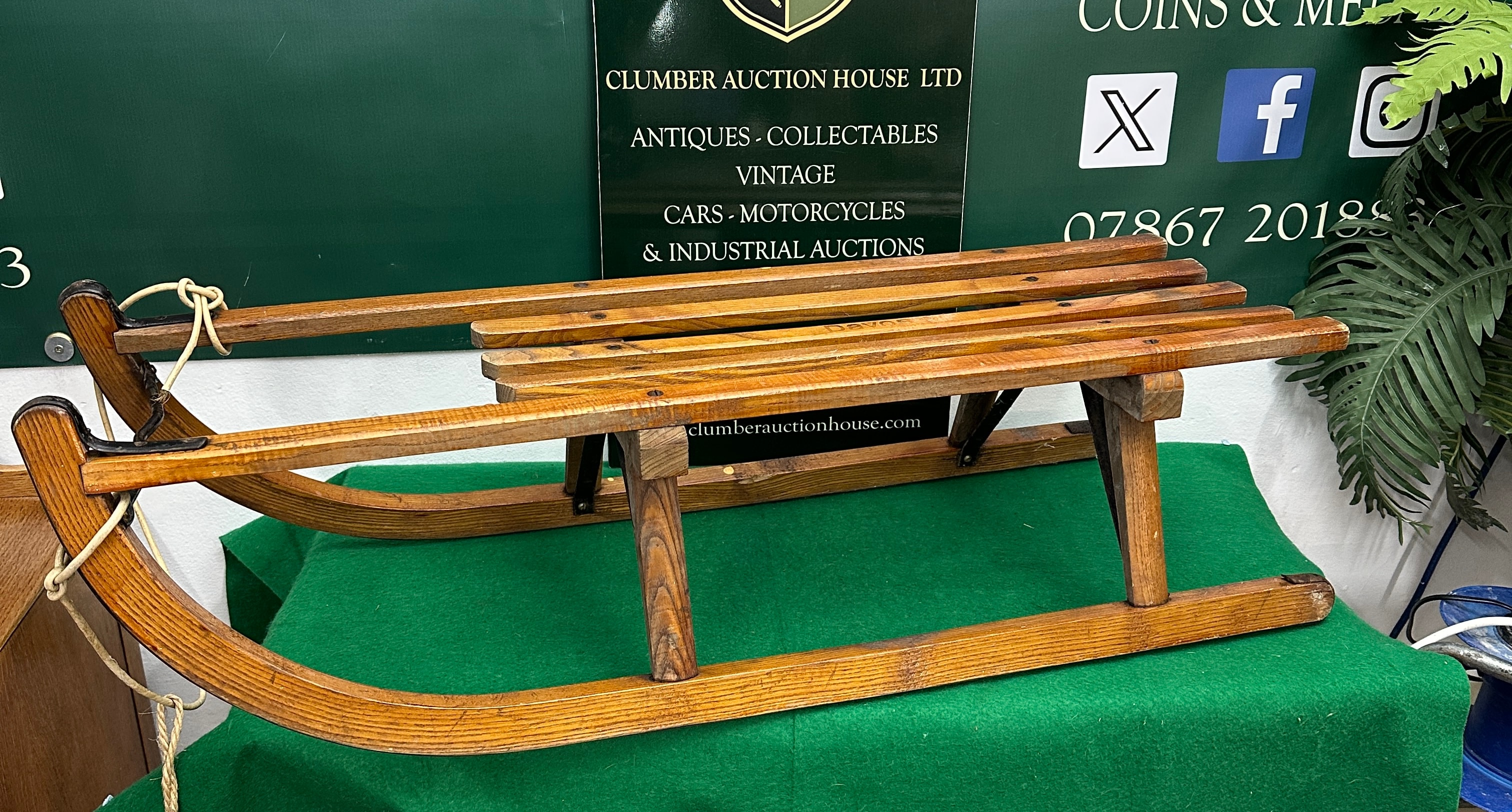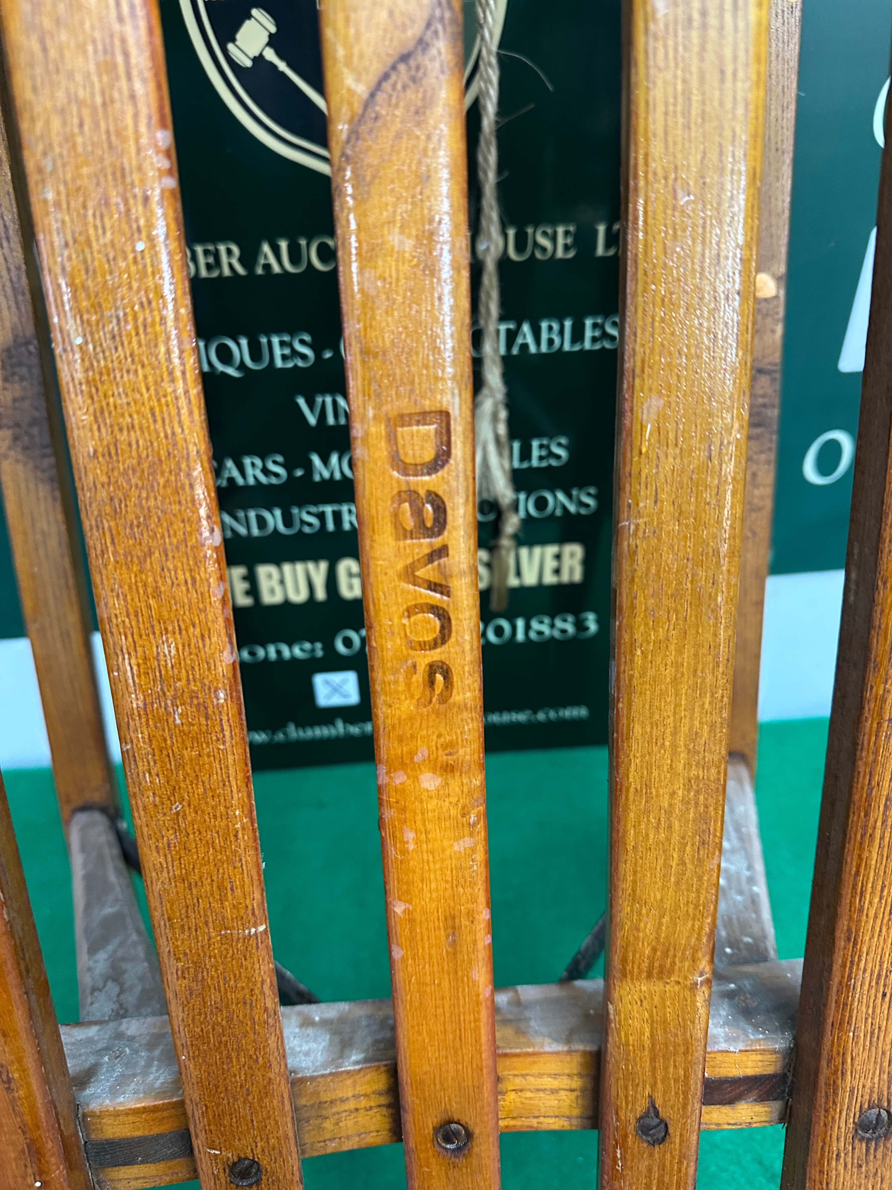 A vintage Davos sled, constructed from varnished hardwood. It features a slatted seat, curved runners, and metal components, along with a natural fiber rope for pulling. The name ‘Davos’ is vertically impressed into one of its central seat slats.