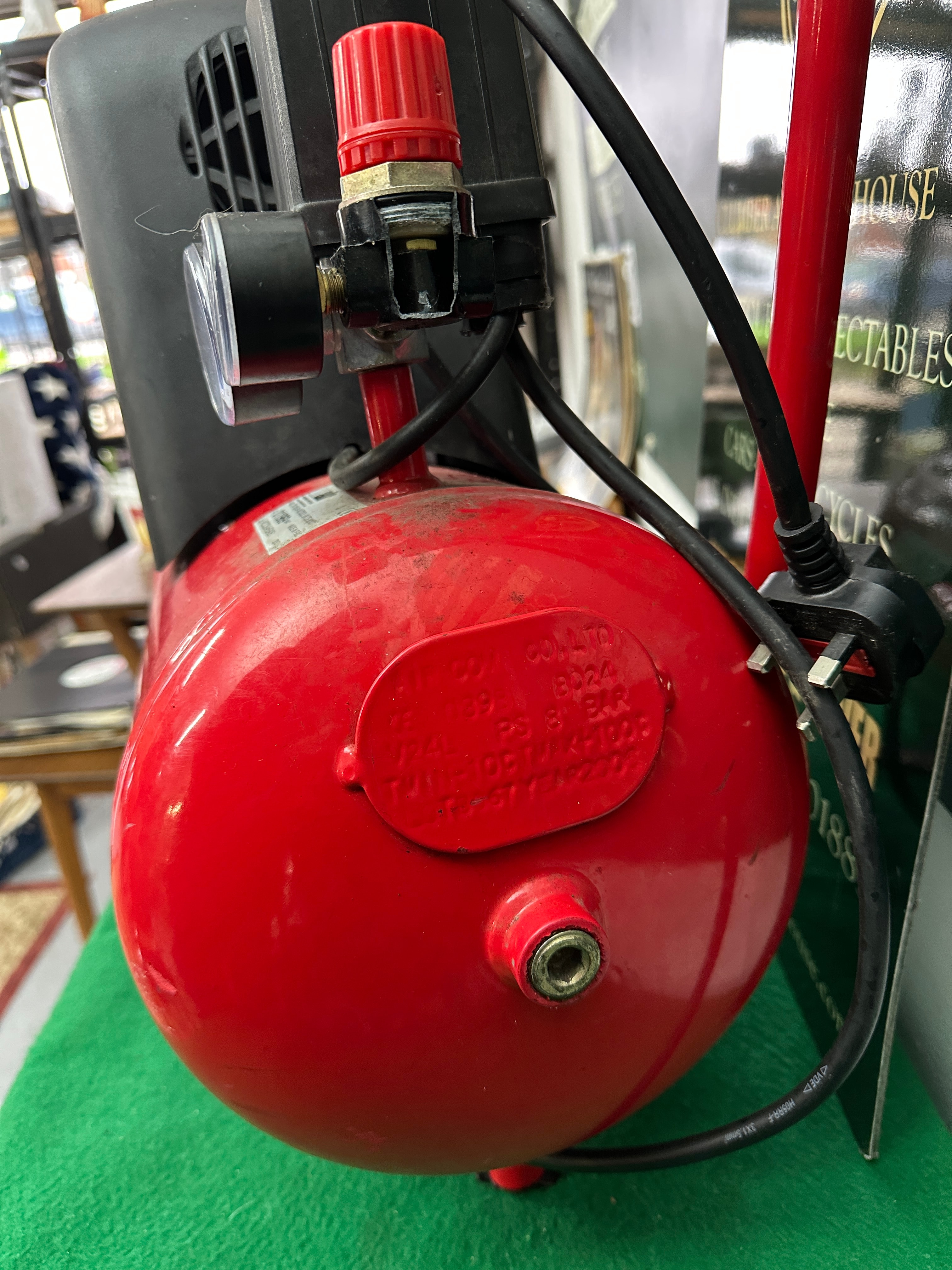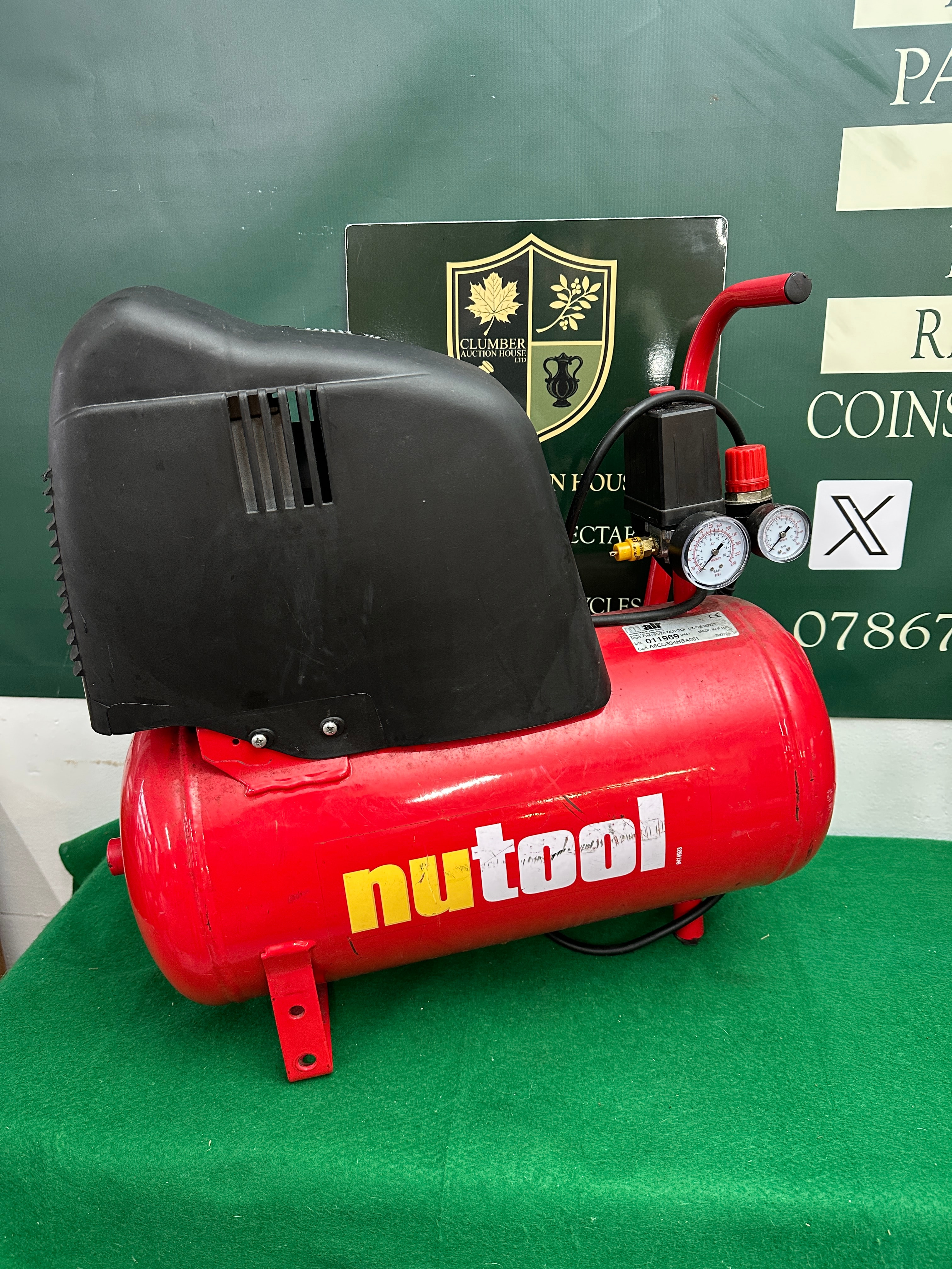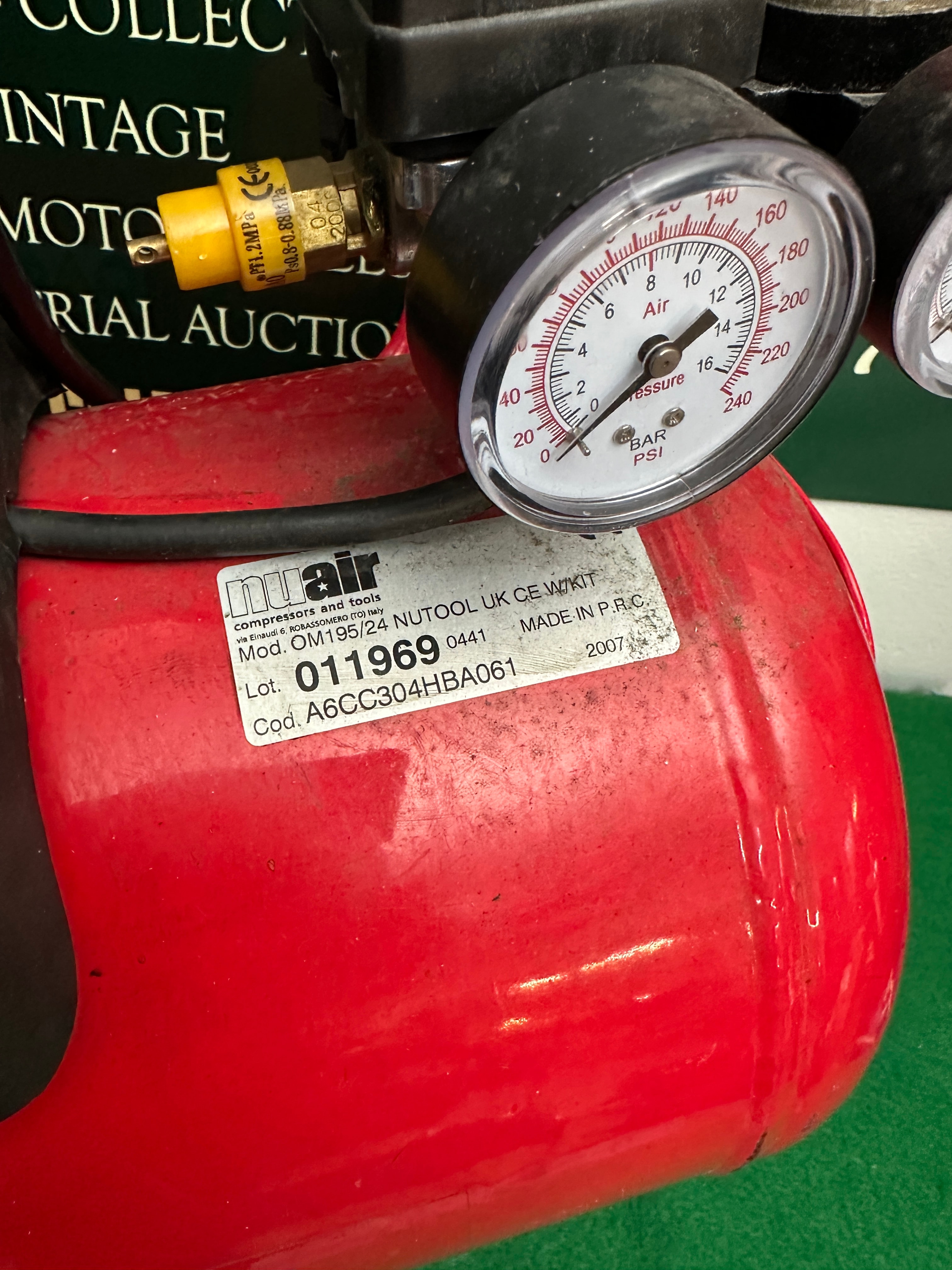 A modern, utilitarian air compressor featuring a red-painted metal cylindrical tank and handle, with a black plastic housing covering the motor and pump assembly. The tank is prominently branded “nutool” in yellow text. A label identifies the item as a “nuair COMPRESSORS AND TOOLS” model OM195/24 NUTOOL UK CE-W/KIT, manufactured in 2007. The label also states “MADE IN P.R.C.” (People’s Republic of China) and bears a lot number “011969”. Visible controls include two pressure gauges marked “BAR PSI” and a red adjustment knob.