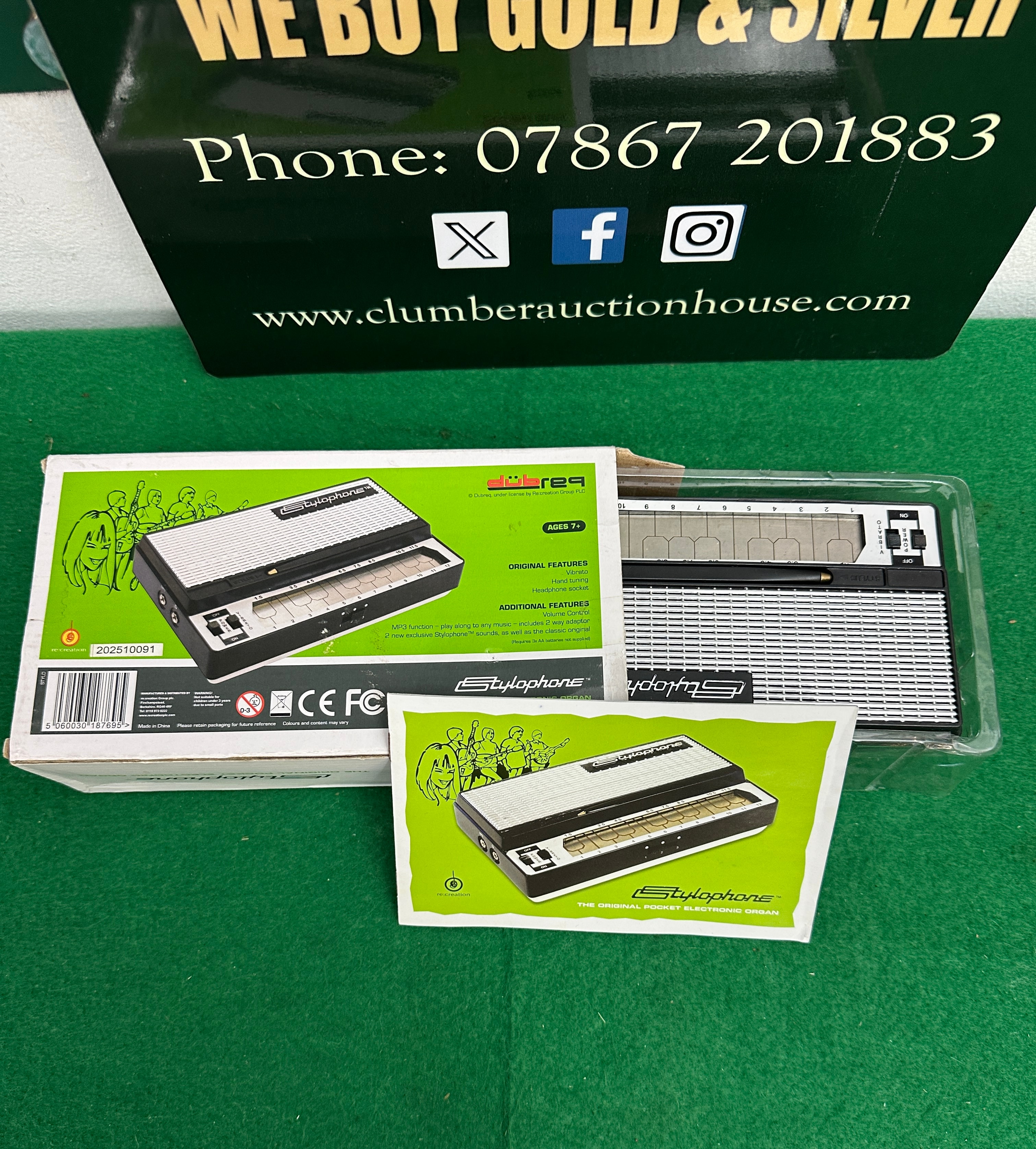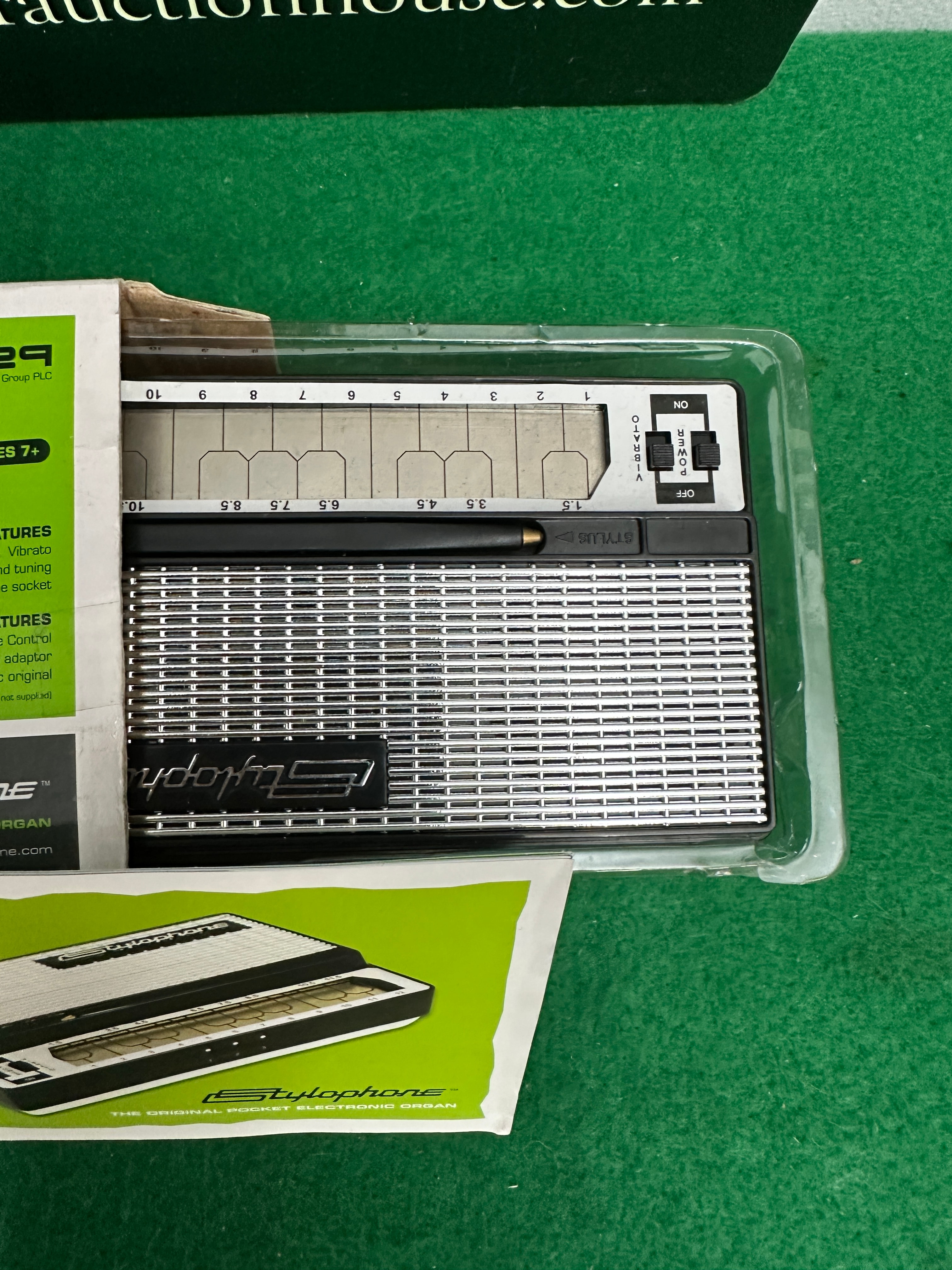 A Dubreq Stylophone, The Original Pocket Electronic Organ. This compact, black and silver-colored portable electronic organ is complete with its attached stylus. It is presented within its original cardboard retail packaging, which features a clear plastic window, “Stylophone” branding, “AGES 7+” age recommendation, “CE” and “FC” marks, a barcode, and descriptive text detailing “ORIGINAL FEATURES” and “ADDITIONAL FEATURES” such as vibrato and a headphone socket. The instrument itself displays a silver-colored speaker grille and metallic keyboard contacts numbered 1 through 10, along with an “ON/OFF” switch. Accompanying the instrument is a separate, green promotional leaflet for the “Stylophone,” bearing the slogan “THE ORIGINAL POCKET ELECTRONIC ORGAN.”