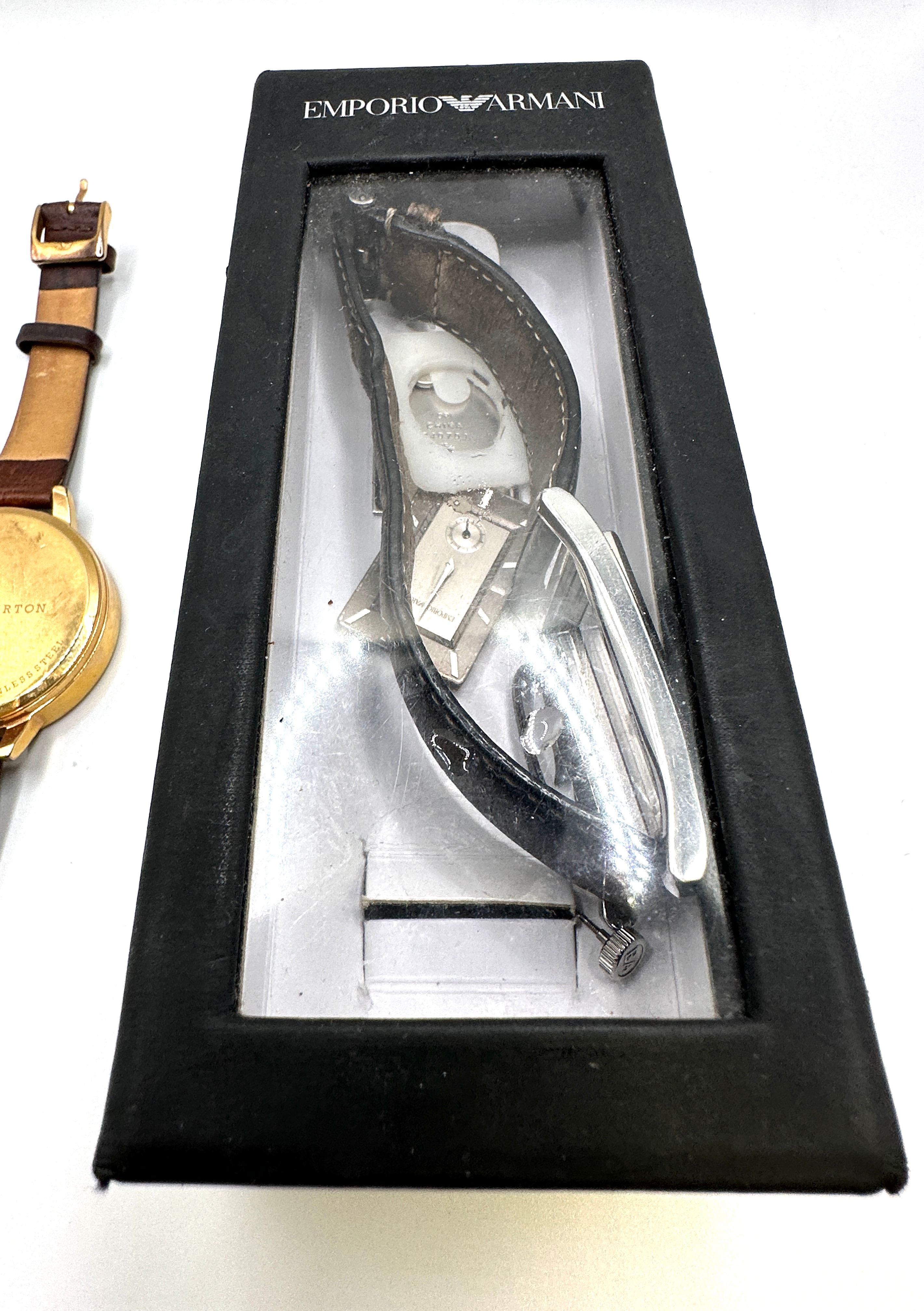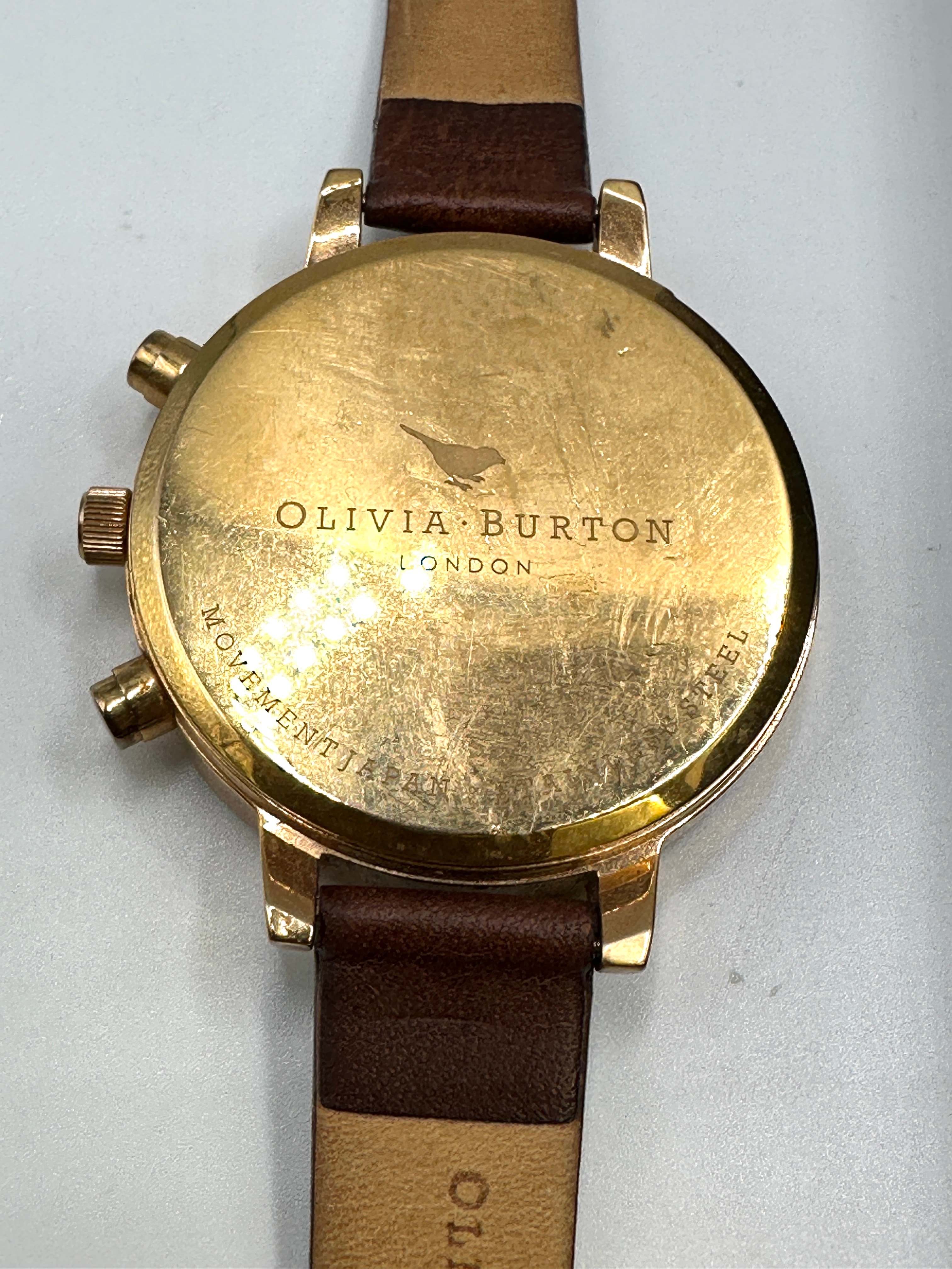 An Olivia Burton rose gold-tone metal wristwatch features a brown chronograph-style dial with Roman numerals (XII, VI, IX) and baton indices, paired with a brown leather strap. The case back is engraved with a bird motif, “OLIVIA BURTON LONDON”, and “MOVEMENT JAPAN STAINLESS STEEL”. Accompanied by a black Emporio Armani presentation box with a clear plastic window, enclosing a men’s belt with a silver-tone buckle and a black leather strap.