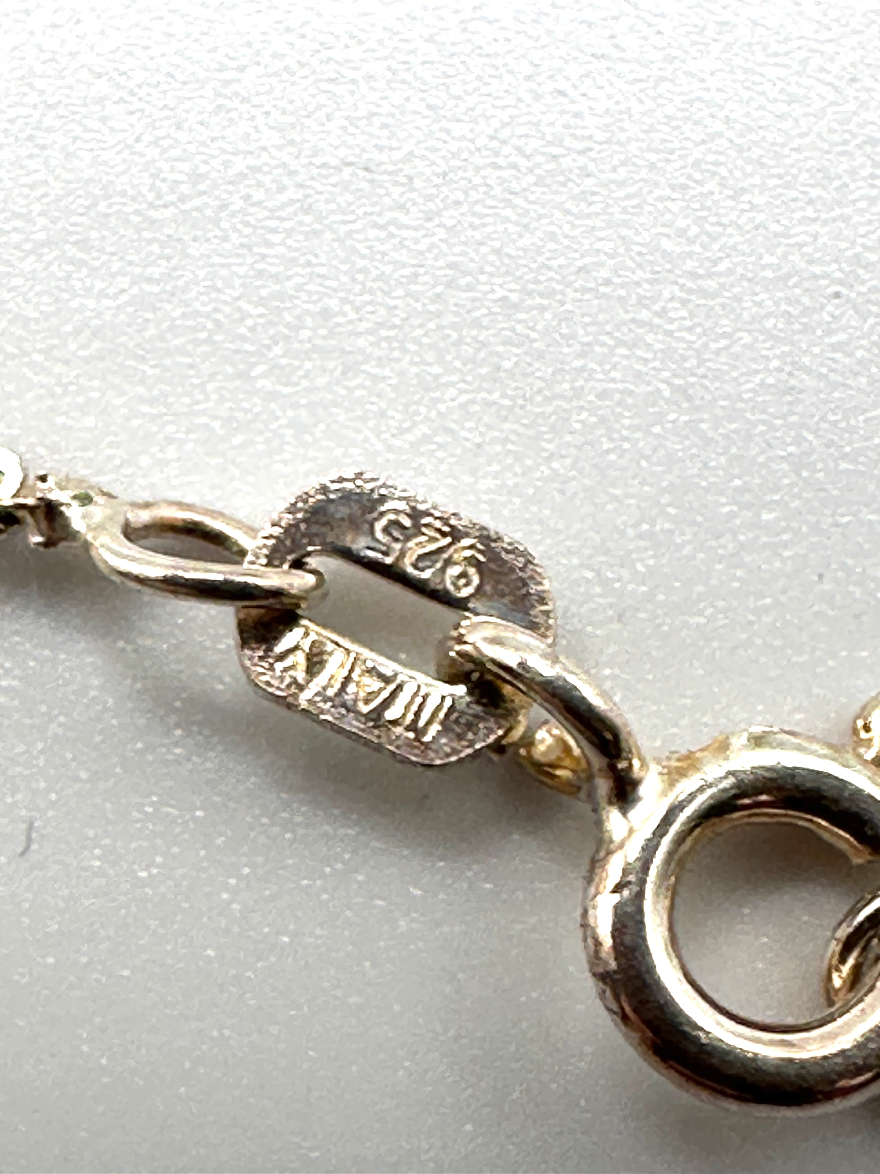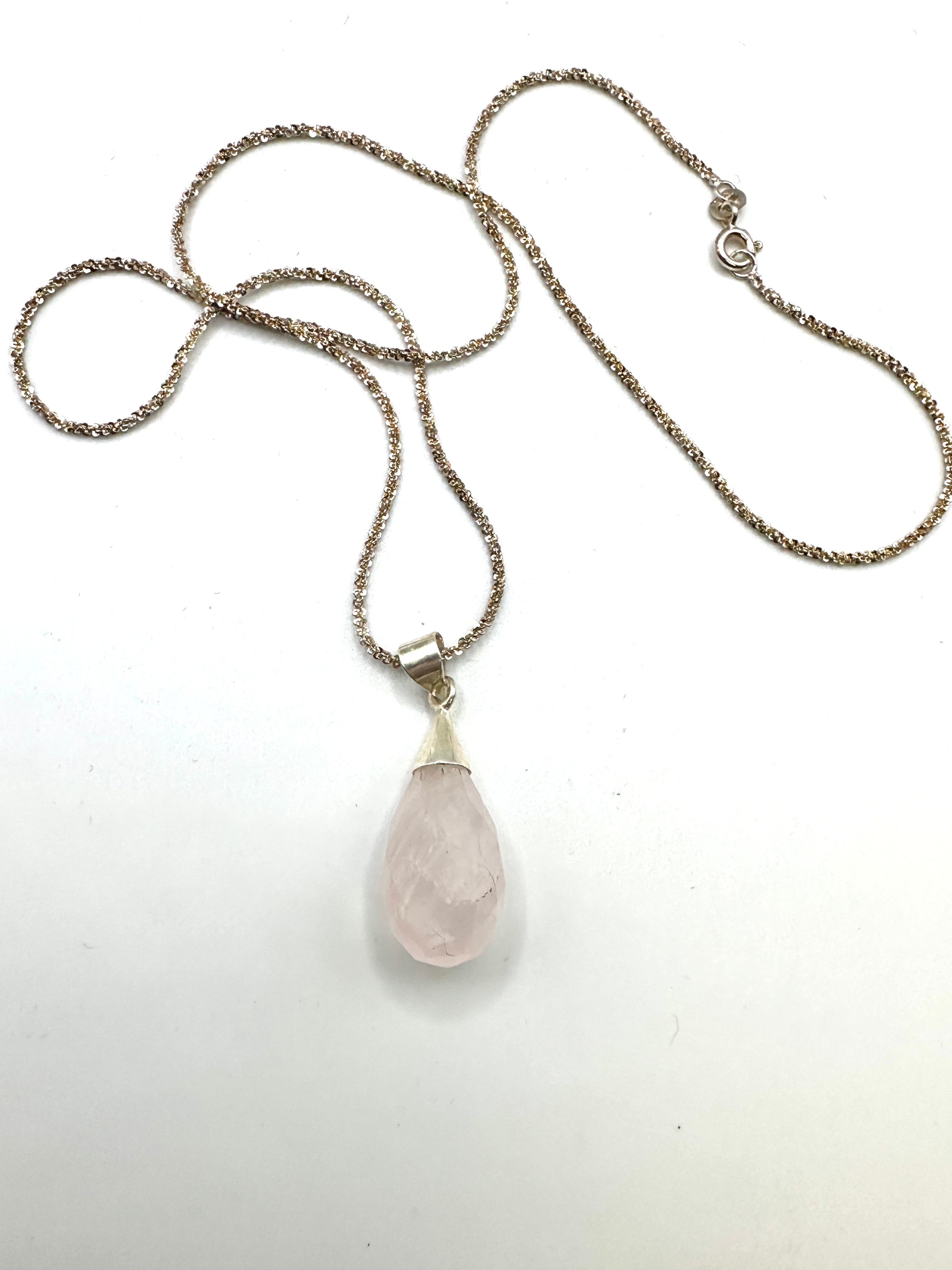 An Italian sterling silver necklace featuring a rose quartz teardrop pendant. The piece is composed of a silver-toned textured chain, which is marked ‘925’ and ‘ITALY’ on its spring ring clasp, indicating sterling silver from Italy. The chain supports a tear-drop shaped pendant featuring a faceted, translucent light pink stone, identified as rose quartz, set within a simple silver-toned bail.