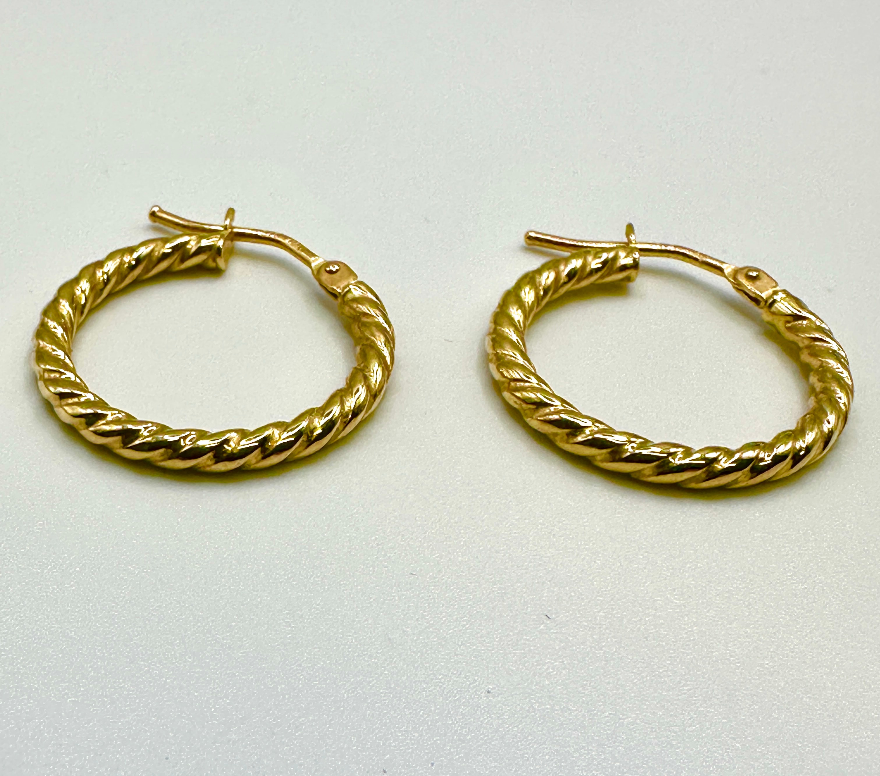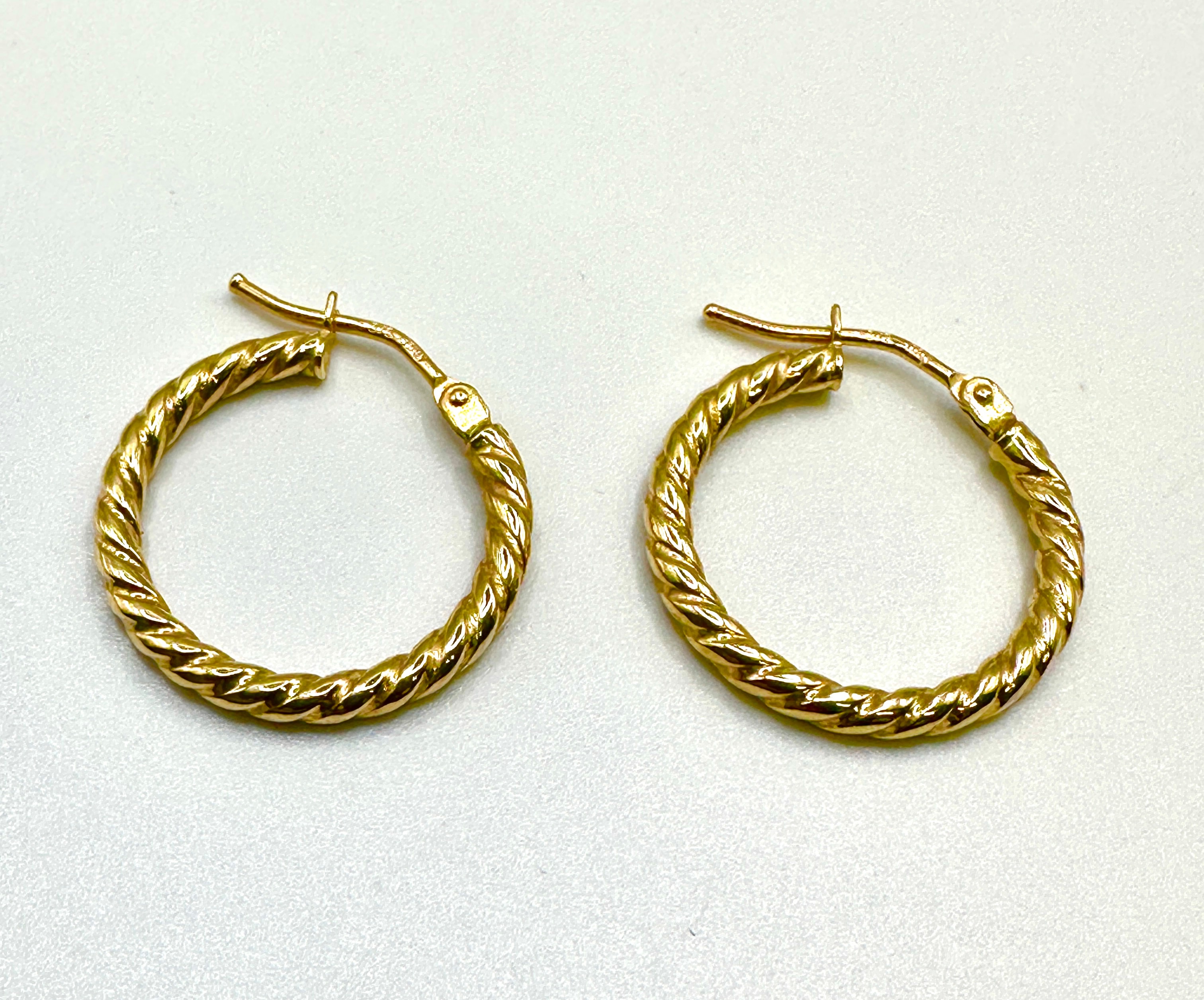 A matching pair of circular hoop earrings, crafted from 9k yellow gold. Each hoop features a twisted or rope-style design and is secured by a hinge-and-post closure mechanism. No visible hallmarks, manufacturer’s marks, or inscriptions are discernible.