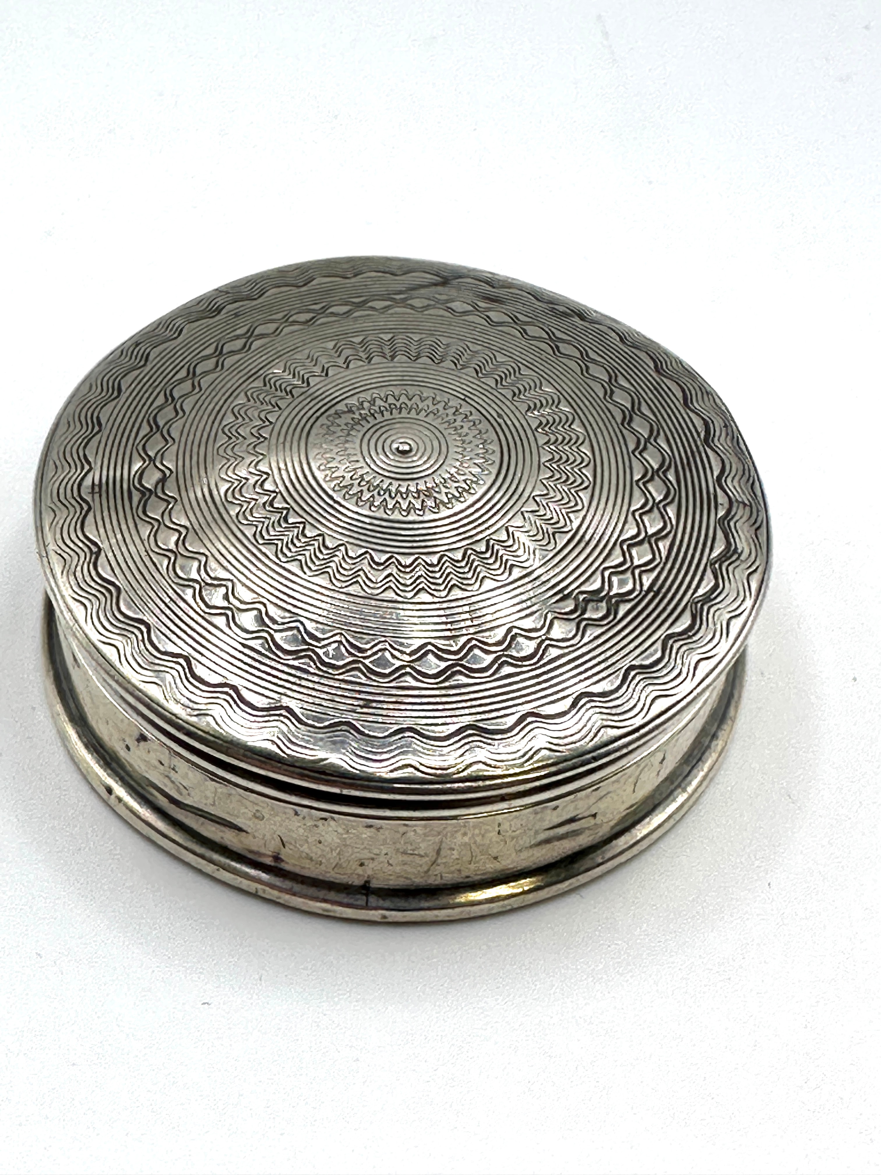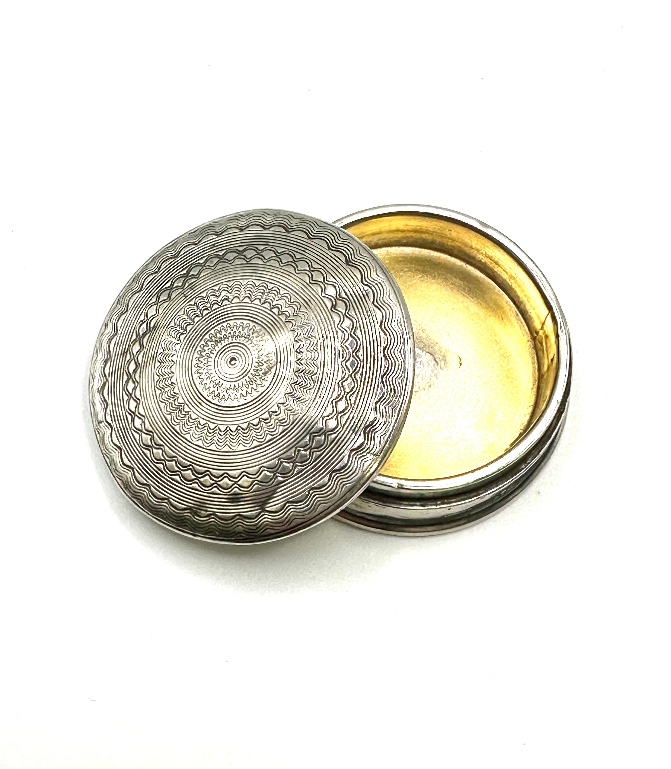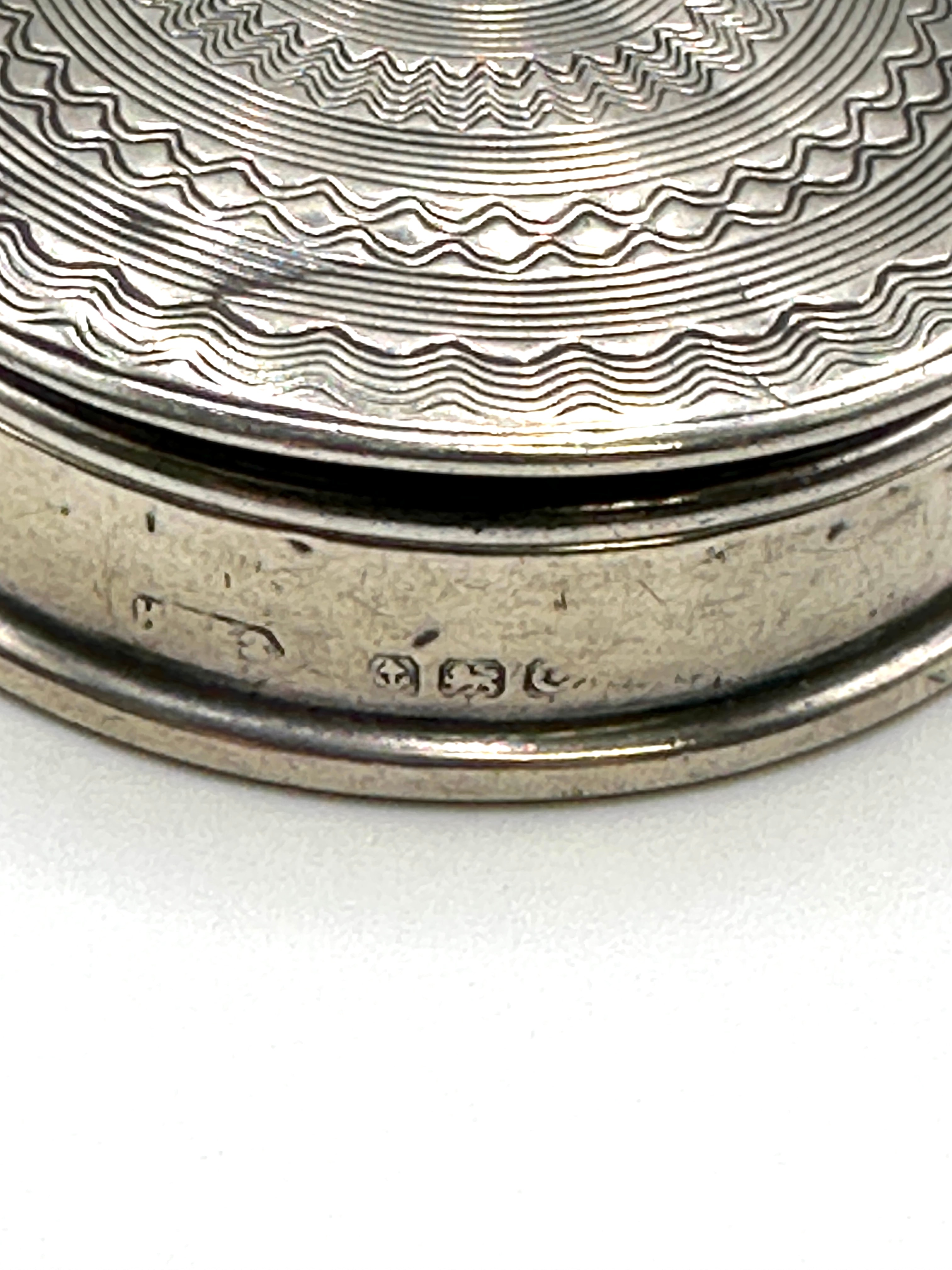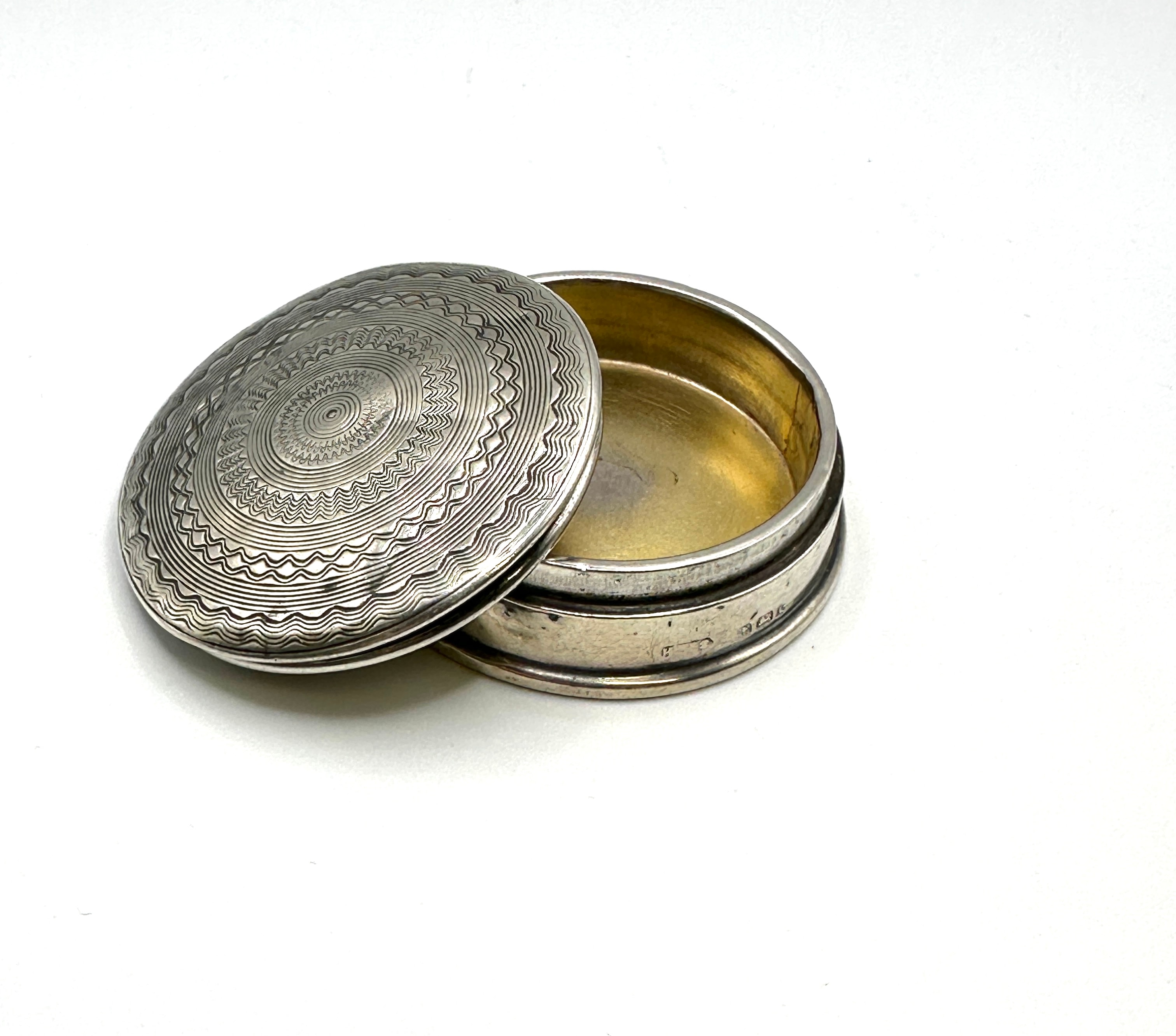 This small, round, lidded box is crafted from 925 silver with a gilt interior. The lid features finely executed engine-turned decoration comprising concentric circles of wavy and radiating patterns. Visible hallmarks on the side of the base include the English lion passant, an anchor mark for the Birmingham assay office, a crowned monarch’s head duty mark, and a lower-case ‘j’ within a square punch, indicating a date of 1908/09. An indistinct maker’s mark is also present.