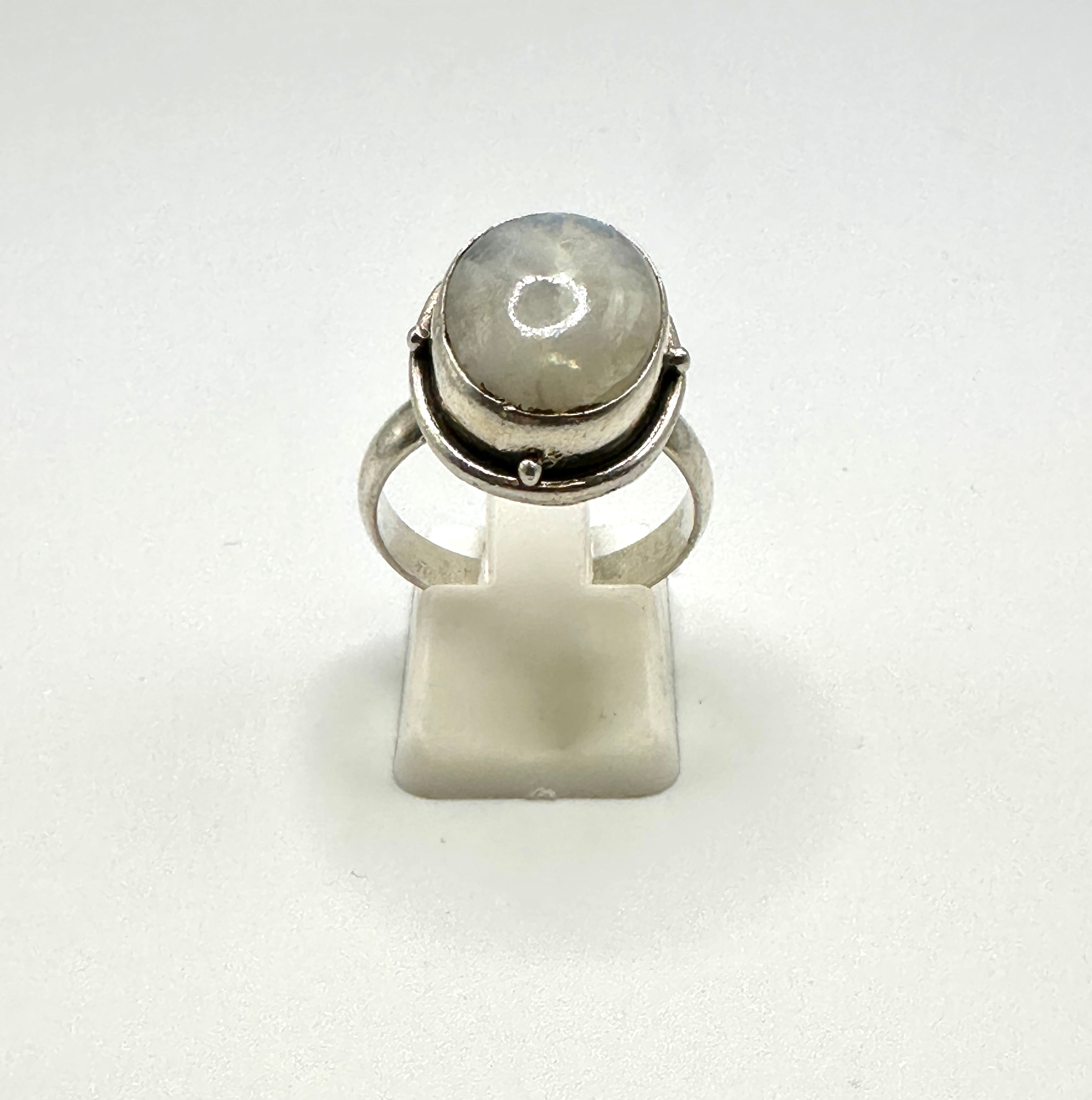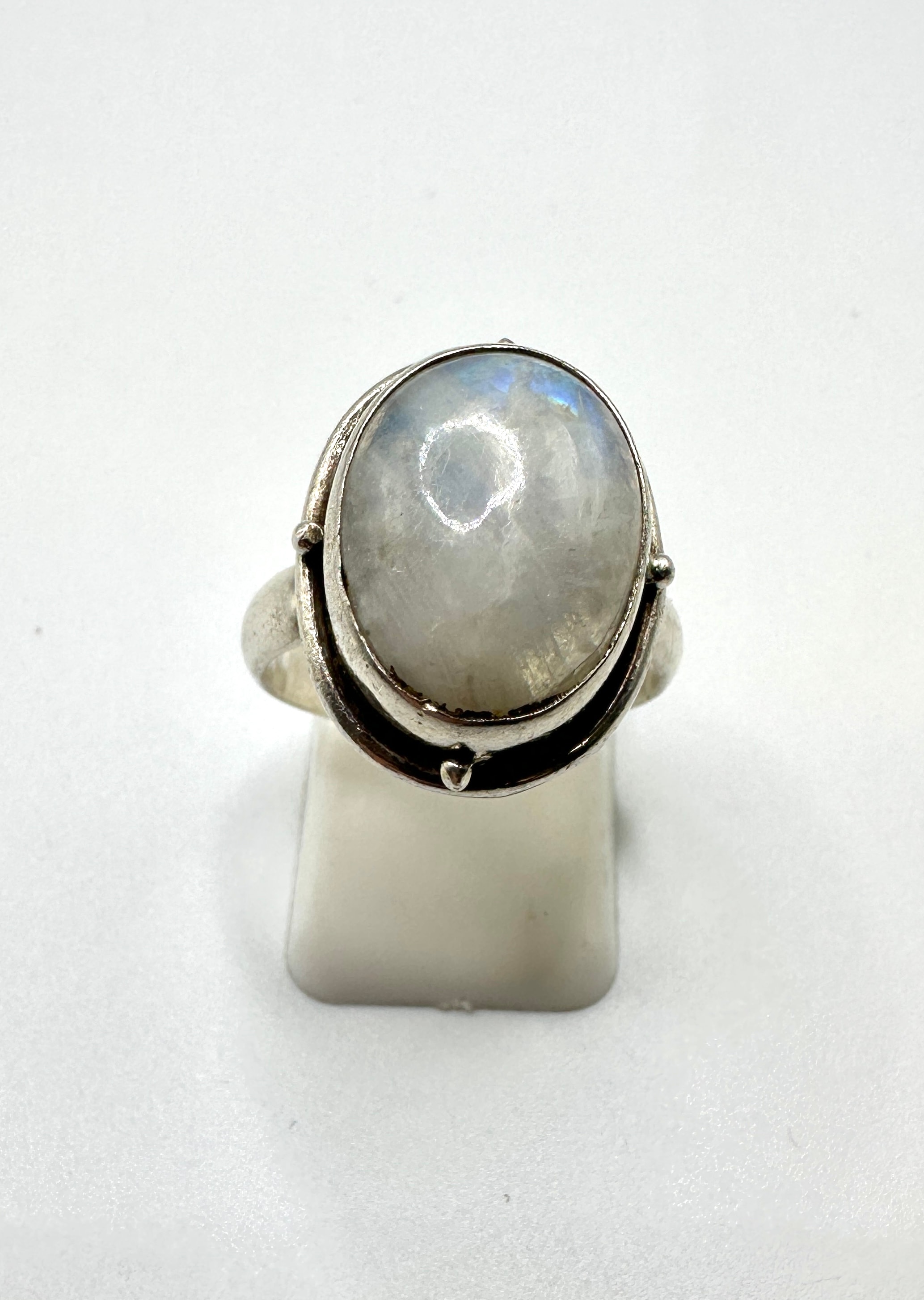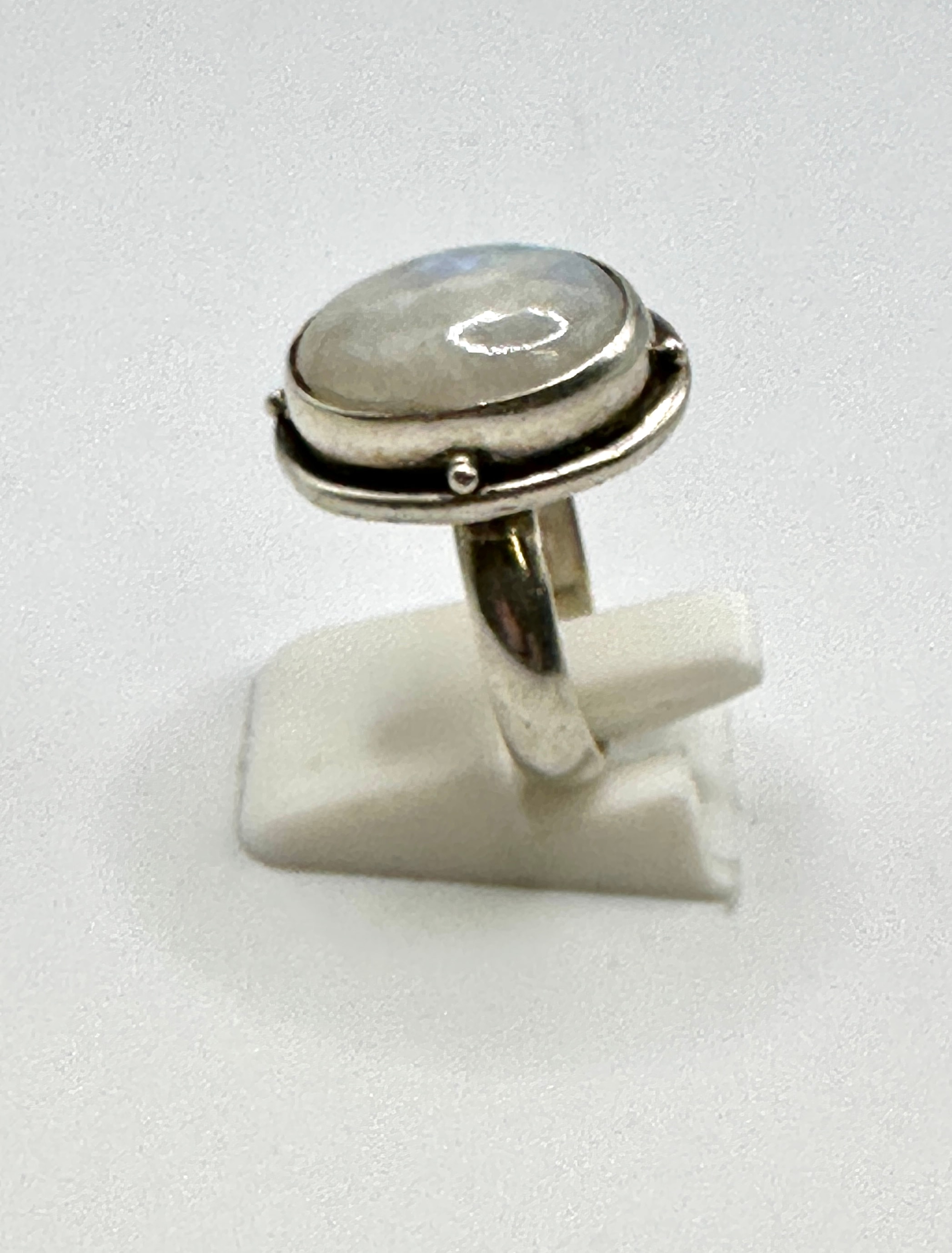 A sterling silver ring featuring a prominent oval cabochon moonstone. The gemstone exhibits milky translucence and adularescence. The moonstone is set in a bezel with a rustic or artisan style. A faint ‘925’ mark, indicating sterling silver, is visible on the interior of the band.