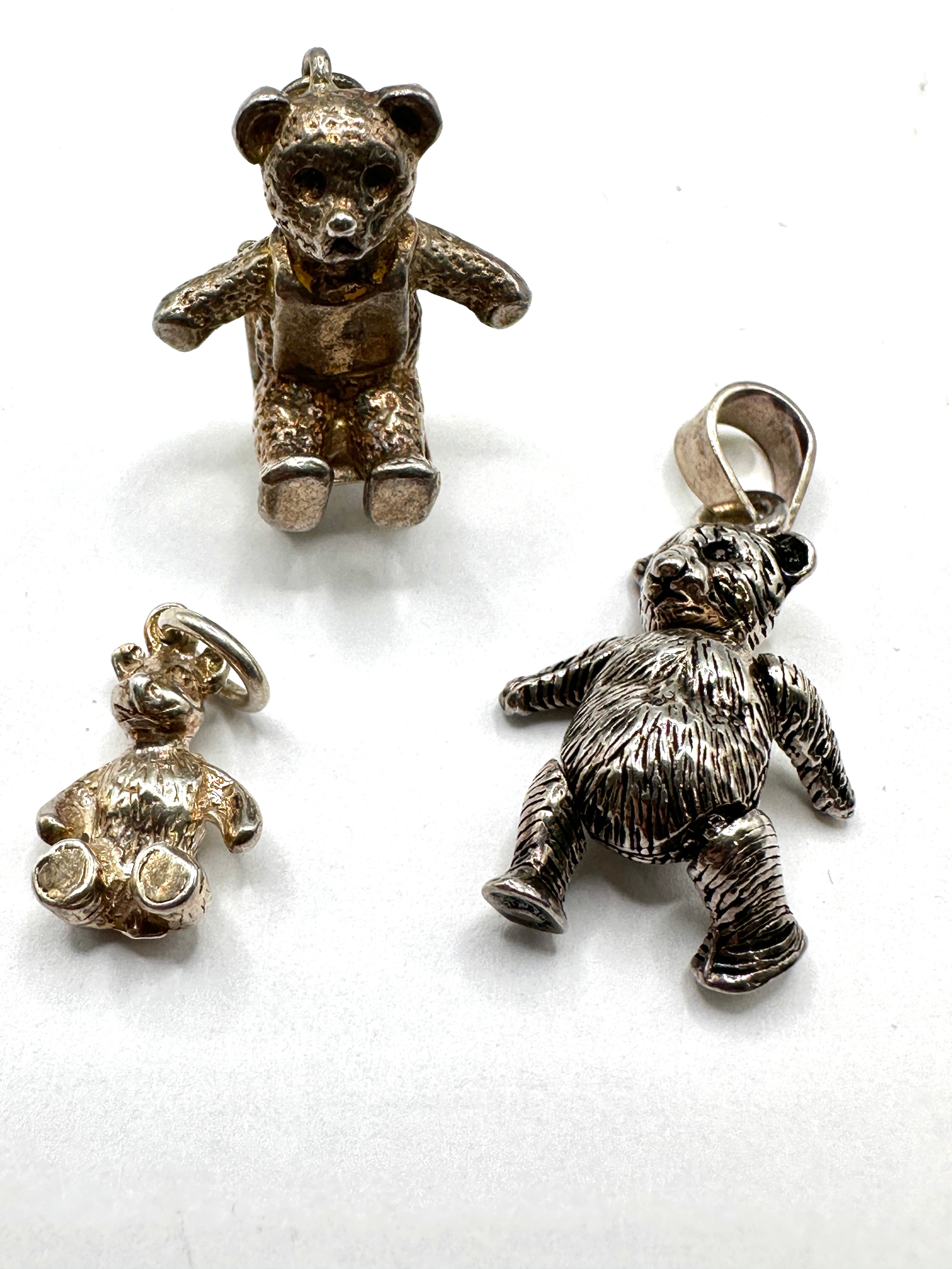 A group of three three-dimensional figural pendants, each depicting a teddy bear and crafted from 925 silver. The items vary in size and individual posture; one larger bear is in a crawling or standing position, a medium-sized bear is in a seated position, and a smaller seated bear is also present. All three feature integrated loops or bales for suspension. The smallest bear includes four small, clear embellishments on its torso. The items are consistent with the market description of movable or articulated teddy bear charms. No discernible text, hallmarks, or manufacturer’s marks are visible.