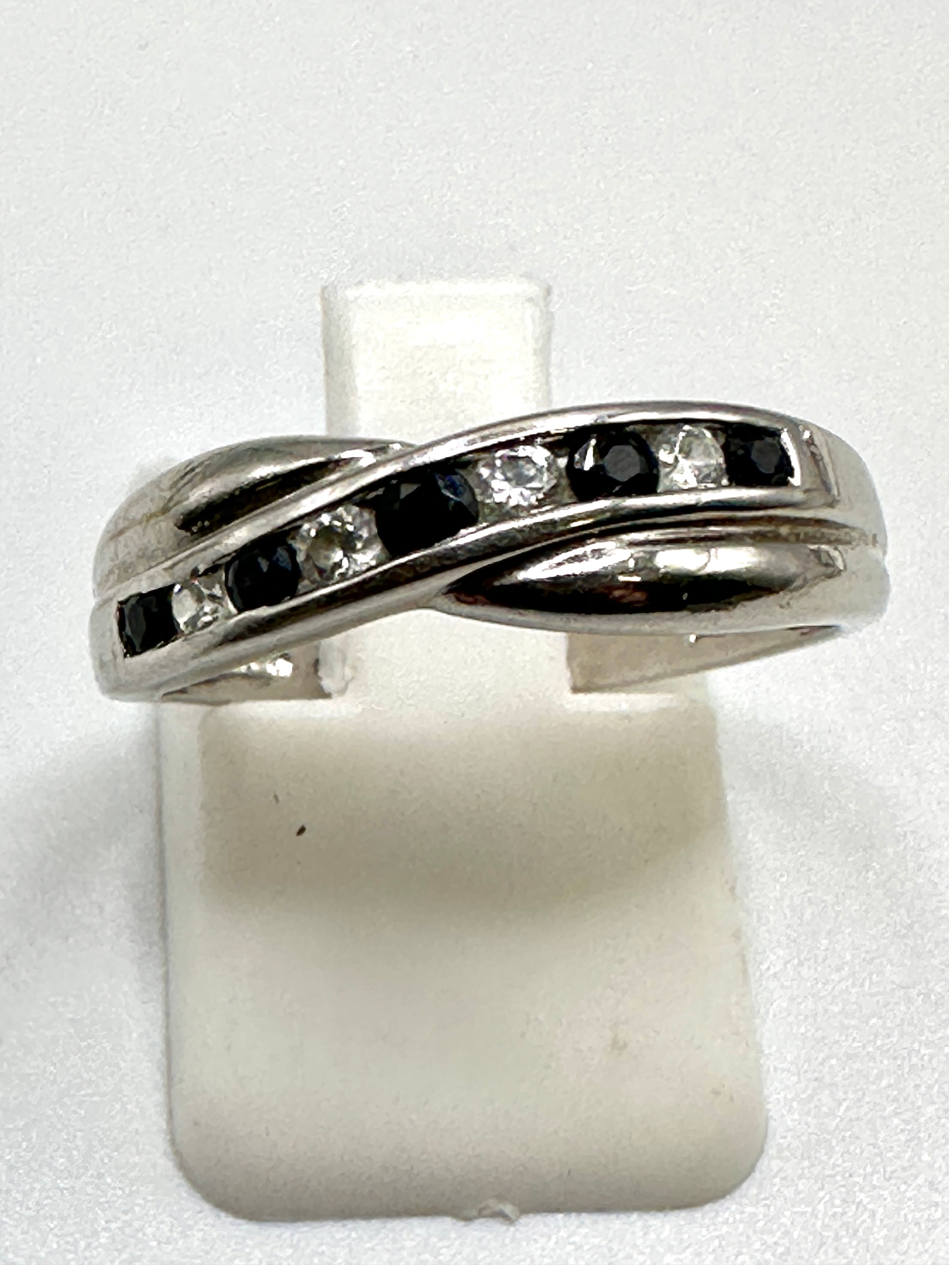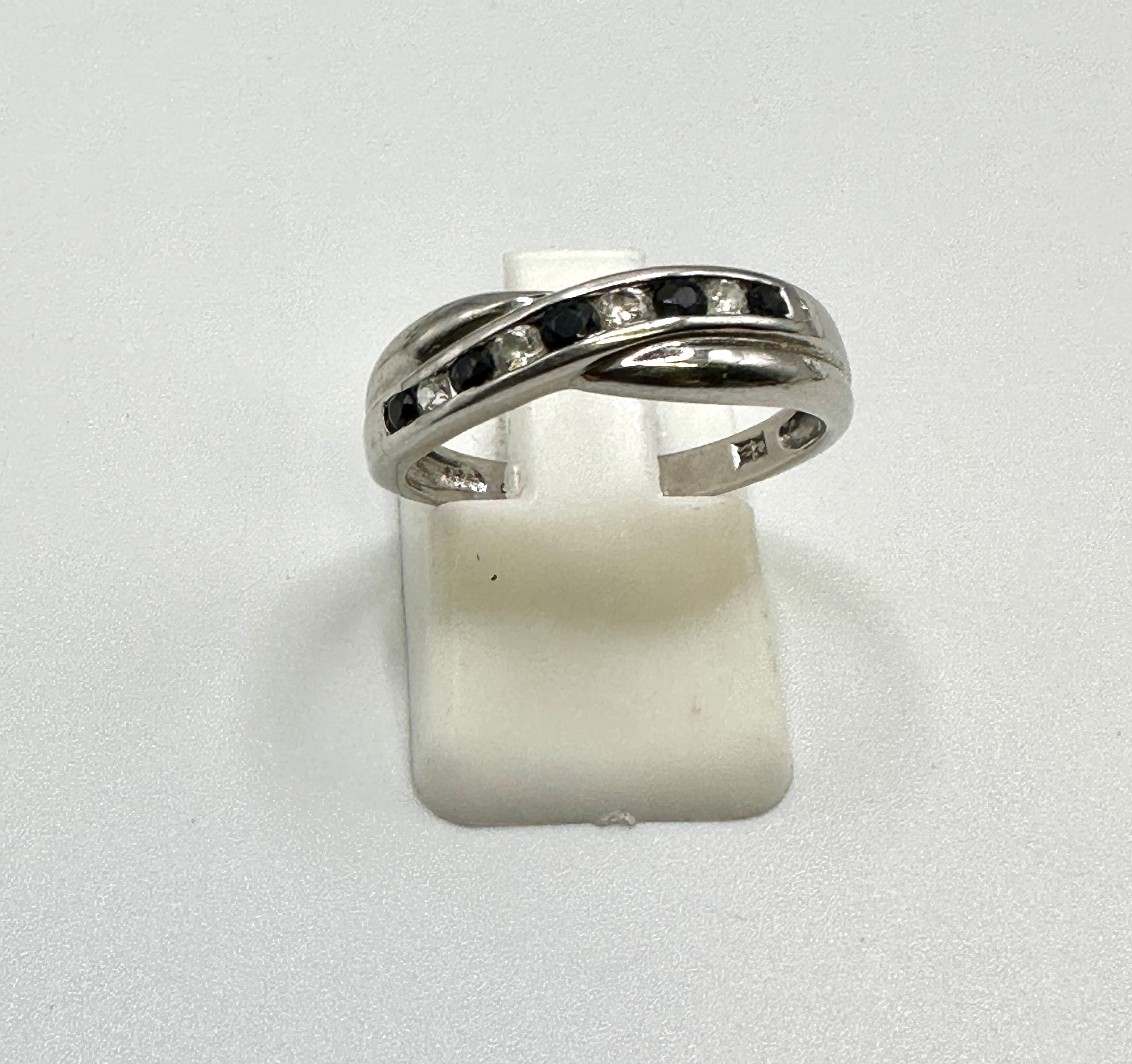 A contemporary-style bypass ring crafted from 9k white gold, featuring two intertwining bands. One band is channel-set with a row of alternating small, round sapphires and paste stones.